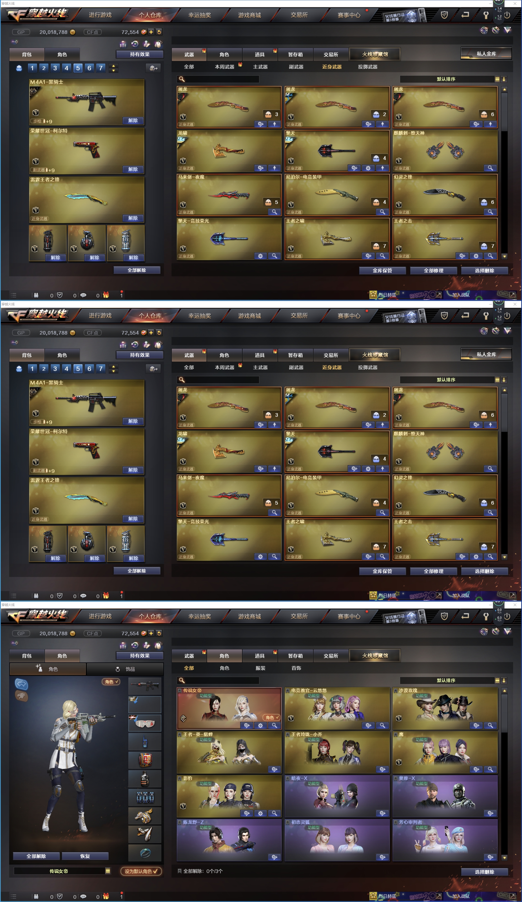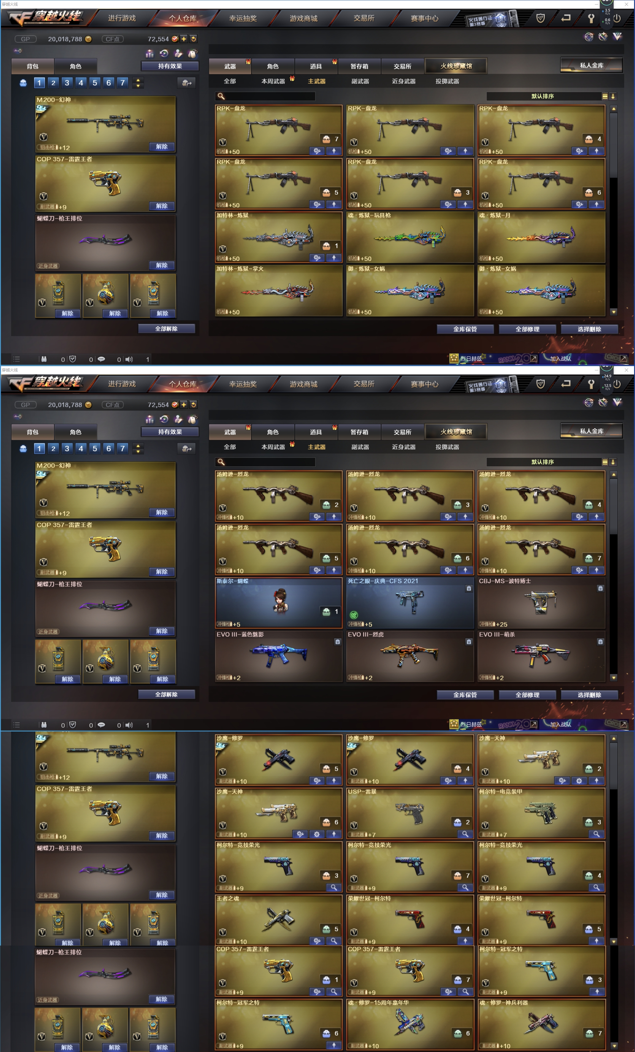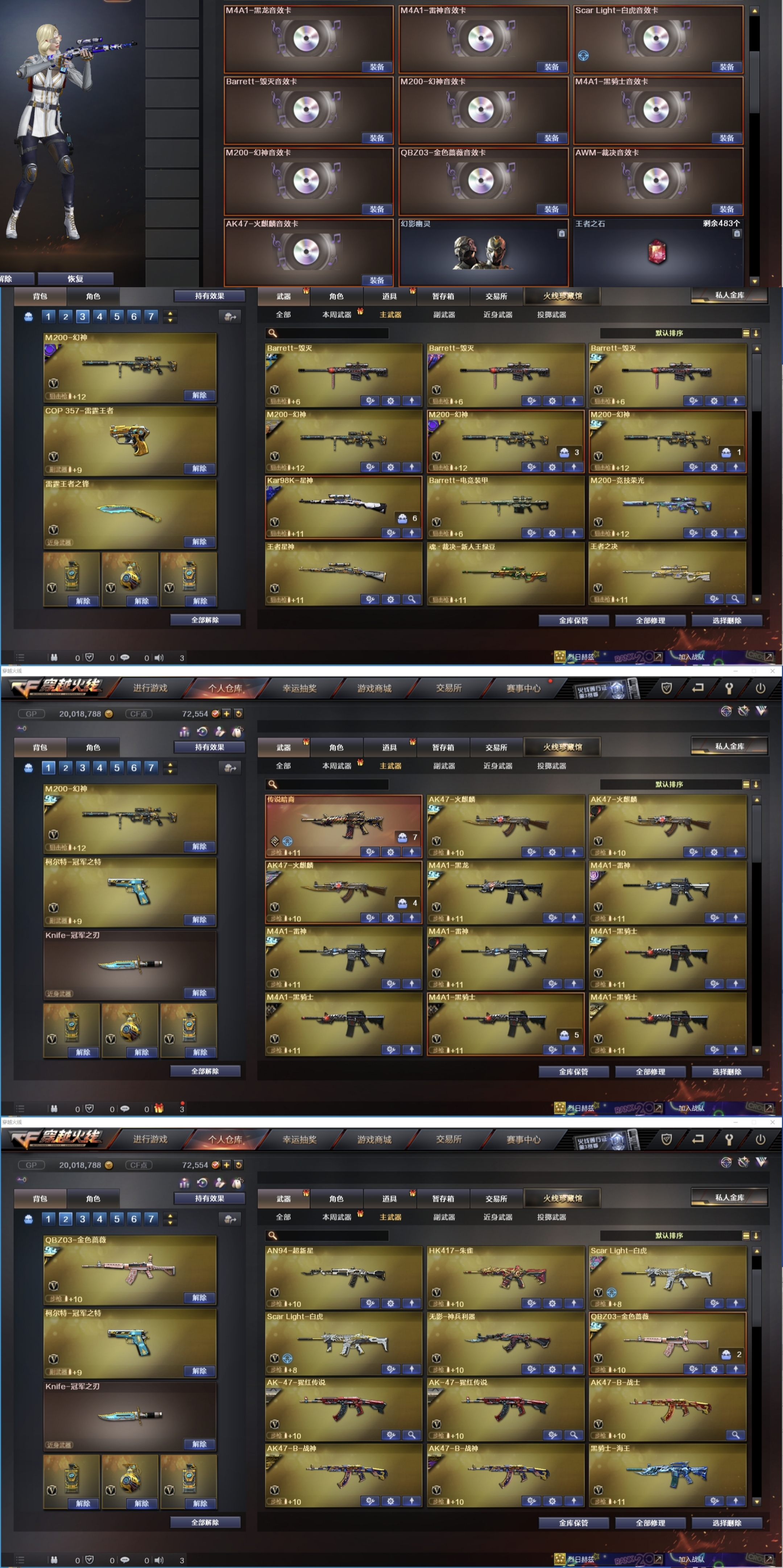 6烈龙+斯泰尔-蝴蝶,6盘龙+炼狱,4防沙漠玫瑰;USP-雷暴,荣耀世冠-柯尔特,柯尔特-冠军之特,Knife-冠军之刃,沙漠玫瑰,传说女帝,电竞教官-云悠悠,