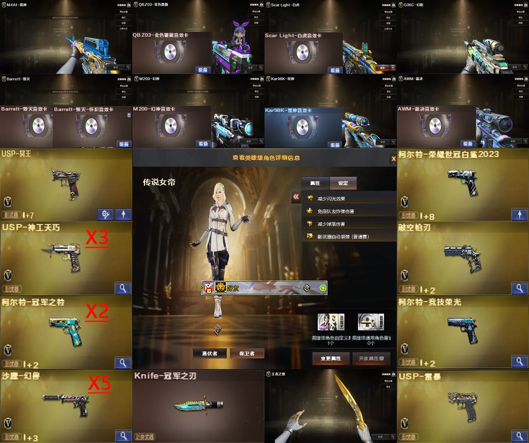 请勿随意退游戏,以防触发身份验证。乱退排位者。必将拉黑!;USP-雷暴,柯尔特-无冕之王,柯尔特-荣耀世冠白鲨2023,柯尔特-冠军之特,Knife-冠军之刃,传说女帝,电竞教官-云悠悠,