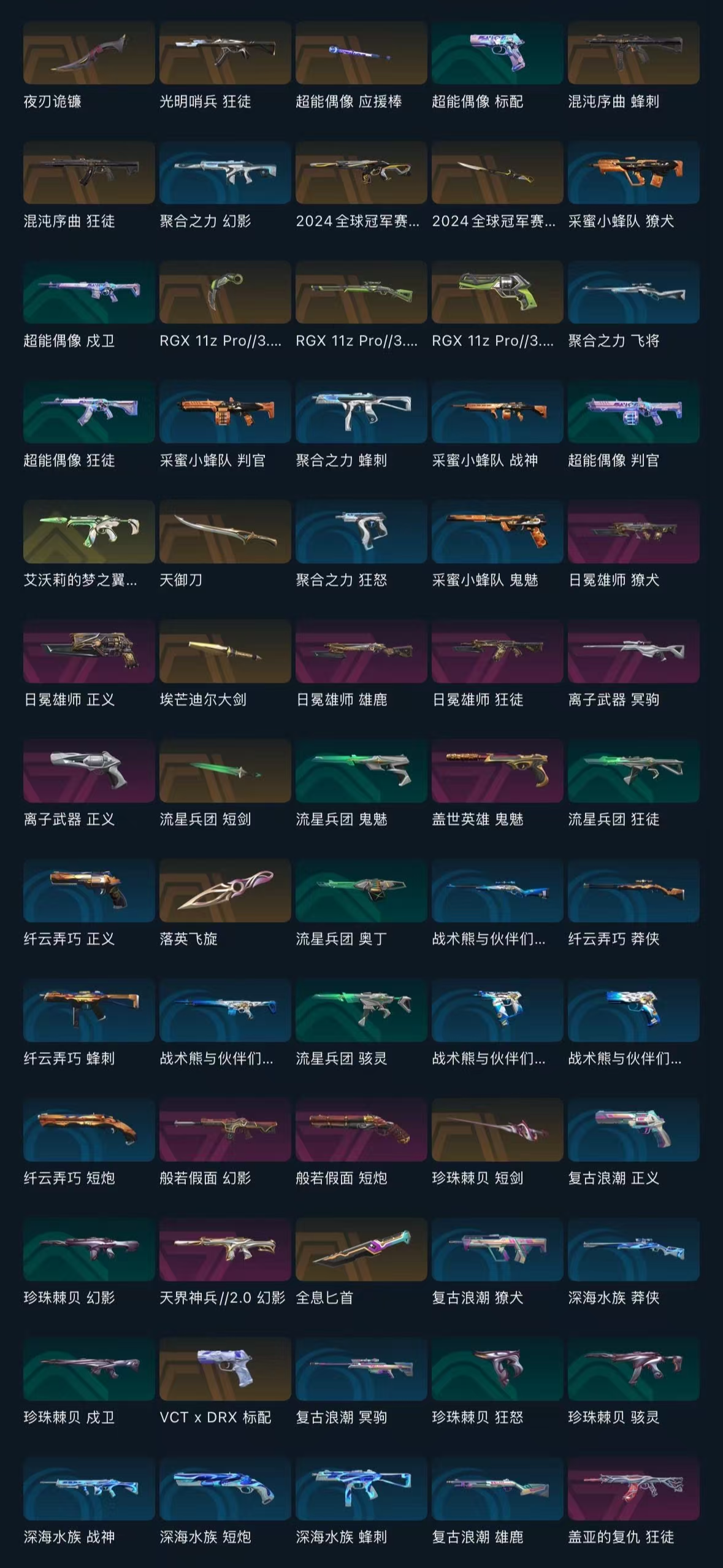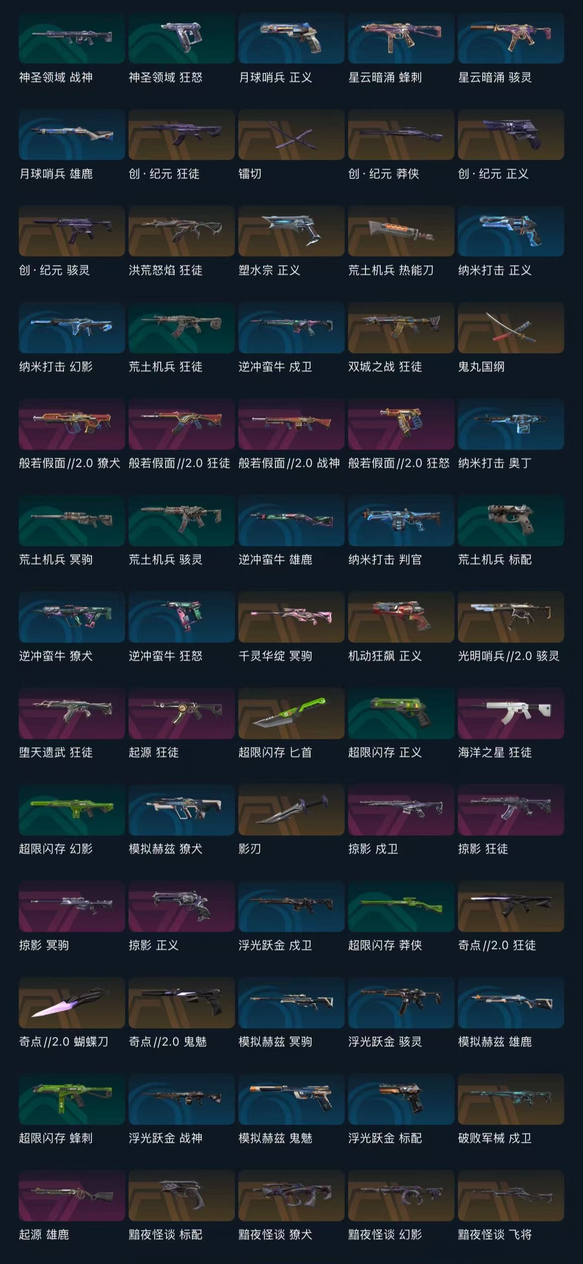 【拥有霰弹枪】起源-雄鹿,诡秘蛇影-判官,超能偶像-判官,幻语魔咒-雄鹿,甜蜜战术-判官,月球哨兵-雄鹿,逆冲蛮牛-雄鹿,纳米-判官,模拟赫兹-雄鹿,采蜜小蜂队-判官,复古浪潮-雄鹿,萌彩剪影-判官,彩梦之城-雄鹿,数码咒术-判官, 【拥有手枪】VCT-x-DRX-标配,塑水宗-正义,机动狂飙-正义,奇点-正义,781-A协议-正义,盖世英雄-鬼魅,盖亚的复仇-鬼魅,冰点凝冻-标配,般若假面-短炮,离子武器-正义,阿特拉斯指挥部-标配,日耀风暴-正义,诡秘蛇影-鬼魅,神圣领域-狂怒,荒土机兵-标配,超限闪存-正义,超能偶像-标配,流星兵团-鬼魅,珍珠棘贝-狂怒,钢轨卫士-短炮,钢轨卫士-狂怒,沙尘幻旅-正义,弧光异彩-短炮,合金战车-正义,幻语魔咒-狂怒,甜蜜战术-鬼魅,末日之翼-短炮,折光棱晶-标配,传奇制造-正义,月球哨兵-正义,纳米-正义,逆冲蛮牛-狂怒,模拟赫兹-鬼魅,浮光跃金-标配,聚合之力-狂怒,采蜜小蜂队-鬼魅,纤云弄巧-正义,战术熊与伙伴们-狂怒,战术熊与伙伴们-标配,纤云弄巧-短炮,复古浪潮-正义,深海水族-短炮,光导纤维-鬼魅,光导纤维-标配,萌彩剪影-狂怒,胡桃狂想-鬼魅,彩梦之城-标配,信手涂鸦-鬼魅,花漾粉红-狂怒