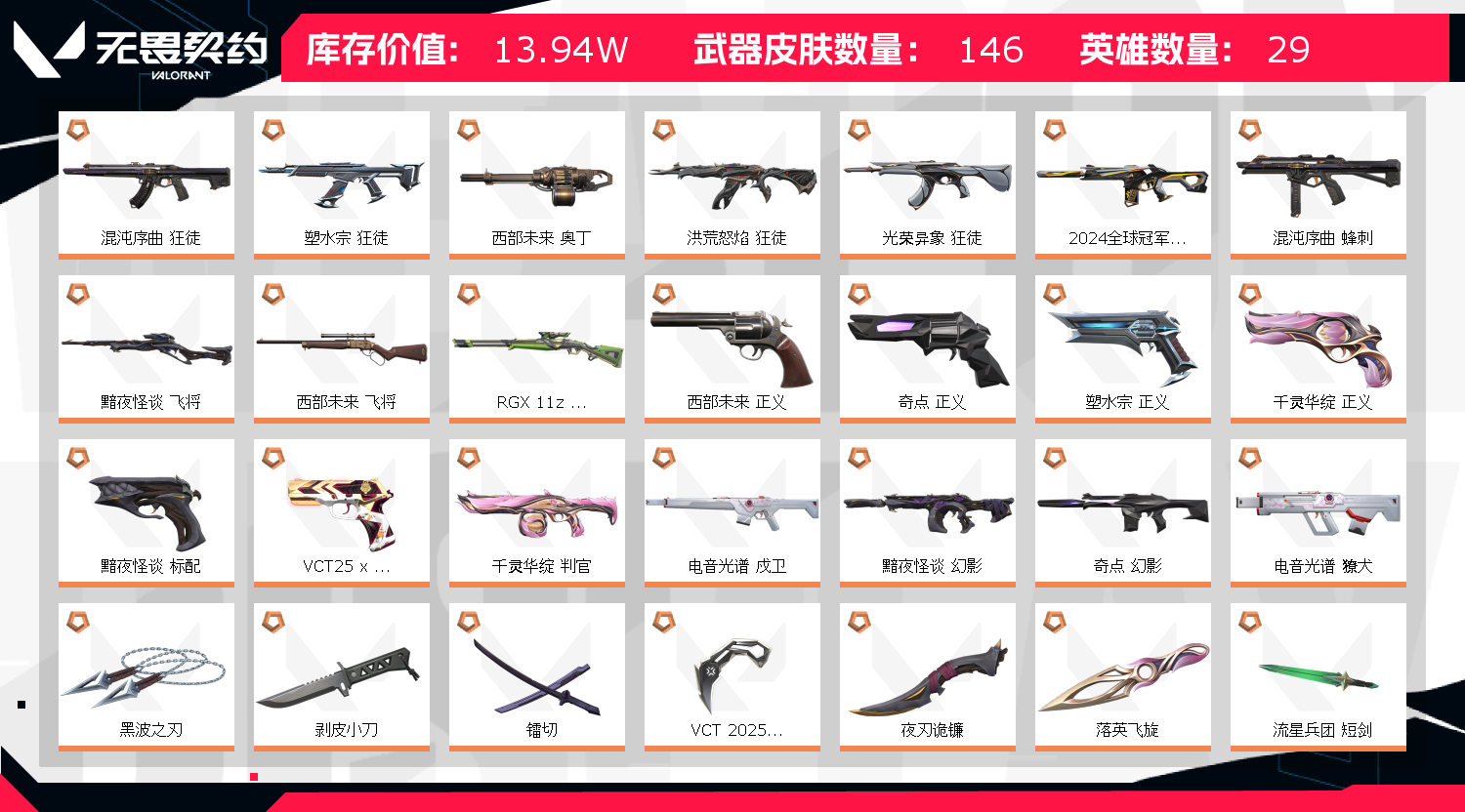冻结请点击登号器解冻按钮协助解冻 健康游戏,违规拉黑;西部未来 奥丁,黑波之刃,剥皮小刀,镭切,VCT 2025 爪刀,盖亚的复仇 狂徒,洪荒怒焰 狂徒,