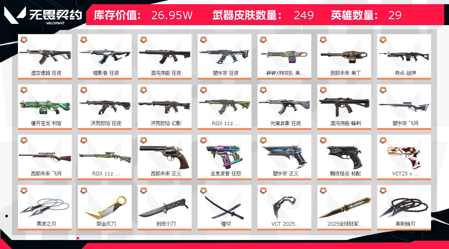 首页 > 租号大厅 > 无畏契约-wegame > wegame/wegame > 荆棘玫瑰刀,26VCT,掠夺3.0,27w库存5400R点,挂机拉黑,冻结账户,此号3w元封号必起诉