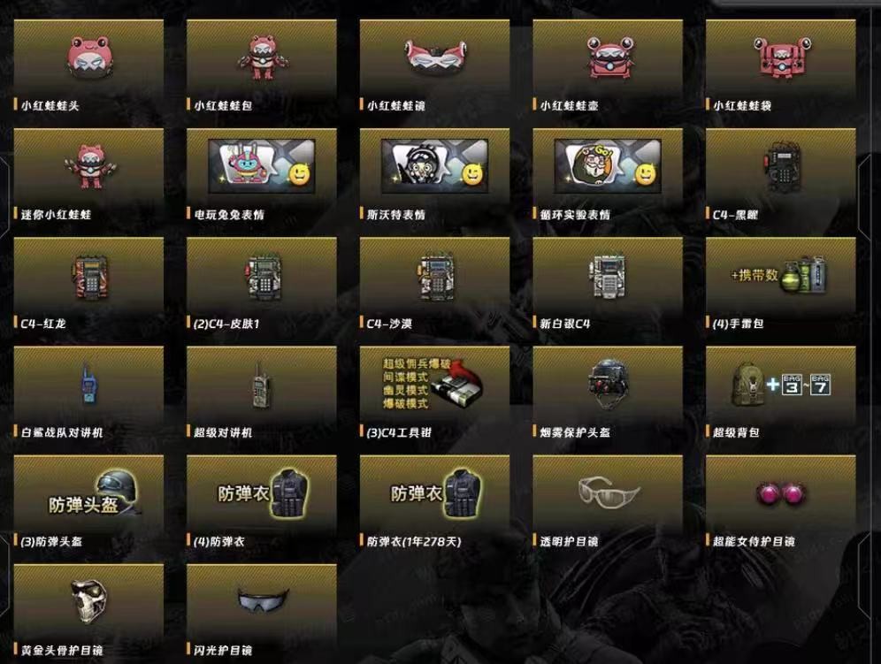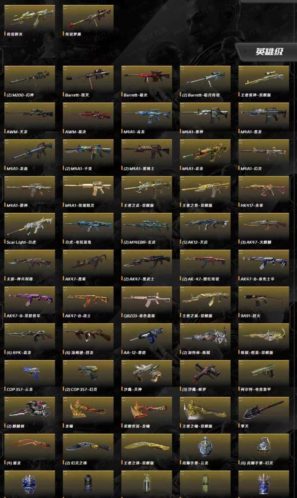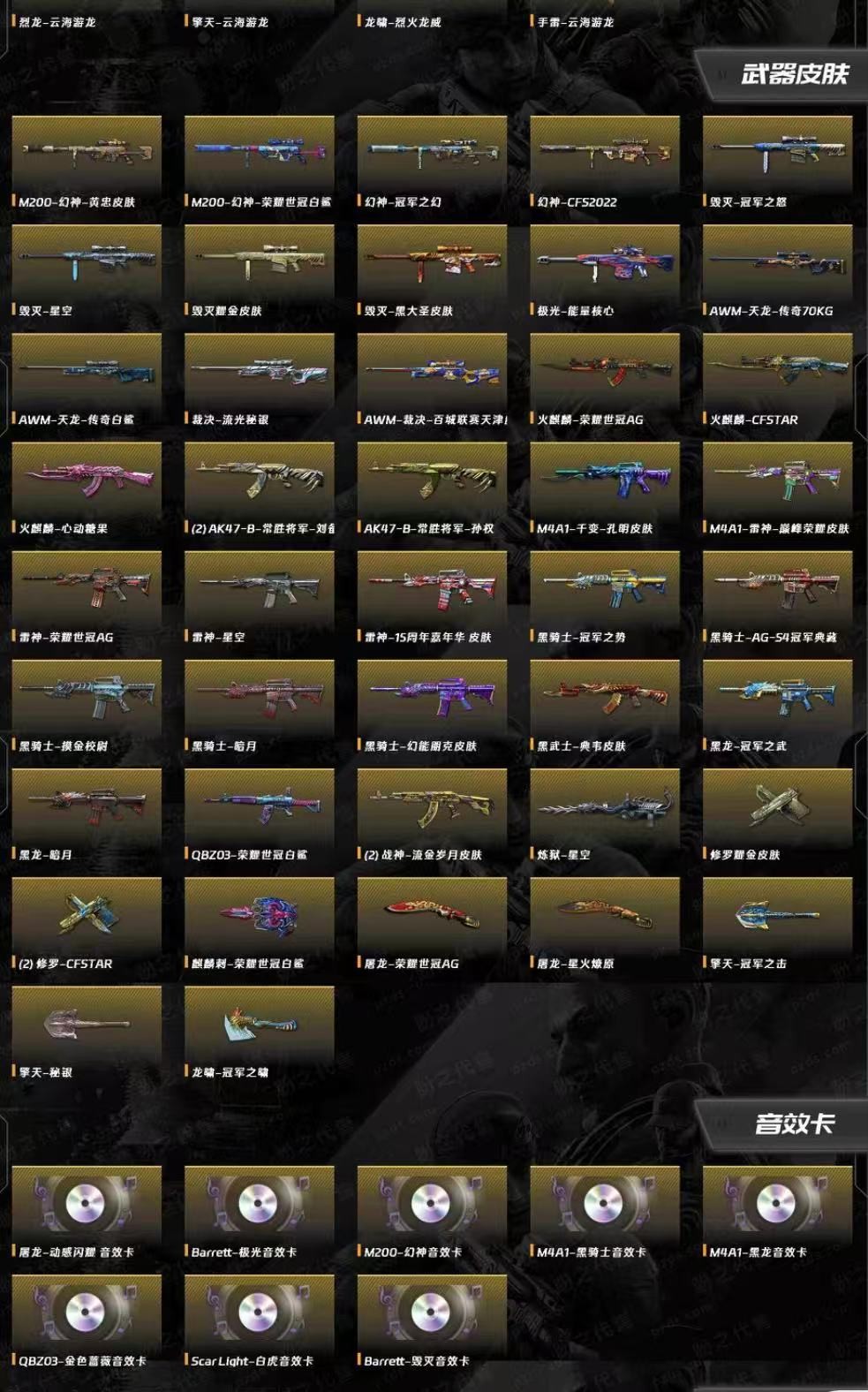 爆破生化一体号,泡泡象,三传说武器,目前无蝴蝶刀,小红蛙套装,4防隼,2幻神4皮1音效,白虎1音效,6鬼,6盘,6烈;Knife-冠军之刃,隼,RPK-盘龙,QBZ03-金色蔷薇,M200-幻神,Scar Light-白虎,传说圣谕,
