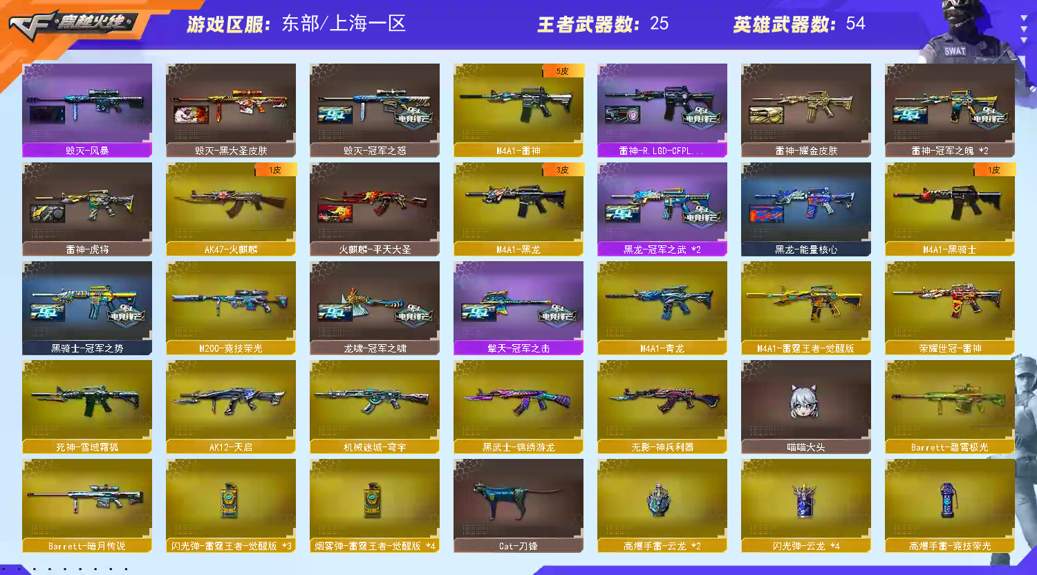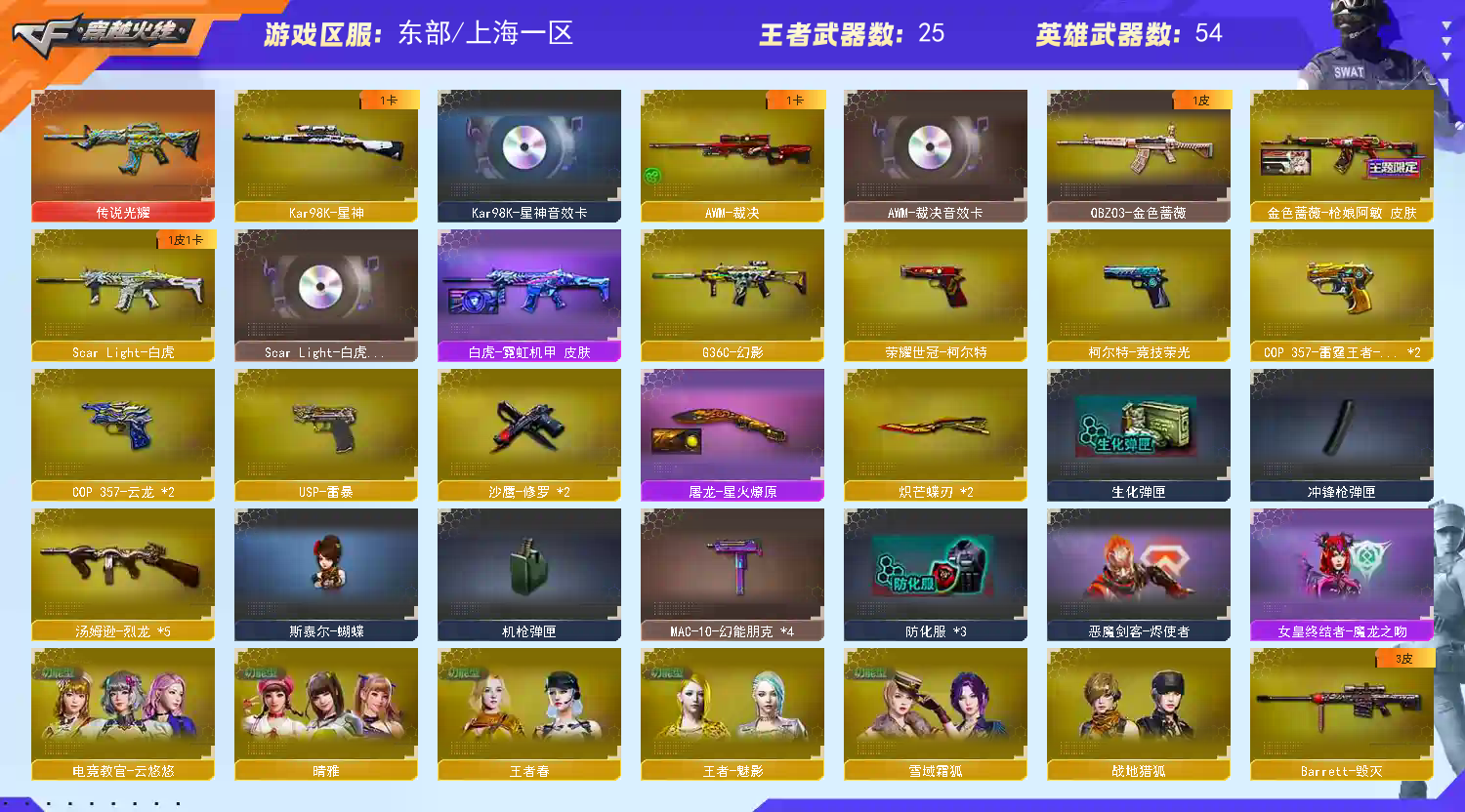 王者武器:炫金火麒麟;烟雾弹-雷霆王者;王者玉锋;王者雷怒;闪光弹-雷霆王者;高爆手雷-雷霆王者;Barrett-雷霆王者-觉醒版;COP 357-雷霆王者-觉醒版;M4A1-雷霆王者-觉醒版;烟雾弹-雷霆王者-觉醒版;王者之光-觉醒版;王者之刺-觉醒版;王者之势-觉醒版;王者之心-觉醒版;王者之翼-觉醒版;闪光弹-雷霆王者-觉醒版;雷霆王者之锋-觉醒版;炫金超新星 英雄武器:AK12-天启;M4A1-黑骑士;屠龙;龙啸;麒麟刺;AK47-火麒麟;Barrett-毁灭;汤姆逊-烈龙;沙鹰-修罗;M4A1-雷神;M4A1-黑龙;9A91-烈火;USP-雷暴;M200-竞技荣光;柯尔特-竞技荣光;高爆手雷-竞技荣光;Scar Light-白虎;传说光耀;高爆手雷-夜魔;马来剑-夜魔;闪光弹-夜魔;烟雾弹-夜魔;炽芒蝶刃;无影-神兵利器;Barrett-暗月传说;QBZ03-金色蔷薇;G36C-幻影;超新星-热带奇洋;Kar98K-星神;黑武士-锦绣游龙;龙啸-热带奇洋;手雷-热带奇洋;COP 357-云龙;高爆手雷-云龙;闪光弹-云龙;擎天;AWM-裁决;M4A1-青龙;荣耀世冠-柯尔特;荣耀世冠-雷神 装饰品:火麒麟-CF STAR;黑龙-能量核心;兔子泰迪娃娃;金色幸运鼠玩偶;金色蔷薇-枪娘阿敏 皮肤;雷神-R.LGD-CFPLS18冠军;毁灭-冠军之怒;火麒麟-平天大圣;曼陀罗玩偶;雷神-虎将;黑龙-冠军之武;黑骑士-冠军之势;火麒麟玩偶;雷神-耀金皮肤;白虎-霓虹机甲皮肤;击杀图标-16周年限定;幻神-周瑜皮肤;屠龙-星火燎原;擎天-冠军之击;毁灭-风暴;毁灭-黑大圣皮肤;雷神-冠军之魄;龙啸-冠军之啸;噩梦击杀图标 角色:复仇者;幻影;猎狐者;活力灵狐;兰;嘉年华灵狐;木兰;游珑儿;新曼陀罗;救世主;电竞教官-云悠悠;晴雅;夜玫瑰-X;圣诞潘多拉-X;剑齿虎-X;精英部队;斯沃特精英;新灵狐者;兰-限定版;王者-魅影;兔囡囡;王者-春;艾比;幽 道具:(极限战斗背包);(AK47-麒麟紫橙光效);(M4A1-雷神蓝粉色光效);炫彩背包;烟雾保护头盔;闪光护目镜;防弹衣;防弹头盔;手雷包;C4工具钳;防化服;幽灵之刃;夺命之镰;变异宝贝;灵魂忍者;疯狂宝贝;迷雾幽灵;生化弹匣;M4A1-雷神 紫橙光效;彩蝶之翼;炫彩背包-诺拉;Scar Light-白虎音效卡;特殊水壶-海滩派对;变相怪杰;绿色巨人;兔子发带;京剧背包;Kar98K-星神音效卡;超级护目镜;AWM-裁决音效卡;全能枪王黄金面具;USP-雷暴,荣耀世冠-柯尔特,炽芒蝶刃,电竞教官-云悠悠,晴雅,QBZ03-金色蔷薇,G36C-幻影,