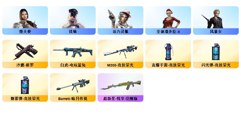 幻神荣光号/竞技荣光M200/白虎电玩蓝兔/牛牛AK/猫猫手套/竞技荣光投掷×1套/Barrett暗月传说/觉醒超新星/竞魂无影/赤狱骑士/乔伊教练/三防零纪元