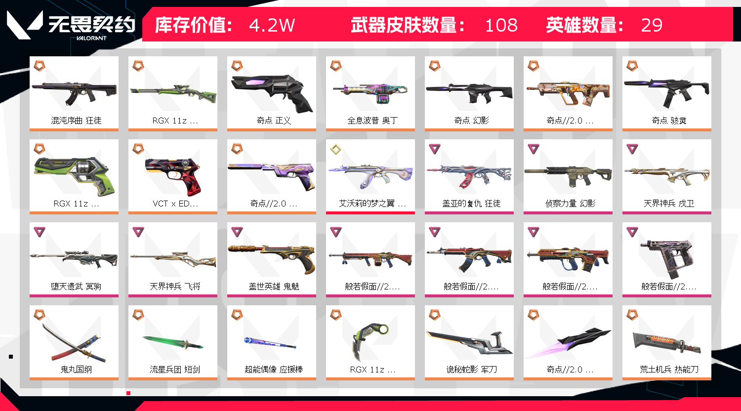 首页 > 租号大厅 > 无畏契约-wegame > wegame/wegame > 别(别挂机))极品下三段号4.2万库存 混沌盖亚恶鬼套奇点套显卡套 全皮肤