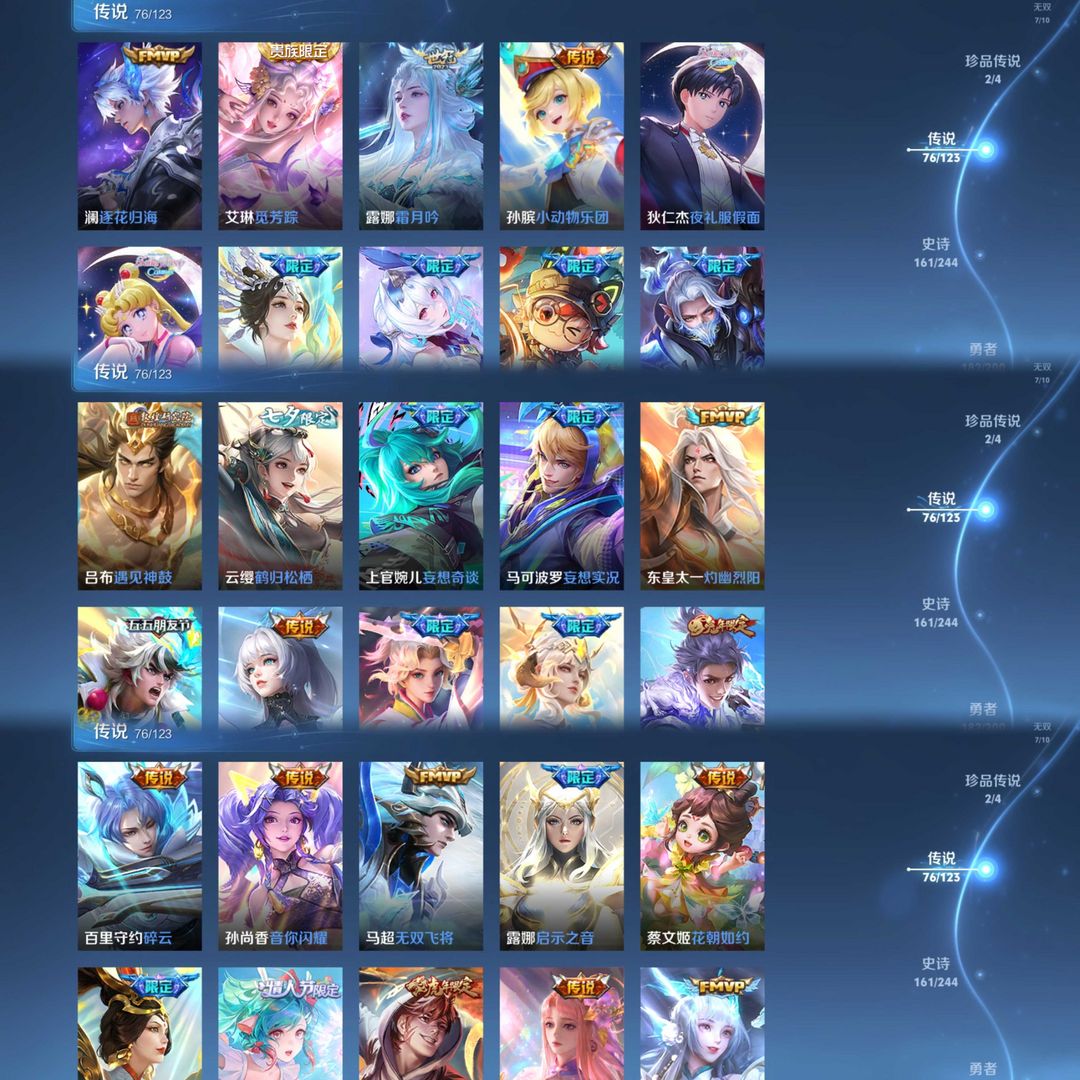 76传说/天幕/蛇限满/无双澜小乔妲己公孙离/白虎志/至尊宝/夜色晚礼服/详细段位可以看下面营地,玩