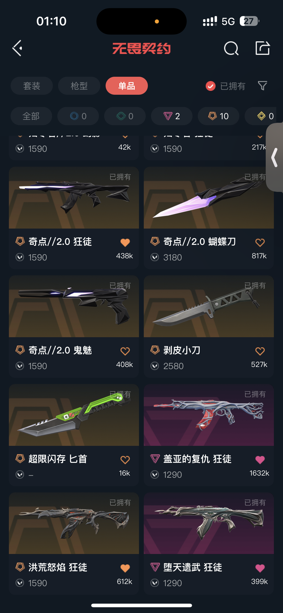 奇点正义,光荣ak,盖亚ak,流脓ak,弃王奇点归零ak。侦查m4,黑波之刃。剥皮小刀。奇点蝴蝶刀。