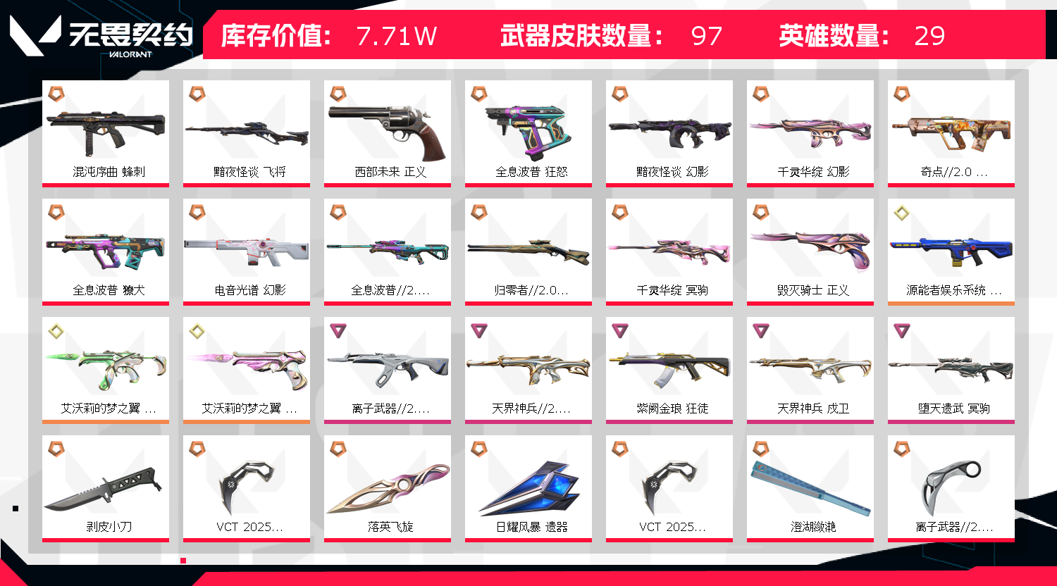 郑重声明: !!!!!因无畏契约检测严格,为防止后台插件导致封号,请务必重启电脑!!!!本人商户多年,所属账号已在派出所备案,若出现 账号封禁/毁号等情况,会马上与平台联系,平台会报警处理!请租客文明游戏,不要开挂或挂机! 1.登陆界面稍等2分钟会上去(自动登录)老板不要着急,一次不行多来几次wegame界面要耐心等2分钟 2.密令会自动输入如果一次不成功多来几次 3..进入wegame后到弹短信验证处,关闭掉,重新下载无畏契约这个游戏即可成功上号,记住。这个方法百分百上号成功!就是进入wegame重新下载无畏契约游戏 !!!百分百成功!! 4.请及时续租不要挂机,到时不下线,但是下一个会挤号导致挂机,所以请及时续租,导致禁赛的一律拉黑 5.祝老板玩的愉快,喜欢可以收藏关注 ! 开挂必追究,不拿到赔偿不罢休! 如果上号正在游戏中,是上个租客到时不下线导致的,不是号主在玩,请帮忙打完这局, 谢谢了,为了防止顶号,请您及时续租获得更好的游戏体验❤️;剥皮小刀,VCT 2025 爪刀,天界神兵//2.0 幻影,源能者娱乐系统 幻影,紫阙金琅 狂徒,天界神兵 戍卫,离子武器//2.0 狂徒,