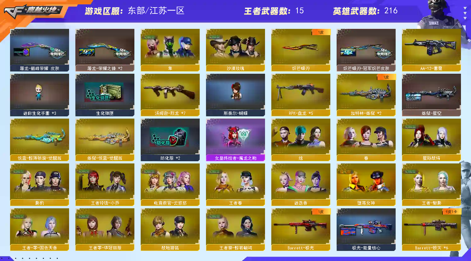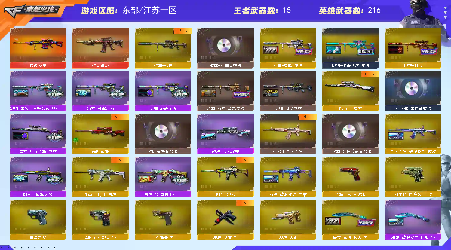 排位请打完 【幻神皮肤】欧欧 星火小队 冠军之幻 周瑜 星耀 巅峰荣耀 丹凤 黄忠 【其它皮肤】星神巅峰荣耀 裁决流光秘银 冠军之微 G36破浪 【重要武器】幻神 星神 裁决 G36C幻影 白虎 QBZ03 7烈 斯泰尔蝴蝶 3加特林 【音效卡】M200-幻神音效 星神音效 裁决音效卡 金色蔷薇音效 毁灭音效 雷神音效 黑骑士音效 火麒麟音效 4加特林,B背包生化全装,生化角色属性已开 雷暴套装 电竞装甲套 雷霆套等226V;USP-雷暴,荣耀世冠-柯尔特,炽芒蝶刃,沙漠玫瑰,隼,电竞教官-云悠悠,RPK-盘龙,