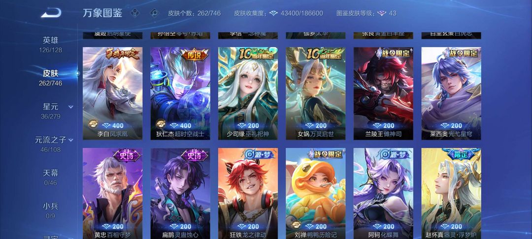 v10、12水539皮、死亡执政官、刘备星传说时之思念、小兵皮肤大耳狗甜茶、瑶无双真我赫兹、愿照·九州拓、怪盗基德、画中仙、至尊宝、凤求凰、神威、天魔缭乱