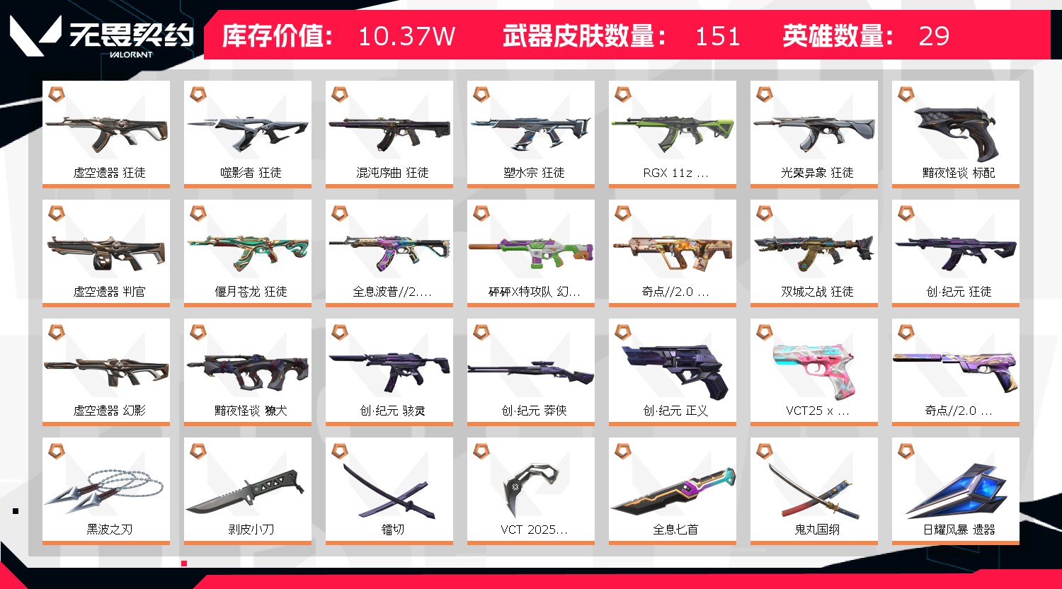1;艾沃莉的梦之翼 奥丁,黑波之刃,剥皮小刀,镭切,VCT 2025 爪刀,盖亚的复仇 狂徒,虚空遗器 狂徒,