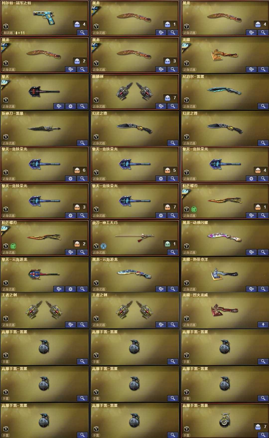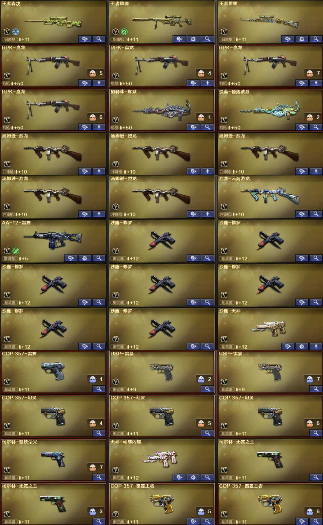 【英雄武器】:【M4A1-死神-1,AK12-天启-1,AN94-超新星-1,M4A1-千变-1,M4A1-黑骑士-3,M4A1-玫瑰精灵-1,AK47-黑武士-1,屠龙-4,龙啸-1,AK47-无影-1,麒麟刺-1,AK47-火麒麟-2,AWM-天龙-1,Barrett-毁灭-1,汤姆逊-烈龙-5,Barrett-极光-3,RPK-盘龙-4,沙鹰-修罗-7,加特林-炼狱-1,沙鹰-天神-1,M4A1-雷神-5,M4A1-黑龙-1,9A91-烈火-1,M200-幻神-1,屠龙-云海游龙-1,M4A1-雷霆-2,USP-雷暴-2,烈龙-云海游龙-1,高爆手雷-雷暴-7,烟雾弹-雷霆-7,雷霆之怒-1,闪光弹-雷霆-9,闪光弹-雷暴-7,烟雾弹-雷暴-7,斩神刀-雷暴-1,M14EBR-玄武-1,M200-竞技荣光-1,传说夜影-1,幻灵之锋-2,擎天-竞技荣光-5,柯尔特-冠军之特-1,柯尔特-竞技荣光-1,烟雾弹-竞技荣光-6,闪光弹-竞技荣光-6,高爆手雷-竞技荣光-6,Scar Light-白虎-1,炽芒蝶刃-2,高爆手雷-雷霆-8,唐刀-神工天巧-1,无影-神兵利器-1,AA-1;USP-雷暴,柯尔特-无冕之王,传说幽冥,柯尔特-冠军之特,炽芒蝶刃,Knife-冠军之刃,传说影煞,