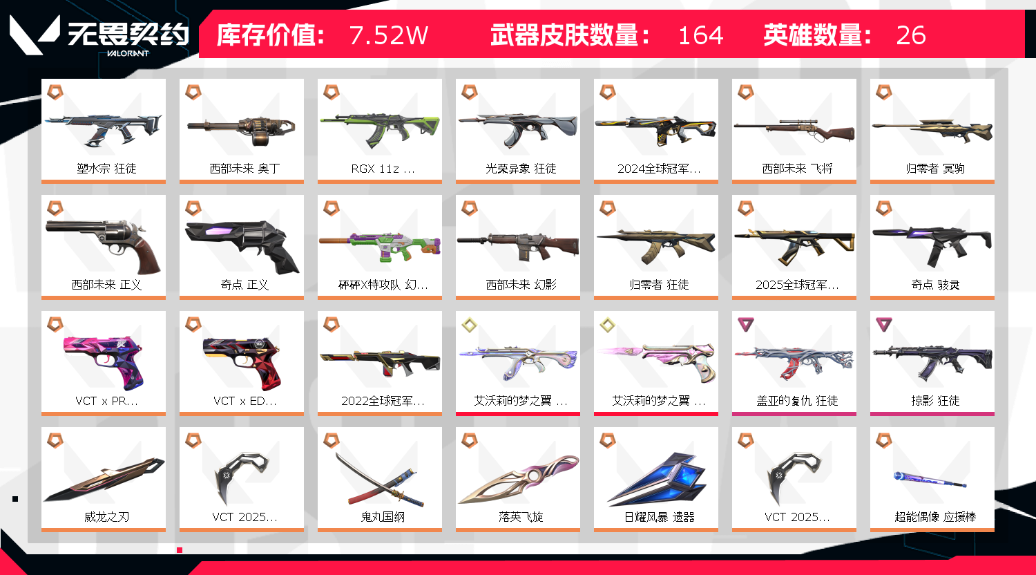 后续出新皮肤会购入,喜欢就收藏欢迎回头客 有时候因异地登录被冻结导致不能上号就稍等2~5分钟,如果号主看到了会解冻 炸鱼炸太狠或者不当发言导致竞赛限制了一律拉黑 郑重声明: !!!!!因无畏契约检测严格,为防止后台插件导致封号,请务必重启电脑!!!!本人商户多年,所属账号已在派出所备案,若出现 账号封禁/毁号等情况,会马上与平台联系,平台会报警处理!请租客文明游戏,不要开挂或挂机! 1.登陆界面稍等2分钟会上去(自动登录)老板不要着急,一次不行多来几次wegame界面要耐心等2分钟 2.密令会自动输入如果一次不成功多来几次 3..进入wegame后到弹短信验证处,关闭掉,重新下载无畏契约这个游戏即可成功上号,记住。这个方法百分百上号成功!就是进入wegame重新下载无畏契约游戏 !!!百分百成功!! 4.请及时续租不要挂机,到时不下线,但是下一个会挤号导致挂机,所以请及时续租,导致禁赛的一律拉黑 5.祝老板玩的愉快,喜欢可以收藏关注 ! 开挂必追究,不拿到赔偿不罢休! 如果上号正在游戏中,是上个租客到时不下线导致的,不是号主在玩,请帮忙打完这局, 谢谢了,为了防止顶号,请您及时续租获得更好的游戏体验❤️;西部未来 奥丁,威龙之刃,VCT 2025 爪刀,盖亚的复仇 狂徒,掠影 狂徒,侦察力量 幻影,紫阙金琅 狂徒,