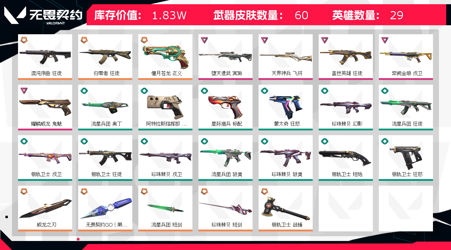 首页 > 租号大厅 > 无畏契约-wegame > wegame/wegame > 💥四狂徒多单买精品💥混沌/归零者/猴子/威龙狂徒/💥紫金戍卫/堕天冥狙💥威龙之刃💥冻结秒解