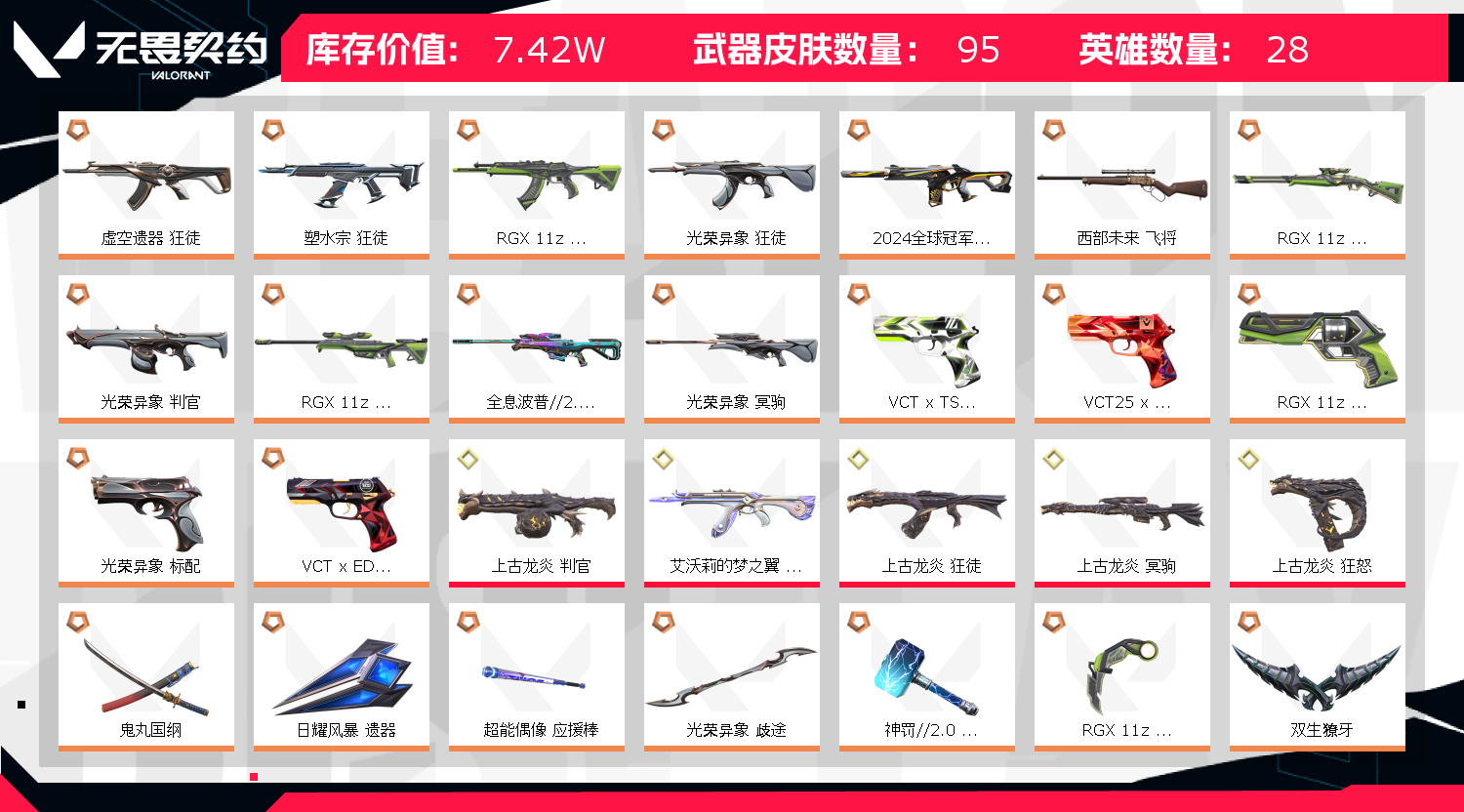 首页 > 租号大厅 > 无畏契约-wegame > wegame/wegame > 可排黄金🔥9赋能25神话挂饰极品号🔥异象套24冠🔥冻结秒解请稍等🔥主战皮全10刀10ak