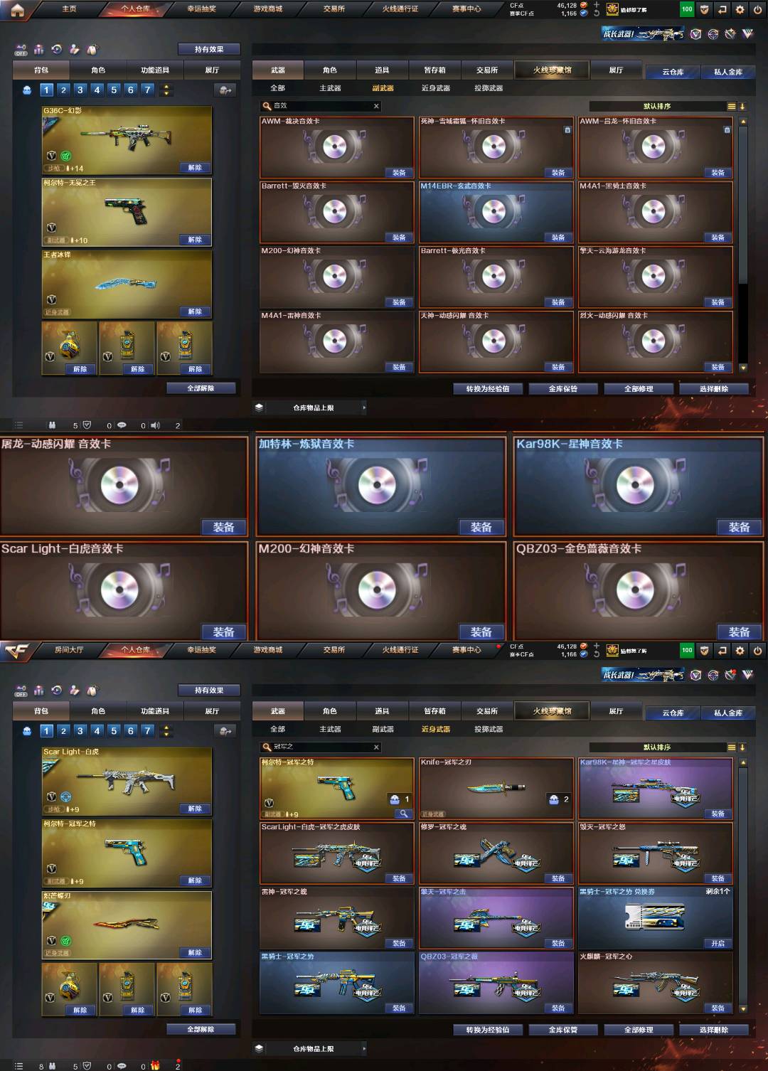 特殊装备有:幻神(宠儿、星火小队、两个白鲨、heartshot 、电流骇客、cfs2022音效卡) 星神(冠军之星、璀璨、枪娘、音效卡)、传说灵眸、传说幽瞳、传说破晓*2 QBZ03-金色蔷薇(冠军之薇、世冠白鲨2个、虎鱼、heartshot、cfs2024、破浪逐光音效卡) AK47-火麒麟(横秒之巅、传奇even、CFS2018、冠军之心) M4A1-雷神(巅峰荣耀、宠儿、念旧、冠军之魄、CFS2019、音效卡) Scar-Light-白虎(冠军之虎、暗星、巅峰荣耀音效卡) Barrett-毁灭(CFS2018、SV冠军、冠军之怒、荣耀之怒、AG、音效卡) 屠龙(世冠AG、荣耀、星火燎原、春桃) 擎天(冠军之击)、麒麟刺(荣耀世冠-白鲨、萌杀、月) 加特林-炼狱(虎牙、斗鱼、玩具、月、音效卡) 传说破晓炽芒蝶刃x2(冠军赤芒、世冠白鲨) QBZ03-天罚、王者破空、无冕之王、世冠白鲨柯尔特、冠军之特、冠军之刃、USP-雷暴、USP-神工天巧、王者雷霆cop、炼狱-迷你小刚、斯太尔-蝴蝶+枪娘暗刃、毒蜂、双面神、清道夫、CAT、鲨臂、龙宝mac10、全弹匣、王者全觉醒,22副武器、11套雷,8战队炫彩背包、十战队击杀图、5生化皮肤。 角色有:传说隐煞、隼、云悠悠、荒漠琉璃、晴雅、雨墨兰、月兔特工、葵、迷迭香、樱、炫、狐影、王者春、王者零、王者魅影、王者迷迭香、王者潘多拉、王者瞳闭花羞月,王者樱热浪之夏。;USP-雷暴,柯尔特-无冕之王,USP-雷暴王者,柯尔特-荣耀世冠白鲨2023,柯尔特-冠军之特,炽芒蝶刃,Knife-冠军之刃,