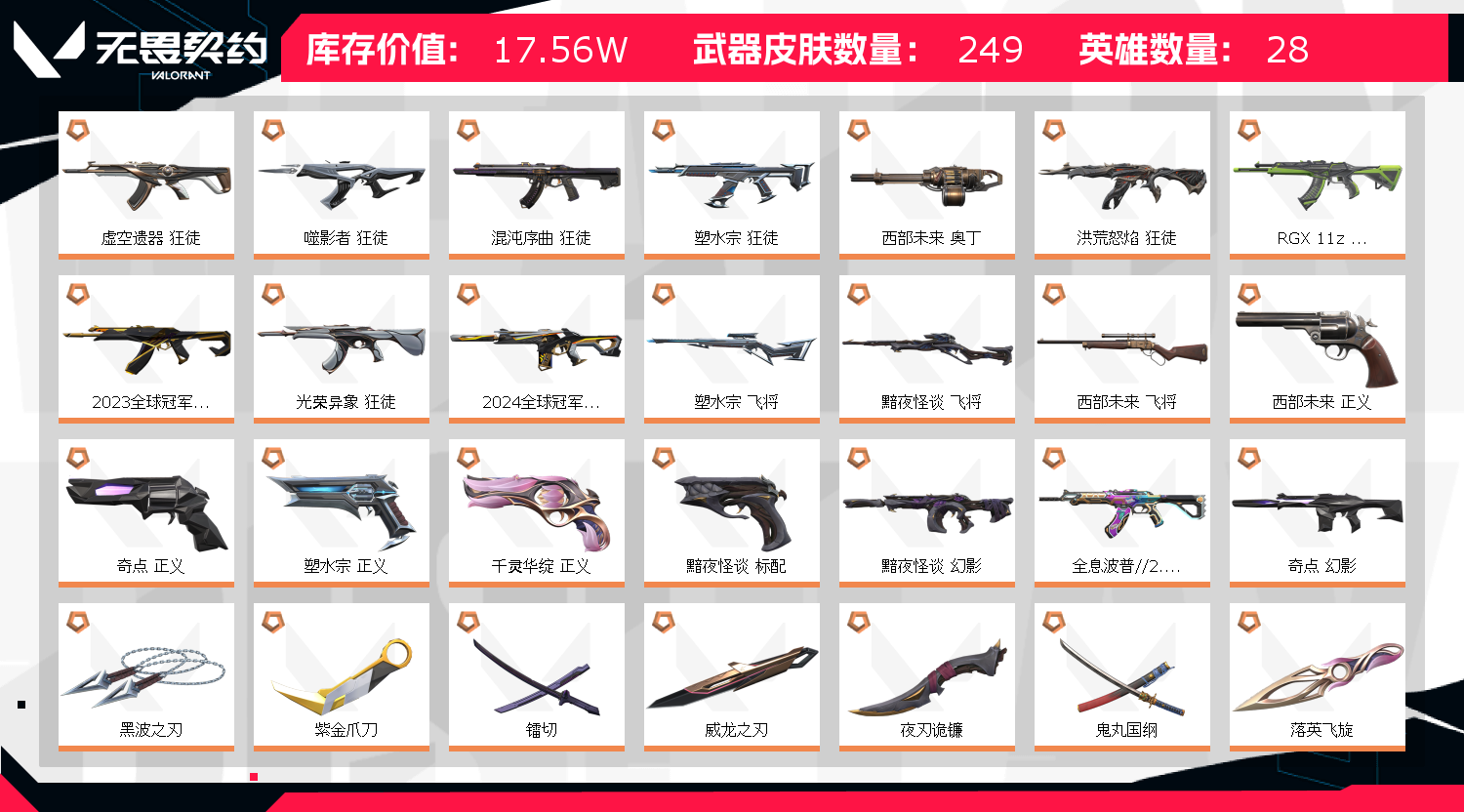 ✨冻结无法上号看wegame个人信息✨ 解冻17w忧郁少爷神话挂坠 【拥有套装】西部未来套 黯夜怪谈套 奇点2.0套 般若假面2.0套 24冠军套 23冠军套 盖亚的复仇套 耀鳞威龙套 掠影套 【拥有近战武器】光荣异象-歧途,RGX-11z-Pro//2.0-蝴蝶刀,落英飞旋,黑波之刃,紫金爪刀,RGX-11z-Pro//3.0-爪刀,天玄刀,侦察力量-蝴蝶刀 拥有步枪】光荣异象-狂徒,RGX-11z-Pro-狂徒,电音光谱-幻影,虚空遗器-狂徒,噬影者-狂徒,混沌序曲-狂徒,双城之战-狂徒,洪荒怒焰-狂徒,破败军械-戍卫,塑水宗-狂徒,全息波普//2.0-狂徒,机动狂飙-狂徒,归零者-狂徒,奇点-幻影,神中神罚-幻影,异鳞魔蛇-幻影,堕天遗武-狂徒,天界神兵-戍卫,天界神兵//2.0-幻影,盖世英雄-狂徒,紫阙金琅-狂徒,侦察力量-幻影,冰点凝冻-狂徒,海洋之星-狂徒 【拥有狙击枪】塑水宗-飞将,偃月苍龙-冥驹,上古龙炎-冥驹,源能者娱乐系统-冥驹,堕天遗武-冥驹,起源-冥驹 【拥有冲锋枪】奇点-骇灵 【拥有手枪】VCT-x-EDG-标配,电音光谱-标配,千灵华绽-正义,破败军械-鬼魅,塑水宗-正义,机动狂飙-正义,奇点-正义,781-A协议-正义,天界神兵-鬼魅,盖世英雄-鬼魅,紫阙金琅-标配,灵魂冲击-鬼魅,离子武器-正义,奇幻朋克-鬼魅 【稀有挂件】金属蝶翼挂饰,无畏契约GO卷奇乐挂饰,第九季神话挂饰;西部未来 奥丁,黑波之刃,紫金爪刀,镭切,威龙之刃,天界神兵//2.0 幻影,盖亚的复仇 狂徒,