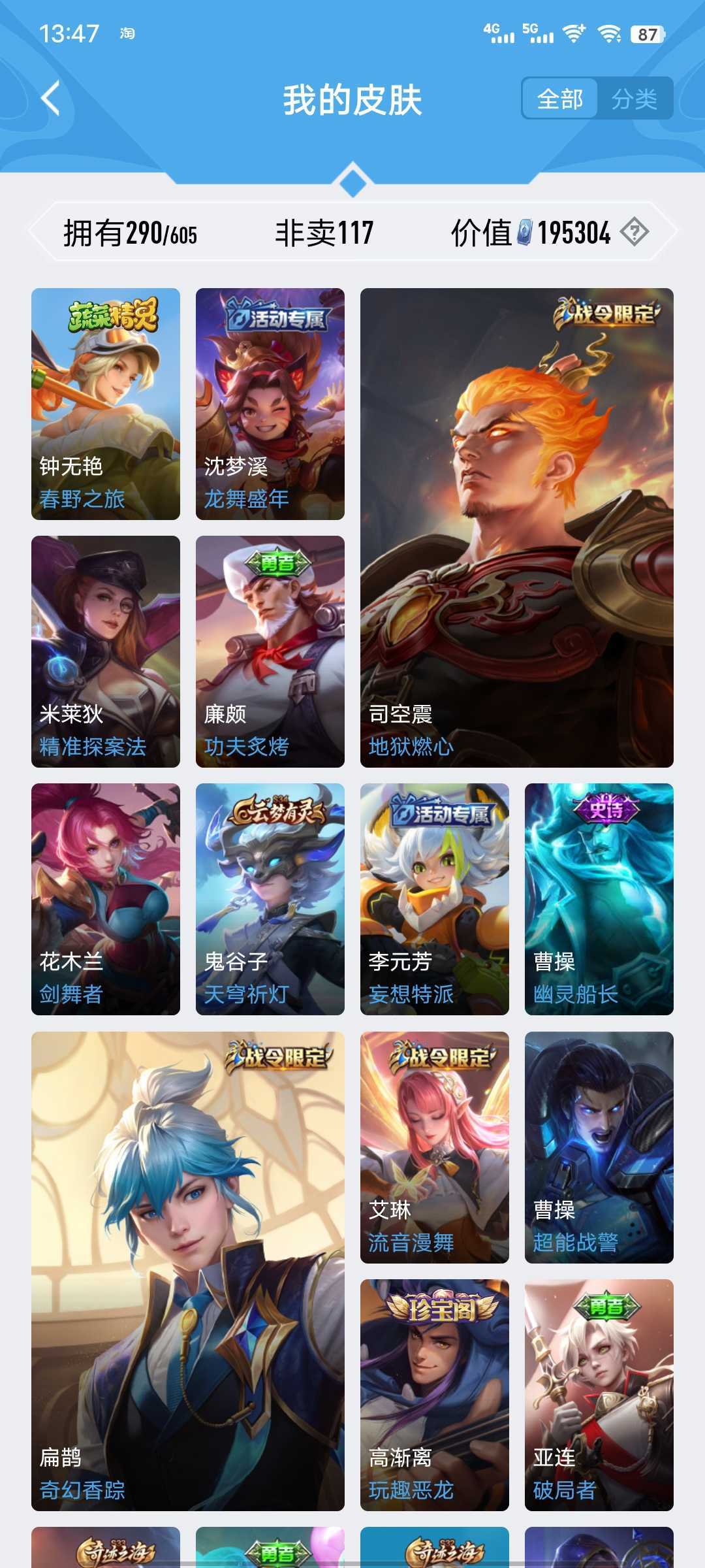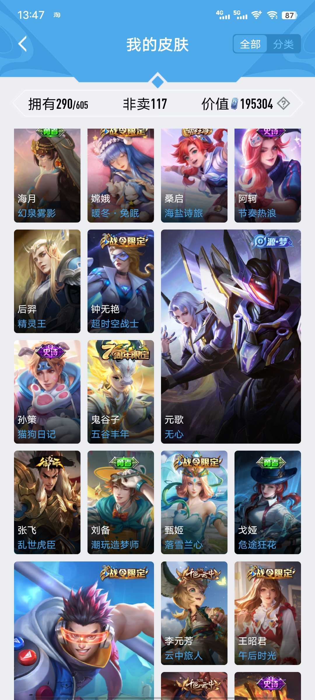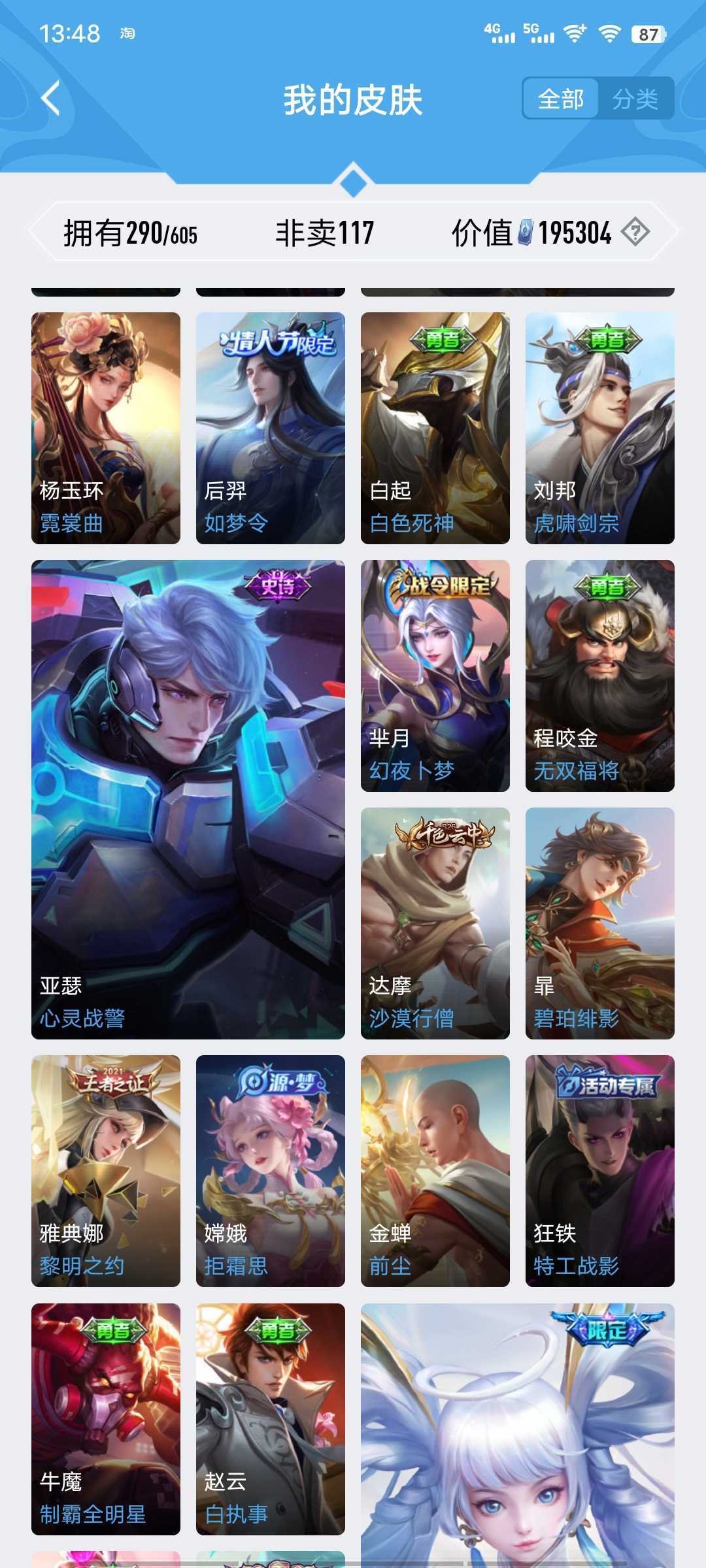 【非沄直接上号】极品V10★三历史国标★430皮★六典藏★诸葛亮新典藏★虎年五限定★鸣剑戈影★活力突击️★多限定