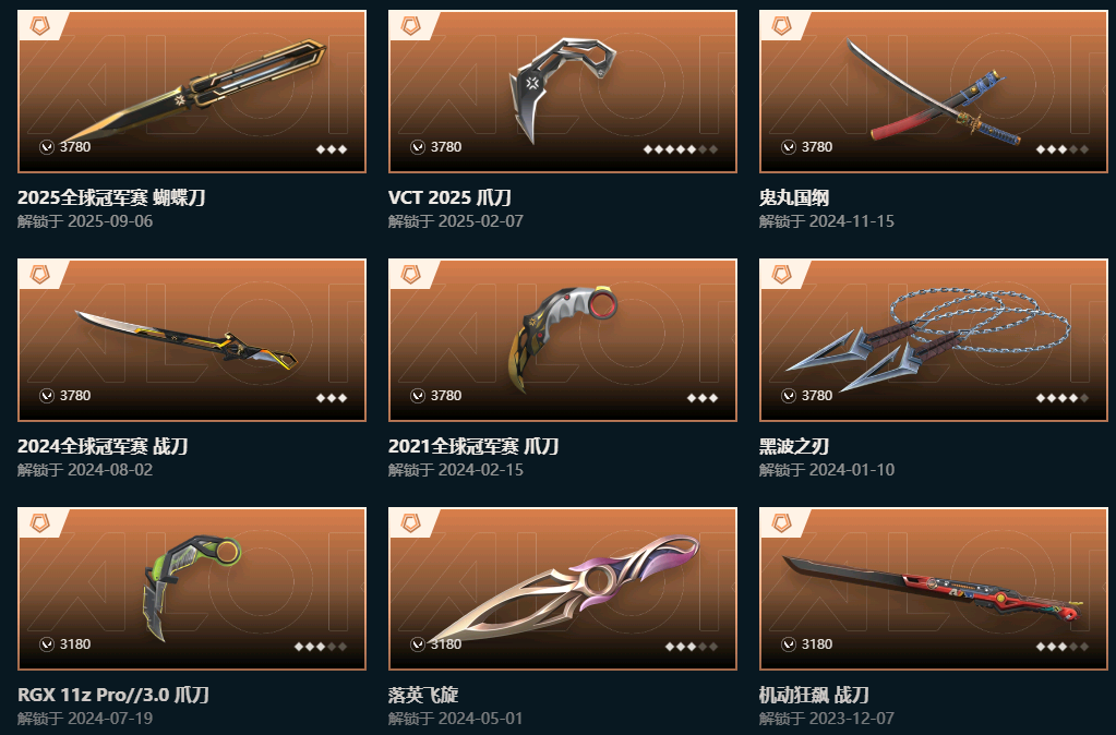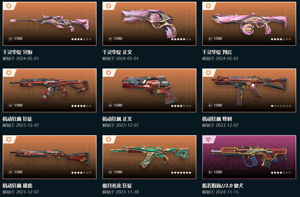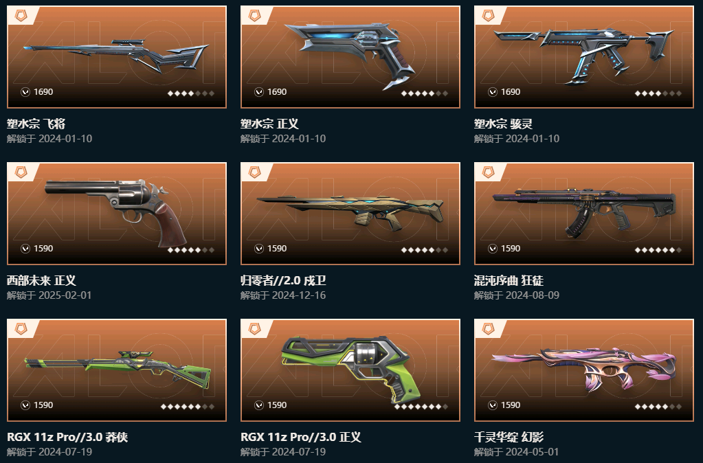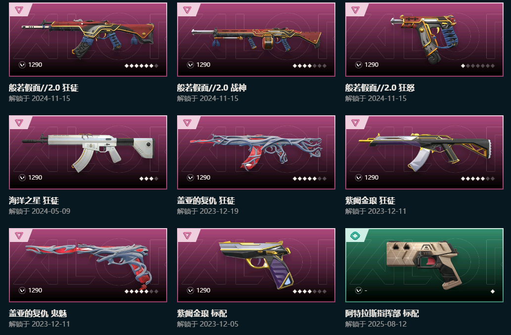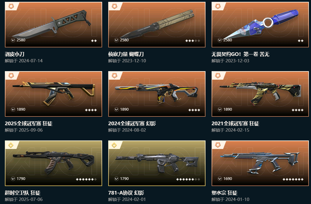 可排位 武器皮肤数量146 (凌晨2点至早上8点无法协助登录 我在睡觉);黑波之刃,剥皮小刀,VCT 2025 爪刀,盖亚的复仇 狂徒,紫阙金琅 狂徒,混沌序曲 狂徒,塑水宗 狂徒,