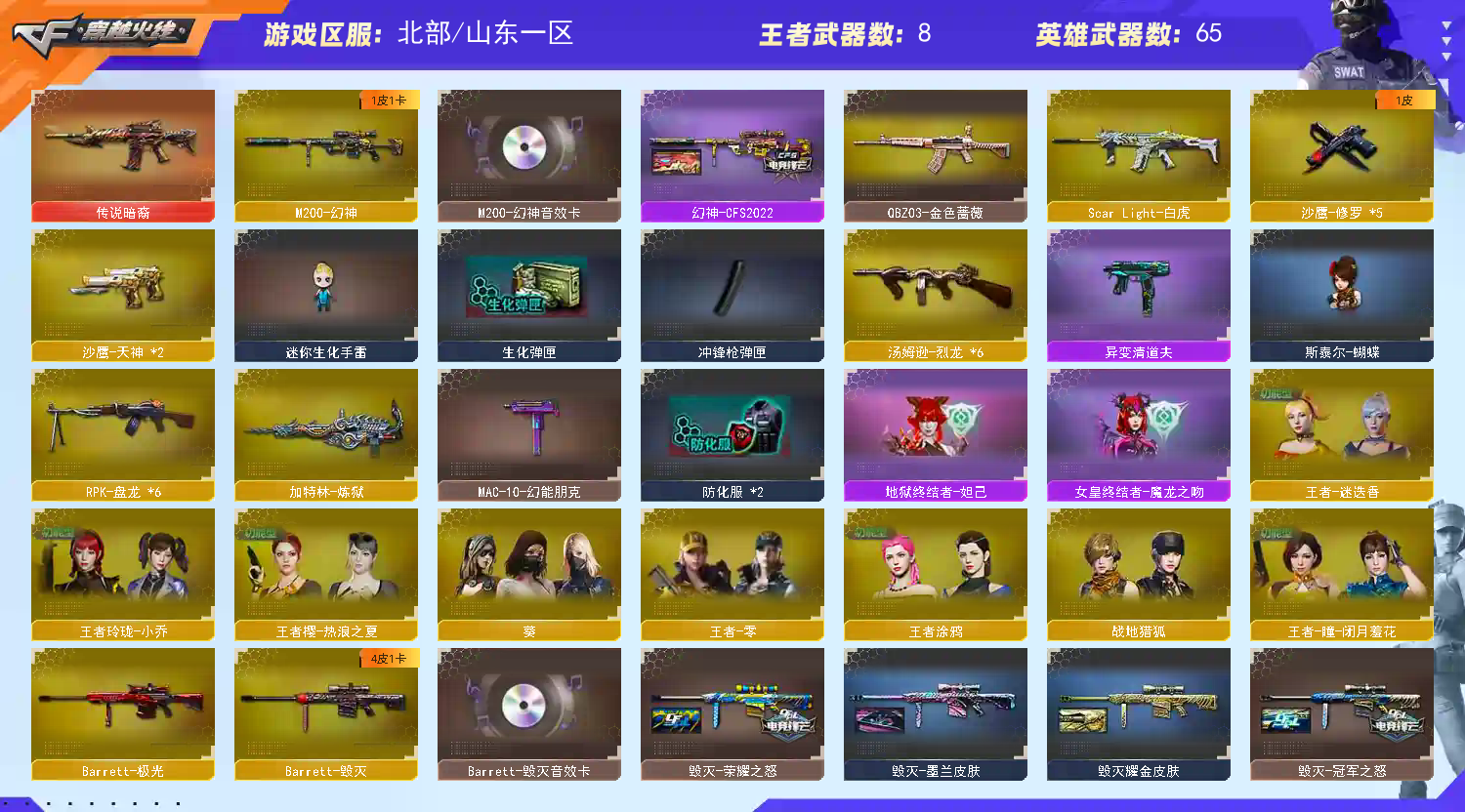m200】【6烈龙 炼狱 6盘龙 斯太尔蝴蝶】【传说暗裔】【scar白虎】【qbz金色蔷薇】【火麒麟+冠军之心】【黑龙】【雷神+卡+荣耀之魄】【黑骑士+卡+白马银呛+冠军之势】【毁灭+卡+荣耀之怒+冠军之怒+cfs2018】【极光】 【武器:王者之武 王者之魄 王者炎心 王者火魄 qbz王者蔷薇】 【7手呛:修罗*5 天神*2】 【11刀具:屠龙*3 龙啸*3 擎天 麒麟刺 王者之啸 王者之击 】 【3雷套:堕天神雷 竞技荣光雷*2】 【小人呛:火麒麟灵狐】 【音效卡:黑骑士音效卡 幻神音效卡 雷神音效卡 毁灭音效卡 】 【四防角色:王者玲珑小乔 职业经理;RPK-盘龙,QBZ03-金色蔷薇,M200-幻神,Scar Light-白虎,传说暗裔,