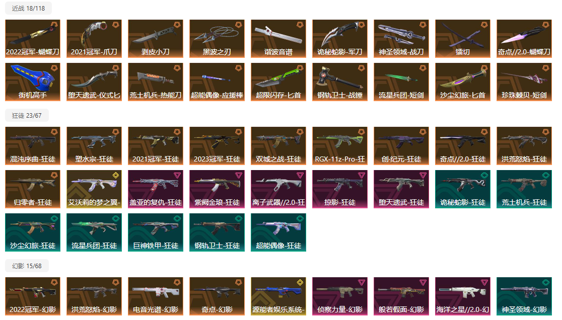【拥有套装】2022全球冠军赛套装(2022全球冠军赛-幻影,2022全球冠军赛-蝴蝶刀)电音光谱套装(电音光谱-幻影,电音光谱-獠犬,电音光谱-戍卫,电音光谱-标配,谐波音谱)堕天遗武套装(堕天遗武-狂徒,堕天遗武-冥驹,堕天遗武-骇灵,堕天遗武-标配,堕天遗武-仪式匕首)奇点2.0套装(奇点//2.0-狂徒,奇点//2.0-鬼魅,奇点//2.0-蝴蝶刀)2021全球冠军赛套装(2021全球冠军赛-狂徒,2021全球冠军赛-爪刀)源能者娱乐系统套装(源能者娱乐系统-幻影.源能者娱乐系统-冥驹,源能者娱乐系统-獠犬,源能者娱乐系统-鬼魅,街机高手)