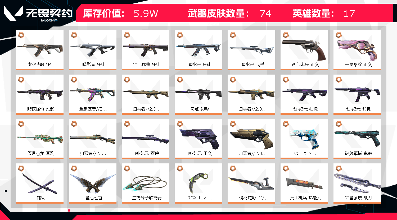 喜欢的老板,麻烦点点收藏,下次租玩更便利,持续更新皮肤中~~~ 【皮肤资产价值】59030 【使用R点】820 【英雄数量】10 【皮肤数量】70 【卡面数量】66 【喷漆数量】66 【挂件数量】44 【拥有套装】创纪元套装(创·纪元-狂徒,创·纪元-莽侠,创·纪元-骇灵,创·纪元-正义,镭切)归零者2.0套装(归零者//2.0-幻影,归零者//2.0-戍卫,归零者//2.0-莽侠,归零者//2.0-正义,生物分子解离器) 【拥有近战武器】诡秘蛇影-军刀,神圣领域-战刀,荒土机兵-热能刀,圣石匕首,RGX-11z-Pro//3.0-爪刀,穿花蝴蝶, 【拥有步枪】虚空遗器-狂徒,噬影者-狂徒,混沌序曲-狂徒,黯夜怪谈-幻影,塑水宗-狂徒,全息波普//2.0-狂徒,奇点-幻影,离子武器//2.0-狂徒,盖亚的复仇-狂徒,掠影-狂徒,诡秘蛇影-狂徒,神圣领域-獠犬,神圣领域-幻影,荒土机兵-狂徒,末日之翼-幻影,折光棱晶-戍卫,月球哨兵-戍卫,纳米击-幻影,逆冲蛮牛-戍卫,逆冲蛮牛-獠犬, 【拥有狙击枪】塑水宗-飞将,偃月苍龙-冥驹,诡秘蛇影-莽侠,荒土机兵-冥驹,末日之翼-飞将,星云暗涌-冥驹,月球哨兵-莽侠, 【拥有机枪】神圣领域-战神,末日之翼-奥丁,纳米-奥丁, 【拥有冲锋枪】荒土机兵-骇灵,折光棱晶-蜂刺,星云暗涌-骇灵,星云暗涌-蜂刺, 【拥有霰弹枪】上古龙炎-判官,紫阙金琅//2.0-雄鹿,诡秘蛇影-判官,月球哨兵-雄鹿,逆冲蛮牛-雄鹿,纳米-判官, 【拥有手枪】VCT25-x-LEV-标配,西部未来-正义,千灵华绽-正义,破败军械-鬼魅,归零者-短炮,诡秘蛇影-鬼魅,神圣领域-狂怒,荒土机兵-标配,末日之翼-短炮,折光棱晶-标配,星云暗涌-鬼魅,月球哨兵-正义,纳击-正义,逆冲蛮牛-狂怒,24冠军混沌黯夜怪谈艾沃莉源能者电玩显卡套塑水宗归零者盖世套光明哨兵机动狂飙全息波普破败军械掠夺掠影无畏奇点2.0白银青铜黄金黑铁砖石铂金盖亚洪荒离火刃毁灭骑士VCT爪刀创纪元镭切虚空遗器离子2.0西部未来蝴蝶刀黑波显卡AK无畏光荣异象RGX 11Z PRO奇点正义23盖亚铂金22冠军苍龙之刃21冠军掠影2.0影钩赋能掠夺爪显卡AK滋滋X特工队25冠军;镭切,上古龙炎 判官,盖亚的复仇 狂徒,虚空遗器 狂徒,噬影者 狂徒,掠影 狂徒,混沌序曲 狂徒,