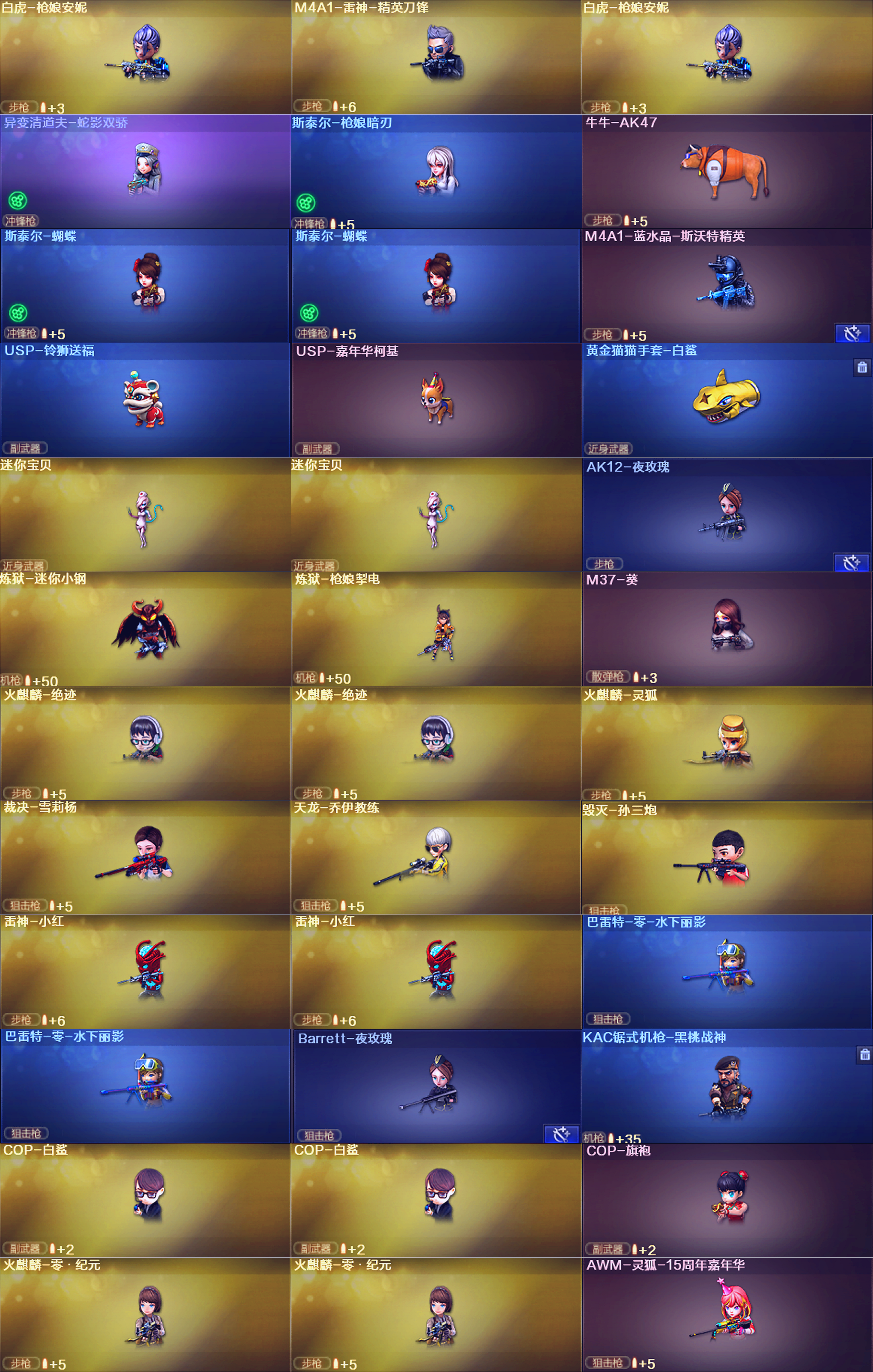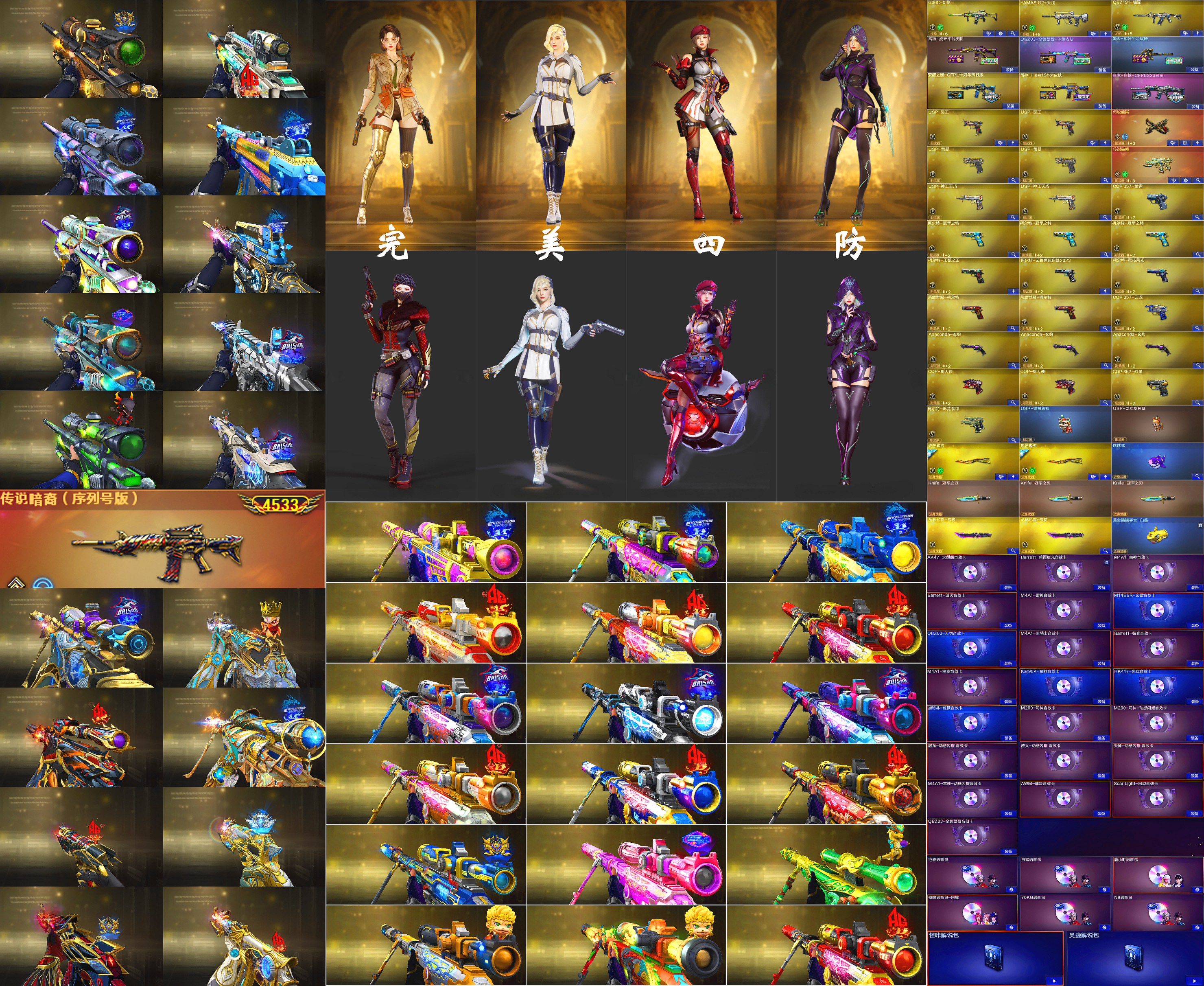 💐新增💐 QBZ和M4拼搏皮肤、怪咖解说包、吴巍解说包; 玄豹套装、王者凌虎、战队玩偶 全新首发 USP冥王 2个、传说星骇、传说圣谕、王者玄武、王者冰锋,裁决-叶芒苍灵 已到位 FAMAS G2 天戎 已到位 幻神AG新皮,裁决-巅峰荣耀,裁决-典雅胡桃,白虎-白鲨CFPLS23冠军,龙啸-巅峰荣耀 💐传说武器💐 传说星骇、传说艾莉莎、传说女帝、传说影煞、传说圣谕、传说幽瞳、传说幽冥、传说灵眸、传说破晓、传说辉光、传说夜影、传说暗裔、传说圣灵 💐角色💐 传说星骇(4防)、传说艾莉莎(4防)、传说女帝(4防)、传说影煞(4防)、晴雅(4防)、玄豹(4防)、荒漠琉璃(4防)、电竞教官-雲悠悠(4防)、鹰(4防)、灵狐者-职业经理(4防)、卡塔琳娜(4防)、暗夜审判(4防)、女主播(4防+鹿小町语音包)、枪娘樱(3防+枪娘阿敏语音包)、空(4防)、华(4防)、 王者影豹(4防)、王者零-华冠丽服(4防)、王者潘多拉(4防)、王者-迷迭香(4防)、王者春(4防)、王者炽天使(4防)、王者沙漠玫瑰(4防)、王者凌霄(4防)、王者涂鸦(4防)、王者-瞳-闭月羞花(4防)、王者-葵-貂蝉(4防)、灵动武士(4防)、 王者樱-热浪之夏(3防)、幽(3防)、影豹(3防)、职业选手(3防+全语音)、月兔特工(3防)、女战神(3防)、流浪蔷薇(3防)、铁骑荣耀、铁骑-乘风破浪(3防)、葵-赛博朋克(3防)、灵狐者-黄金海岸(3防)、斯沃特-锋芒精英(3防)、 零、葵、审判者、樱、迷迭香、炫、王者玲珑、王者炽天使、雅典娜、王者复仇、王者救世主、王者零-传说之路、乔伊教练、新海豹突击队 💐皮肤💐 M200-幻神:AG-CFPL S24冠军、星火小队签名珍藏版、HeartShot、宠儿-2021MVP、N9-2022MVP、荣耀世冠白鲨2023、曹操、荣耀世冠白鲨、炽焰魔龙、动感闪耀、黄忠、冠军之幻、巅峰荣耀、AG-CFPLS17冠军、电流骇客、降龙、CFS2022、纸灯龙; Barrett-毁灭:AG-CFPLS15冠军、荣耀之怒*3、冠军之怒、CFPL冠军、枪娘、CFS2018、CFS2020、BEAN-2020MVP、直播专属、魔灵、战神张飞、星空*2、耀金*3、墨兰、黑大圣; Barrett-极光:能量核心; Kar98K-星神:冠军之星、枪娘默、破竹、璀璨、漫游; AWM-天龙:传奇白鲨*2、传奇70KG*2、能量核心、CF Star AWM-裁决:叶芒苍灵、巅峰荣耀、典雅胡桃、流光秘银、异化之源; Scar Light-白虎:白鲨-CFPLS23冠军、冠军之虎、AG-CFPLS20冠军*2、虎啸、大汉风骨、霓虹机甲、电玩粉兔; M4A1-雷神:荣耀之魄-CFPL十周年臻藏版、虎牙平台皮肤、HeartShot、传奇N9、拼搏、刘备*2、CFS十周年纪念版、白鲨-CFPLS14冠军、宠儿-2019MVP、荣耀之魄*2、炽焰魔龙、冠军之魄、巅峰荣耀、CFS 2019、宇航兔、杨戬、战神赵云、动感闪耀、虎将、耀金、航星、白鲨、暗月、能量核心、星空*2、R.LGD-CFPLS18冠军、动感闪耀; QBZ03-金色蔷薇:斗鱼皮肤、拼搏、量子蔷薇、荣耀世冠白鲨、冠军之薇、AG-CFPLS19冠军、枪娘阿敏、纸灯龙、巅峰荣耀; QBZ03-天罚:孙权; M4A1-黑龙:冠军之武、墨子非攻、能量核心、361; M4A1-黑骑士:冠军之势、战神马超、耀金*2、摸金校尉、AG-S4冠军典藏; AK47-火麒麟:巅峰荣耀、传奇EVEN、传奇石头-横秒之巅、冠军之心、白虎、华夏之心、CFS2018、轻羽、心动糖果、战神关羽、AG战队*5、CF STAR*4、平天大圣、雷神*2; AK47-黑武士:典韦*2、361; AK47-无影:耀金*3; HK417-朱雀:武当; AWM-天龙:传奇白鲨、传奇70KG、CF-STAR、能量核心*4; 加特林-炼狱:星空; 汤姆逊-烈龙:星空; 沙鹰-修罗:CFS2018、耀金、CFSTAR、能量核心*2; 屠龙:荣耀之锋、星火燎原; 龙啸:巅峰荣耀、冠军之啸、纸灯龙; 炽芒蝶刃:荣耀世冠白鲨2023*2; 擎天:虎牙平台皮肤、冠军之击; 麒麟刺:荣耀世冠白鲨、甜蜜糖果; 💐道具💐 M200-幻神音效卡、动感闪耀音效卡; Kar98K-星神音效卡; M14EBR-玄武音效卡; Barrett-毁灭音效卡; Barrett-极光音效卡; M4A1-雷神音效卡、动感闪耀音效卡; M4A1-黑龙音效卡; M4A1-黑骑士音效卡; AK47-火麒麟音效卡; 加特林-炼狱音效卡; QBZ03-金色蔷薇音效卡; QBZ03-天罚音效卡; HK417-朱雀音效卡; Scar Light-白虎音效卡; AWM-裁决音效卡; 烈火-动感闪耀音效卡; 屠龙-动感闪耀音效卡; 天神-动感闪耀音效卡; 鹿小町语音包、枪娘阿敏语音包、白鲨语音包、N9语音包、70KG语音包、绝迹语音包; 怪咖解说包、吴巍解说包; 💐步枪💐 传说夜影、传说辉光、传说暗裔(序列号版4533)、G36C-幻影、M14EBR-玄武、HK417-朱雀、AK47-火麒麟*8、AK47-麒麟、M4A1-雷神*6、M4A1-黑龙*5、M4A1-黑骑士*4、M4A1-青龙、M4A1-雷霆、M4A1-千变*2、M4A1-死神、M4A1-堕天神、M4A1-武圣、M4A1-龙血*3、M4A1-神工天巧、M4A1-死神、M4A1-玫瑰精灵*4、M4A1-玄龙、AK47-无影*3、AK47-机械迷城、无影-神兵利器、AK47-黑武士*4、黑武士-CF网剧冠军套装*3、AK47-黑鲨*4、AK12-天启、QBZ191-银翼游侠、QBZ03-金色蔷薇*2、QBZ03-天罚、QBZ03-雲龙、QBZ03-吕布、QBZ03-麟龙、Scar Light-白虎、白虎-电玩蓝兔、AN94-超新星*2、9A-91-烈火*3、烈火-动感闪耀、荣耀世冠-雷神、白虎之魄-觉醒版、王者之魄-觉醒版*7、王者风武-觉醒版、王者之武-觉醒版、王者之势-觉醒版、王者玄武-觉醒版、王者冰魄-觉醒版、王者青龙-觉醒版、王者之幻-觉醒版、QBZ-03-王者蔷薇-觉醒版、天启-悦智-觉醒版、王者之心-觉醒版、王者炎心-觉醒版、王者霜心-觉醒版、王者之翼-觉醒版*3、王者之影-觉醒版、王者之鲨-觉醒版、超新星-悦享-觉醒版、黑骑士-海王*3、炫金无影、炫金超新星、炫金雷神*2、炫金骑士*2、炫金毁灭、炫金天神、机