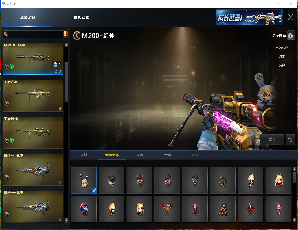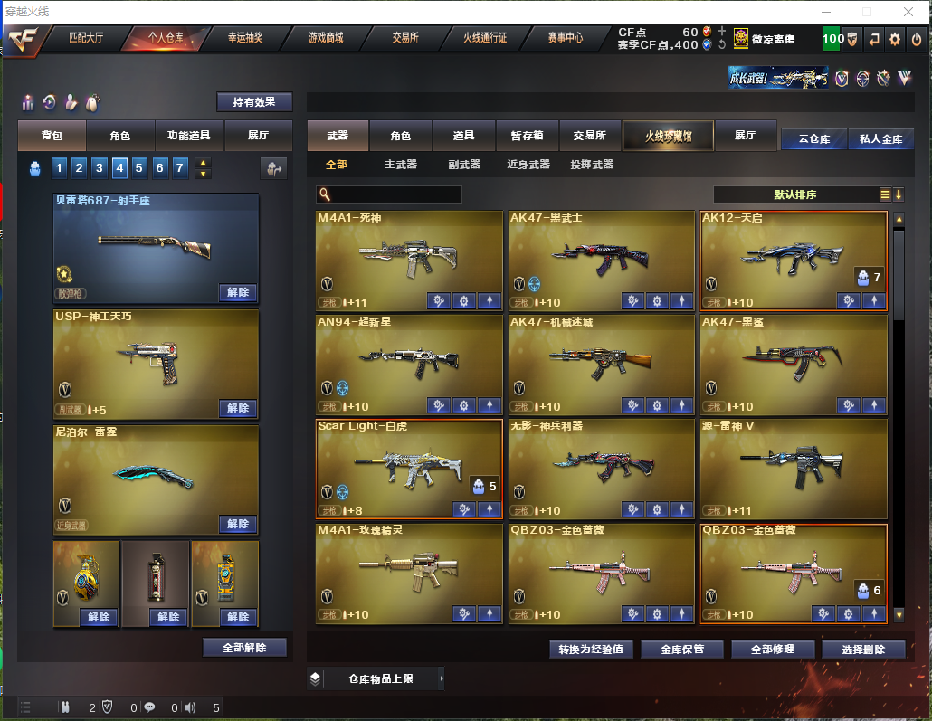 【主武器》M200-幻神/王者风神觉醒/白虎/②蔷薇qbz/③雷神/②黑骑士/②火麒麟/黑龙/无影/死神/黑武士/天启/超新星/机械迷城/黑鲨/无影/玫瑰精灵/猎神/烈火/烈火动感闪耀/王者之影觉醒/王者之魄觉醒/王者霜心觉醒/天龙/毁灭/极光/裁决/暗月传说大炮/裁决/王者之怒觉醒/②炼狱/③烈龙/王者之翼/王者之影/炫金雷神/炫金毁灭/炫金天龙/机甲撕裂者3/激光毁灭者3/擎天柱3/金魔/神圣爆裂者+末日3/试炼破坏者3/EVO赤血龙魂/ 【副武器】USP-神功天巧/④修罗/天神/天神动感闪耀/王者之魂觉醒/COP旗袍 【近身武器】炽芒蝶刃/尼泊尔雷霆/④屠龙/龙啸/擎天/麒麟刺/唐刀神功天巧/屠龙动感闪耀/王者之峰觉醒/金刚伞/Mini沃特X/迷你波特博士/迷你裂空之翼/迷你深渊冰龙/手斧镜 【投掷武器】⑤高爆神功天巧+⑤烟闪/②高爆雷霆+②烟闪/高爆雷霆王者/手雷动感闪耀/王者之魄高爆 【角色】王者迷迭香爆破四防/王者零国色天香爆破四防/魅影/樱/葵/乔伊教练/修道士/兰海滩派对/灵狐者黄金海岸/王者零传说之路/对讲机/炫彩背包/圣灵戒/魔龙戒/ 【皮肤】雷神-LGDCFPLS18冠军皮肤/毁灭-荣耀之怒皮肤/毁灭-耀金皮肤/修罗-星空皮肤/雷神-星空皮肤/ 【音效卡】毁灭音效卡/黑骑士音效卡/天神动感闪耀音效卡/屠龙动感闪耀音效卡 【道具】紫金大元首/全背包VIP6/变异宝贝/钩子/防化服/手枪/步枪/机枪弹夹/爆破全装号;炽芒蝶刃,汤姆逊-烈龙,QBZ03-金色蔷薇,M200-幻神,Scar Light-白虎,