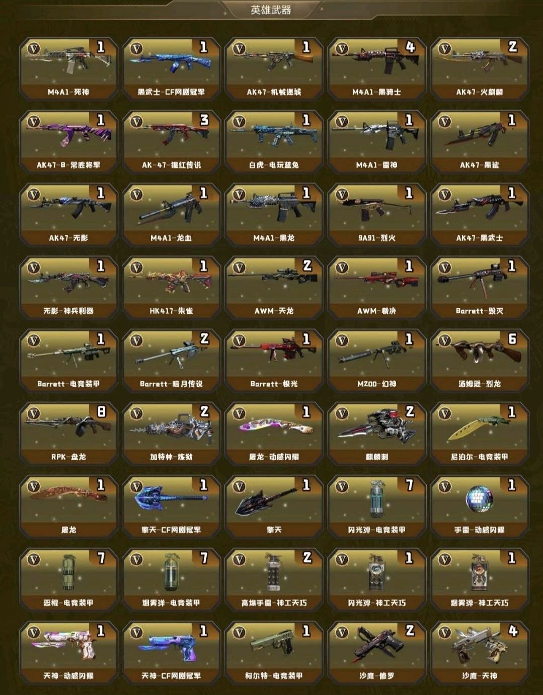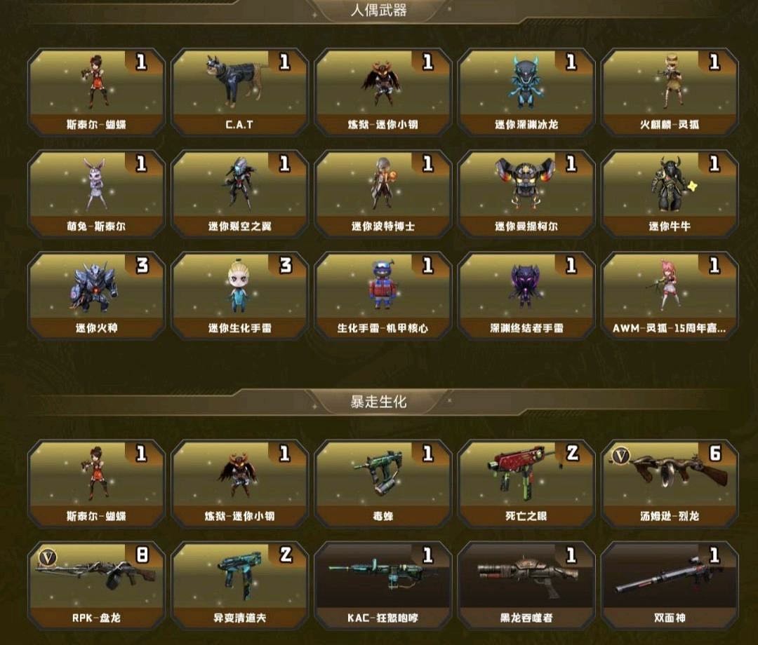 爆破号 生化号 挑战号 喜欢请收藏 4防沙漠玫瑰 传说爱丽莎 M200-幻神 黄金猫猫手套白鲨 冠军之刃 6列双异变清道夫 异变镇魔者+不退包 斯太尔蝴蝶 萌兔 8盘加特林炼狱 加特林小刚 雷神+皮肤音效卡 6黑骑士+皮肤音效卡 王者之霆 白虎 AWM裁决三件套 王者之决 8套英雄手雷等;