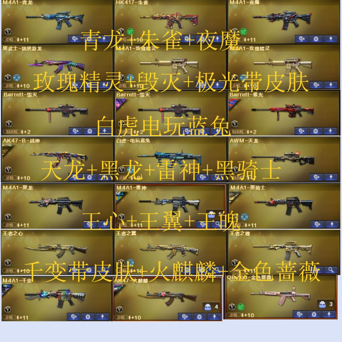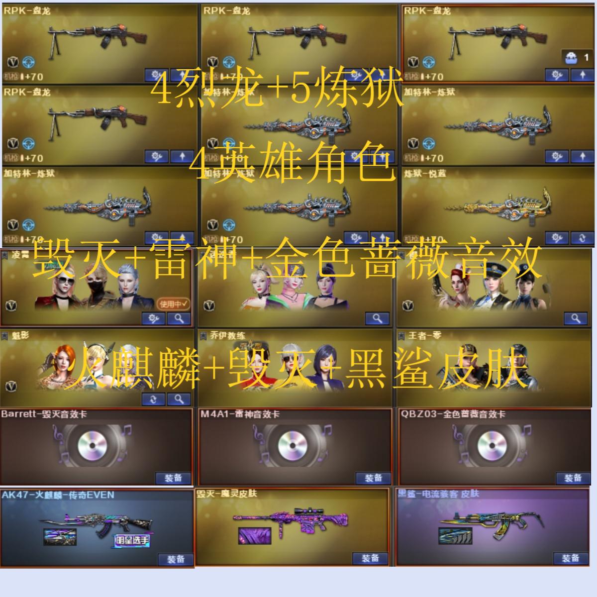 144V17王者12炫金可排位/王者幻神+柯尔特冠军之特/98K-星神2把/M4A1-青龙/HK417-朱雀/QBZ03-金色蔷薇/白虎-电玩蓝兔/夜魔套装+7套夜魔雷/武圣套装/4盘龙4炼狱2烈龙+死亡之眼/5修罗/COP-堕天神2把/AK47-火麒麟音效卡/M4A1-雷神音效卡/Barrett-毁灭音效卡/M4A1-黑骑士音效卡/QBZ03-金色蔷薇音效卡/毁灭-魔灵/黑鲨-电流骇客/毁灭耀金皮肤/黑骑士耀金皮肤/火麒麟-传奇EVEN/毁灭-BEAN-2020MVP/雷神-宠儿-2019MVP/毁灭-星空/雷神-星空/火麒麟-CFS2018/火麒麟-冠军之心/火麒麟-轻羽/火麒麟-AG战队/雷神-荣耀之魄/无影-霓裳/千变-孔明/AWM-天龙-传奇白鲨/AWM-天龙-传奇70KG/火麒麟-CFSTAR/修罗-CFSTAR/火麒麟-绝迹/火麒麟-灵狐/天龙-曼陀罗/COP-白鲨/金色小号/牛牛AK/巨龙咆哮3/神圣爆裂者-末日3/阐释者3/王者炎心/王者之城/王者之心觉醒/王者之翼觉醒/王者冰魄/王者之戮/王者之魄/王者之光觉醒/王者之怒/王者之灵/王者之锋/王者之击/炫金雷神/炫金骑士/炫金毁灭/炫金天龙/樱/魅影/凌霄/迷迭香/王者-零/职业选手/烟雾保护头盔+闪光护目镜/炫彩背包/超级背包3-7+扩展背包;柯尔特-冠军之特,RPK-盘龙,QBZ03-金色蔷薇,Kar98K-星神,