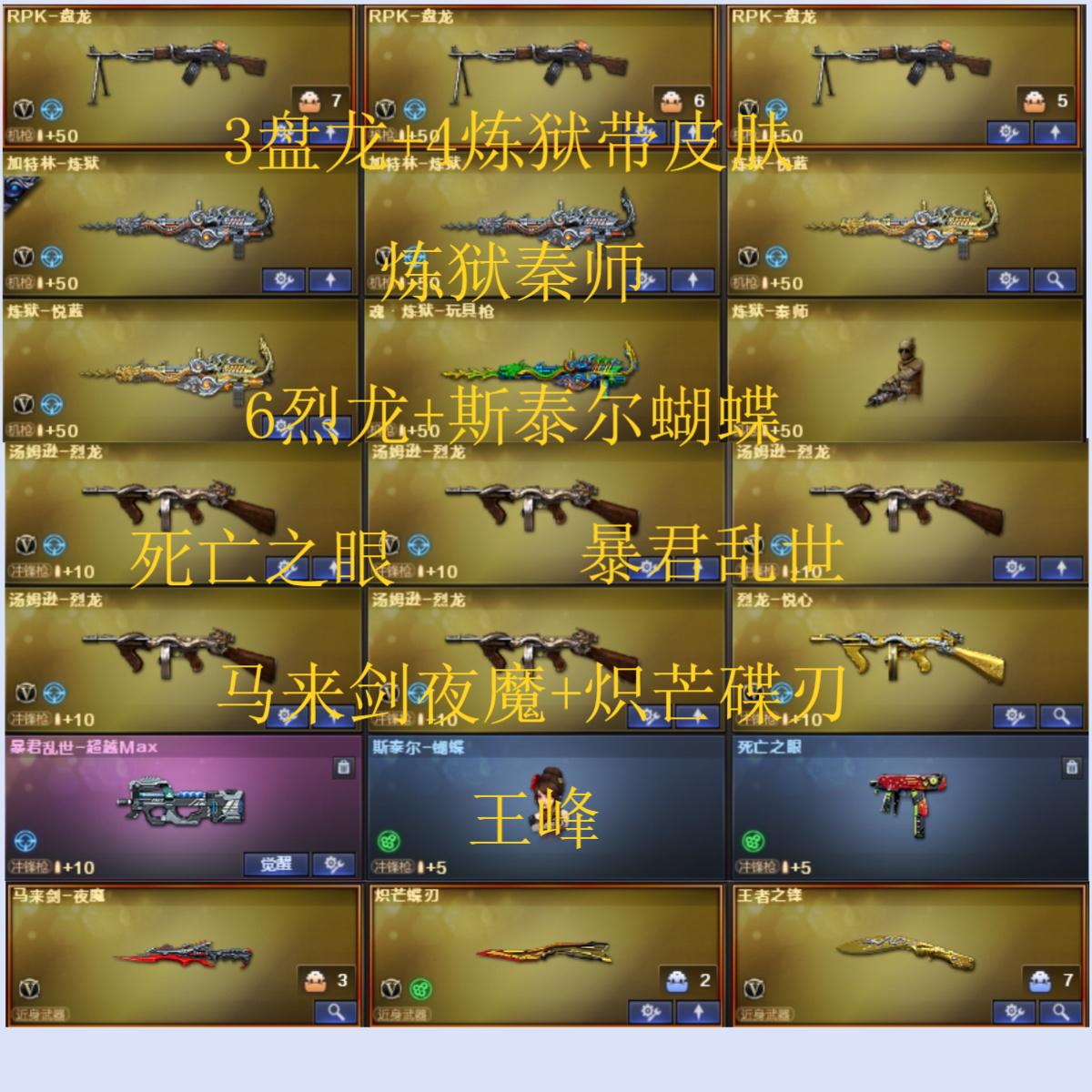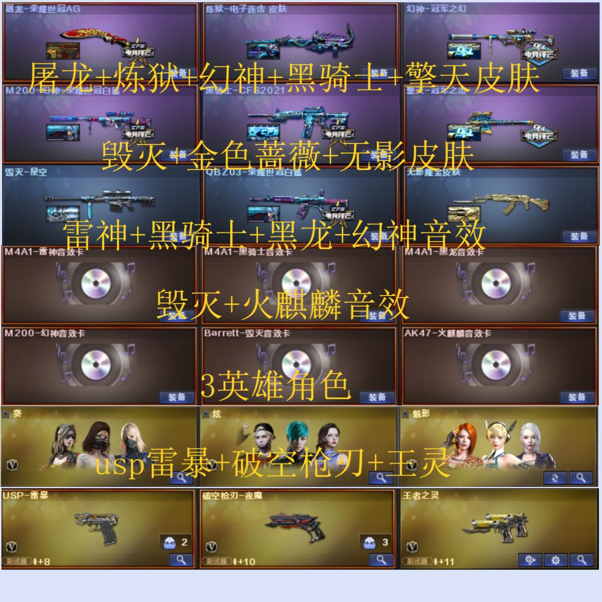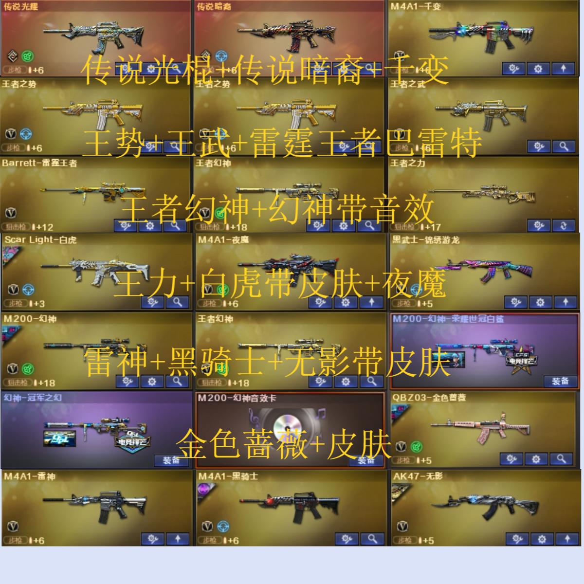 161V40王者8炫金可排位/传说光耀/传说暗裔/M200幻神+幻神冠军之幻+幻神荣耀世冠白鲨+幻神音效卡+炽芒蝶刃+Knife冠军之刃/王者幻神觉醒/HK417-朱雀/Scar Light-白虎/QBZ03-金色蔷薇/荣耀世冠火麒麟+荣耀世冠雷神+荣耀世冠柯尔特+荣耀世冠龙啸/网剧冠军套装/夜魔套装+3套夜魔雷/3盘龙4炼狱6烈龙+炼狱-秦师+斯泰尔蝴蝶+死亡之眼/【四防】王者-零-国色天香/【四防】王者-瞳-闭月羞花/【四防】灵狐者-职业经理/职业选手+70KG语音包/Barrett-毁灭音效卡/AK47-火麒麟音效卡/M4A1-雷神音效卡/M4A1-黑骑士音效卡/M4A1-黑龙音效卡/屠龙-荣耀世冠AG/擎天-冠军之击/黑骑士-CFS2021/雷神-宇航兔/火麒麟-CFS2018/修罗-CFS2018/QBZ03-荣耀世冠白鲨/麒麟刺-荣耀世冠白鲨/毁灭-SV-CFPLS16冠军/毁灭-墨兰/毁灭-虹光风暴/白虎-电玩粉兔/火麒麟-雷神/黑骑士-战神马超/雷神-宠儿-2019MVP/雷神-荣耀之魄/雷神-冠军之魄/火麒麟-冠军之心修罗-冠军之魂/龙啸-冠军之啸/火麒麟-轻羽/火麒麟-平天大圣/火麒麟-AG战队/雷神-白鲨-CFPLS14冠军/雷神-虎将/火麒麟-CFSTAR/天龙-CFSTAR/M4A1-雷神-精英刀锋/火麒麟-灵狐/COP-白鲨/暴君乱世-超越MAX/激光毁灭者3/神圣爆裂者3/王者之心觉醒/M4A1-雷霆王者觉醒/王者冰魄觉醒/王者之幻/王者之戮/王者之魄觉醒/王者之势觉醒/王者之武觉醒/Barrett-雷霆王者觉醒/王者之力觉醒/王者之怒觉醒/王者之灵觉醒/王者之锋觉醒/王者之击觉醒;USP-雷暴,荣耀世冠-柯尔特,炽芒蝶刃,Knife-冠军之刃,RPK-盘龙,QBZ03-金色蔷薇,M200-幻神,
