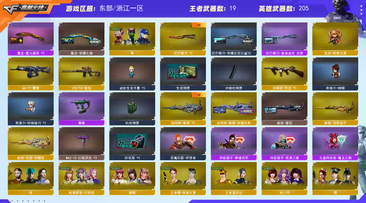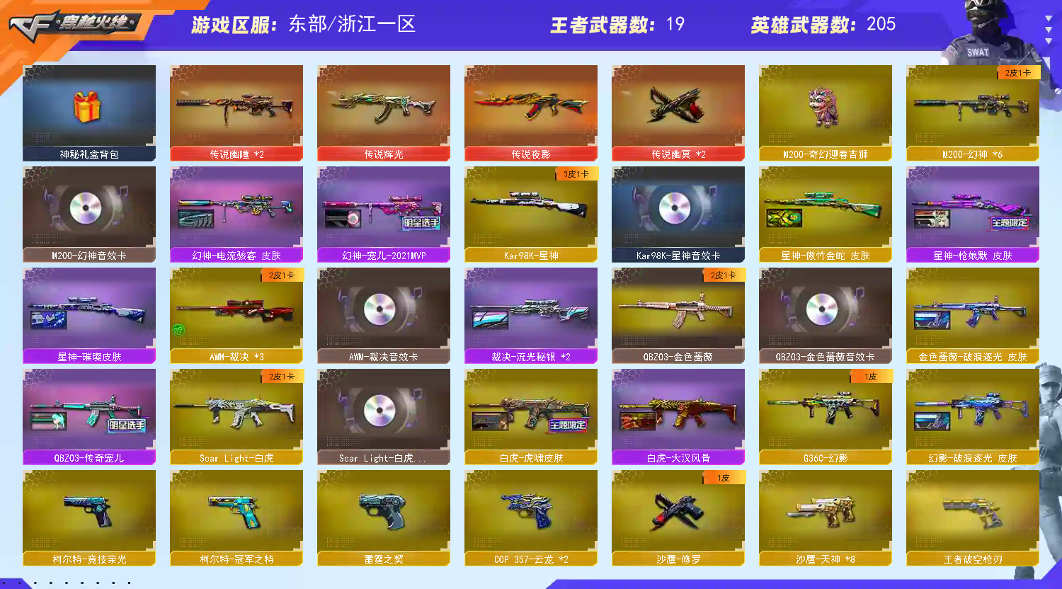 【亮点解析 4传说 幻神三件套 星神三件套 生化满配 白虎三件套 挑战九阶 臻选套 擎天柱】【传说幽瞳*2 传说幽冥*2 传说辉光 传说夜影(7794)】【m200幻神+音效卡+电流骇客+宠儿皮肤+冠军之特】【98k星神+音效卡+傲竹金蛇+呛娘皮肤】【m200竞技荣光套+云悠悠】【王者星霆 】【6炼狱+钟馗 6烈龙 炽芒蝶刃*2+荣耀世冠白鲨2023 斯太尔蝴蝶 斯太尔呛娘暗刃】【g36c幻影+破浪逐光】【scar白虎+卡+虎啸】【qbz金色蔷薇+卡+宠儿皮肤】【火麒麟+卡+呛娘皮肤】【黑龙】【雷神+卡+n9皮肤+白鲨冠军】【黑骑士*4】【毁灭+卡+星耀+ag15冠军】【裁决】 【武器:青龙 qbz云龙 王者之势 海王 王者风势 王者芳薇 王者雷影 qbz王者蔷薇 金蚀 王者星光 】 【15手呛:修罗 天神*7 cop雷霆 cop云龙*2 王者之魂】 【21刀具:屠龙*4 龙啸*2 麒麟刺*2 幻灵之峰*2 云龙扇 王者岩刺 王者炎啸 】 【19雷套:雷霆雷*5 幻灵雷*7 竞技荣光雷*7】 【小人呛:朱雀蛇隐宗 白虎呛娘安妮 火麒麟灵狐 金色蔷薇空 玄武呛娘火莲 裁决雪莉杨 幻神呛娘爱丽丝 幻神魅影 毁灭孙三炮 天龙乔伊教练 炼狱呛娘掣电 cop白鲨 马呛】 【音效卡:星神音效卡 玄武音效卡 金色蔷薇音效卡 毁灭音效卡 白虎音效卡 雷神音效卡 幻神音效卡 火麒麟音效卡 】 【四防角色:关小羽 晴雅 王者魅影 王者潘多拉 王者影豹 超能女侍觉 职业经理 】【隼】;传说幽冥,柯尔特-冠军之特,炽芒蝶刃,隼,电竞教官-云悠悠,晴雅,QBZ03-金色蔷薇,