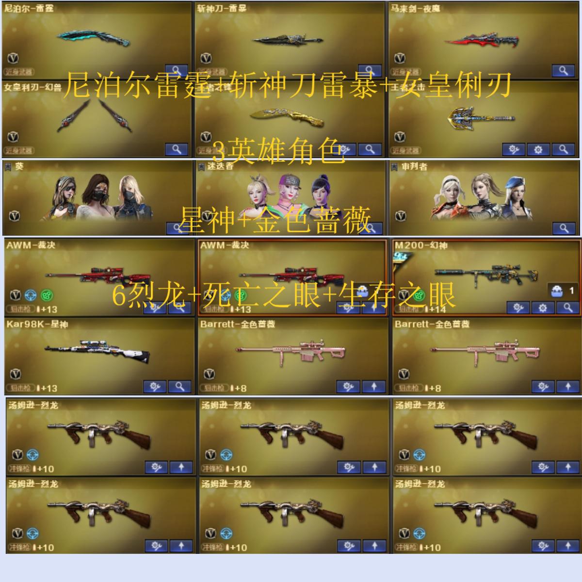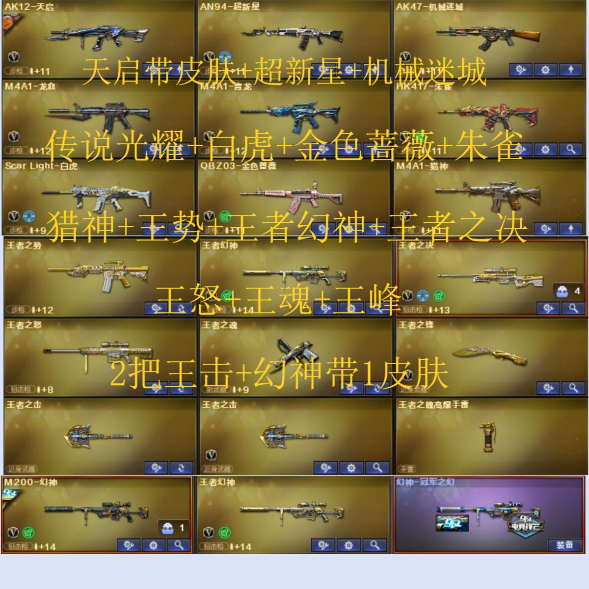 128V14王者7炫金可排位/传说光耀/M200-幻神+冠军之幻/王者幻神觉醒/Kar98K-星神/M4A1-青龙/HK417-朱雀/Scar Light-白虎/白虎-电玩蓝兔/M4A1-玄龙/QBZ03-金色蔷薇/荣耀世冠-火麒麟+荣耀世冠-雷神-荣耀世冠-柯尔特+荣耀世冠-龙啸/破空枪刃-夜魔+马来剑-夜魔+3套夜魔雷/沙鹰-幻兽+女皇利刃-幻神+1套幻兽雷/尼泊尔-雷霆+1套雷霆雷/斩神刀-雷暴+1套雷暴雷/【四防】王者玲珑-小乔/3炼狱1盘龙11烈龙+死亡之眼-庆典-CFS2021/AK47-火麒麟音效卡/M4A1-雷神音效卡/M4A1-黑骑士音效卡/Barrett-毁灭音效卡/雷神-烈虎皮肤/黑骑士-白马银枪/雷神-R.LGD-CFPLS18冠军/黑骑士耀金皮肤/毁灭-星空皮肤/火麒麟-雷神/火麒麟-CF2018/黑骑士-冠军之势/火麒麟-战神关羽/雷神-传奇N9/火麒麟-CFSTAR/火麒麟-冠军之心/AWM-天龙-传奇70KG/火麒麟-AG战队皮肤/雷神-荣耀之魄/屠龙-荣耀之锋/修罗-STAR/天龙-CFSTAR/雷神-荣耀之魄/雷神-白鲨-CFPLS14冠军/王者之心觉醒/王者之戮觉醒/王者之魄/王者之势/王者之击觉醒/王者之怒/王者之魂/王者之锋觉醒/王者之击觉醒/炫金黑龙/炫金雷神/炫金骑士/炫金毁灭/炫金天龙/机甲撕裂者3/激光毁灭者3/神圣爆裂者-末日3/火麒麟-绝迹/火麒麟-灵狐/天龙-曼陀罗/M4A1-雷神-精英刀锋/COP-白鲨/COP-旗袍/天龙/毁灭/5极光/2裁决/5火麒麟/黑龙/6雷神/黑骑士/无影/堕落女神/葵/迷迭香/审判者/魅影/【长时效】烟雾保护头盔+闪光护目镜/炫彩背包/超级背包3-7+扩展背包/永久防弹衣+永久防弹头盔;荣耀世冠-柯尔特,柯尔特-冠军之特,QBZ03-金色蔷薇,M200-幻神,Scar Light-白虎,Kar98K-星神,