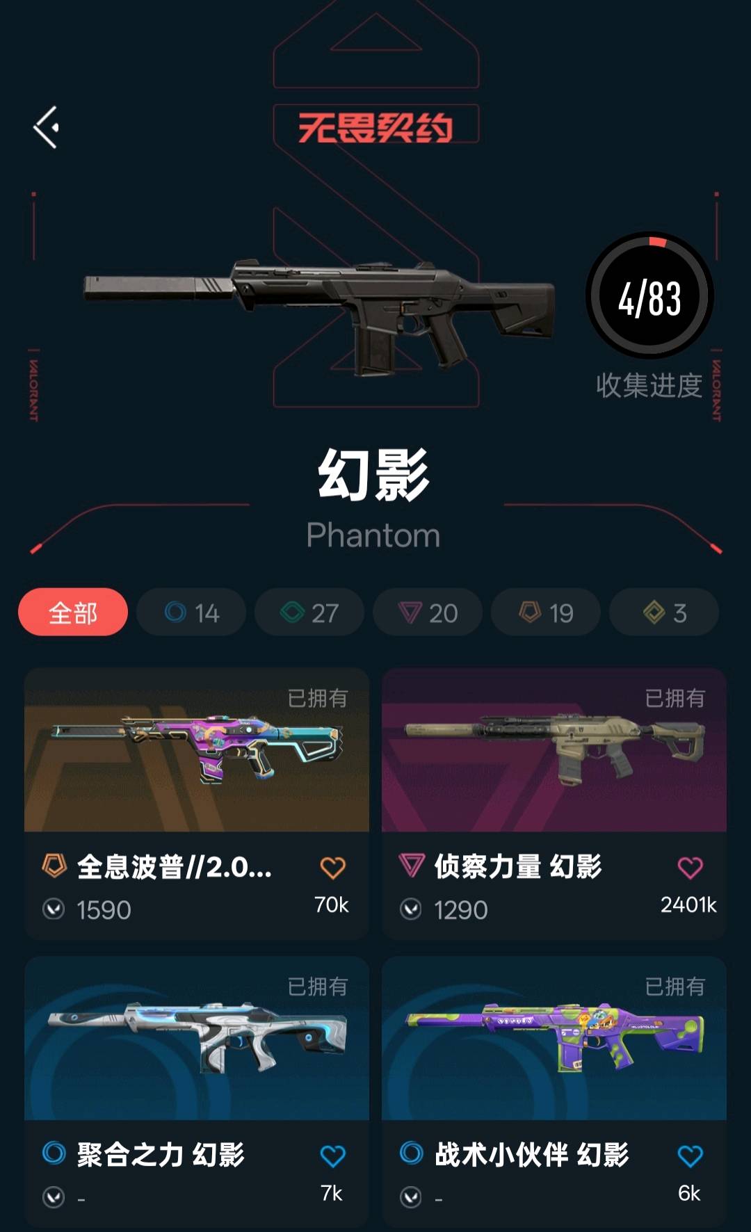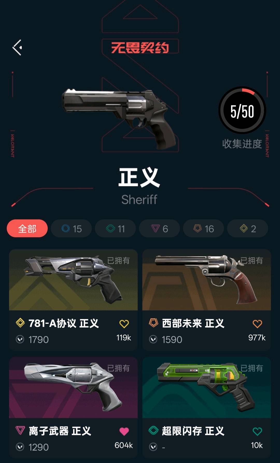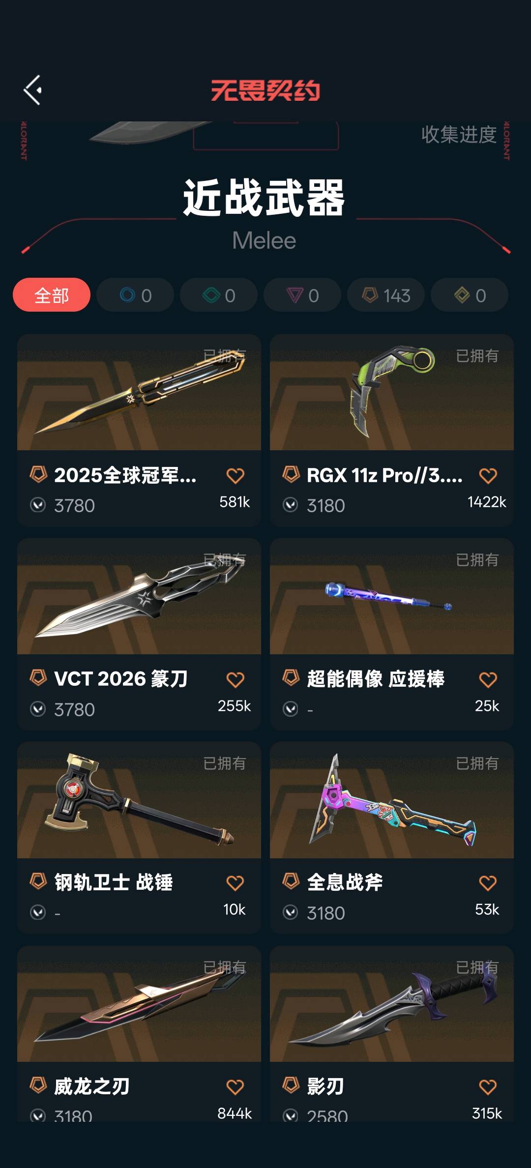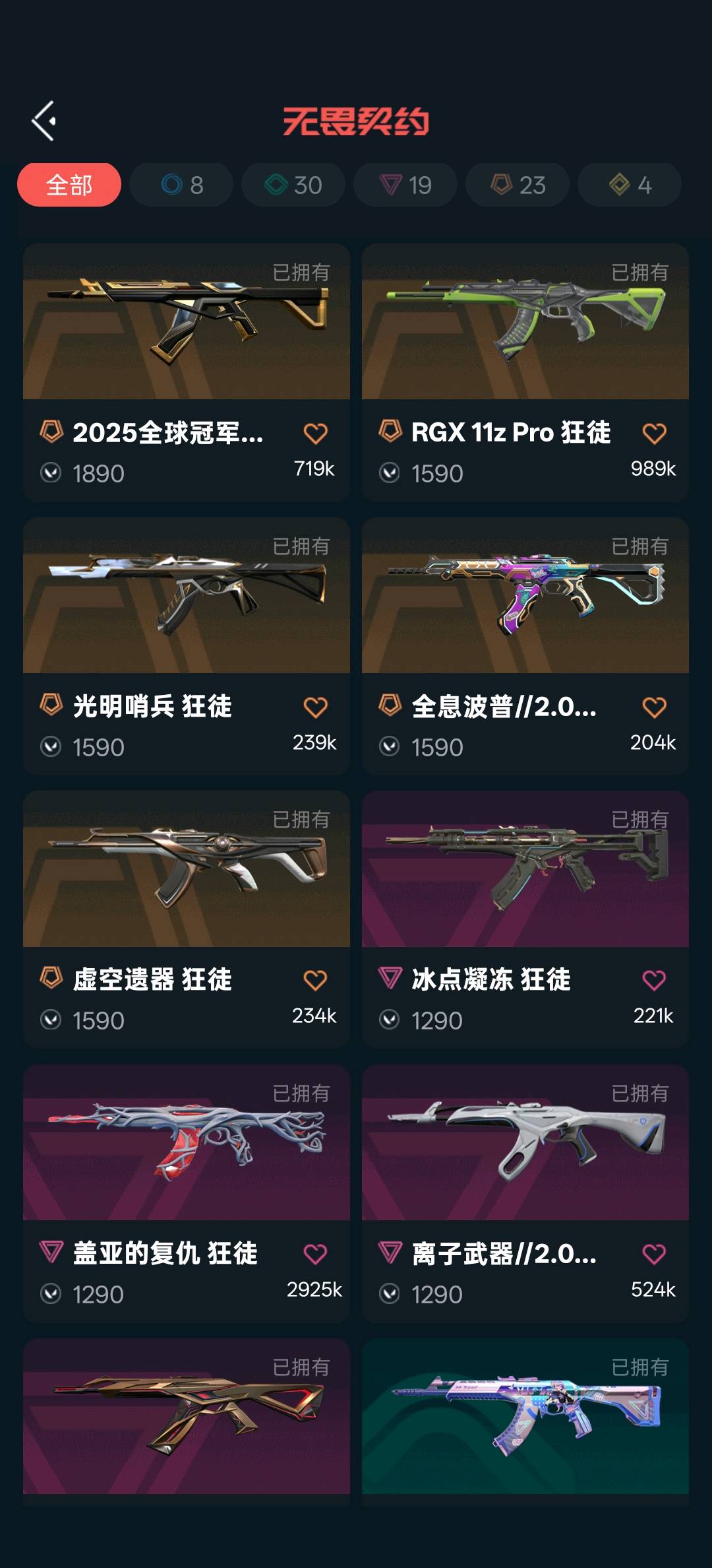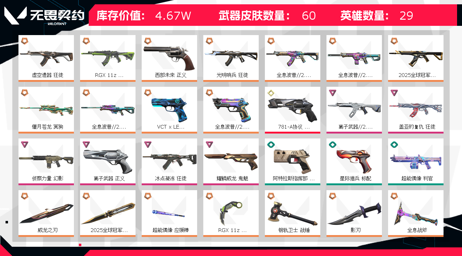 狂徒:25ak,显卡,光明哨兵,全系波普,虚空遗器,冰点凝冻,盖亚,离子,威龙 幻影:全系波普,侦查力量 近战武器:26篆刀,25蝴蝶刀,影刃,显卡爪刀,全息战斧,威龙之刃 正义:离子,781,边陲 鬼魅:威龙;威龙之刃,盖亚的复仇 狂徒,虚空遗器 狂徒,侦察力量 幻影,RGX 11z Pro 狂徒,离子武器//2.0 狂徒,西部未来 正义,
