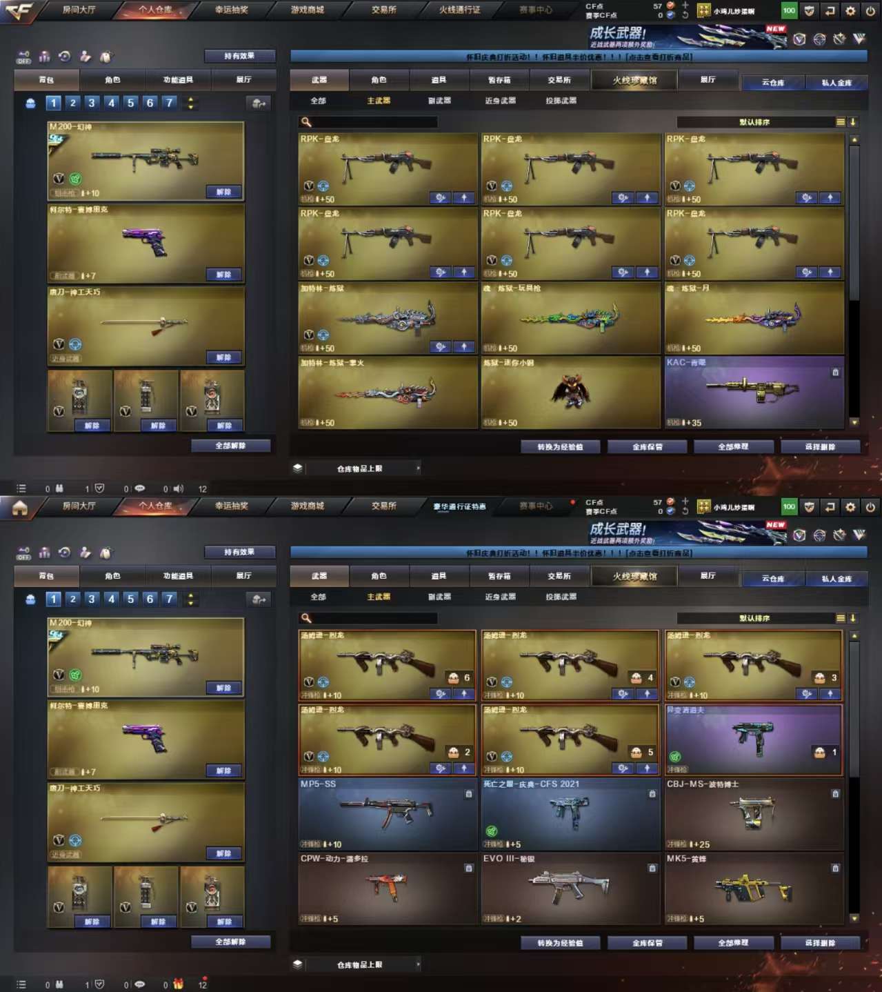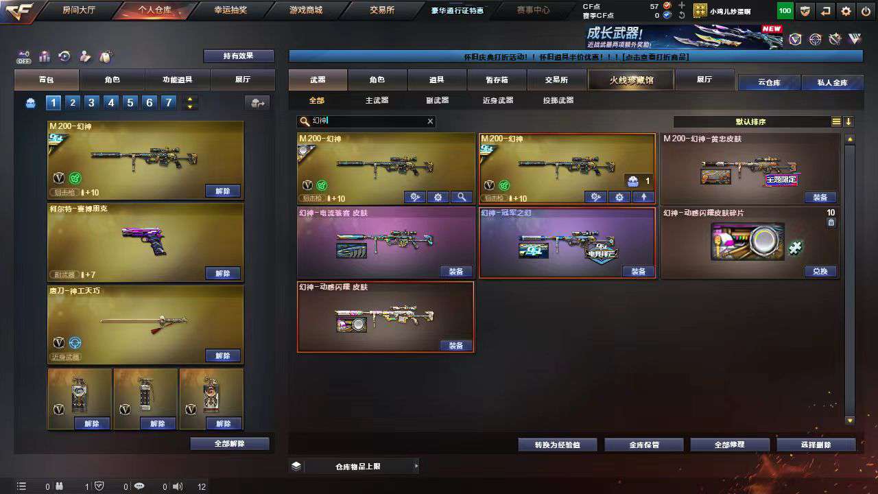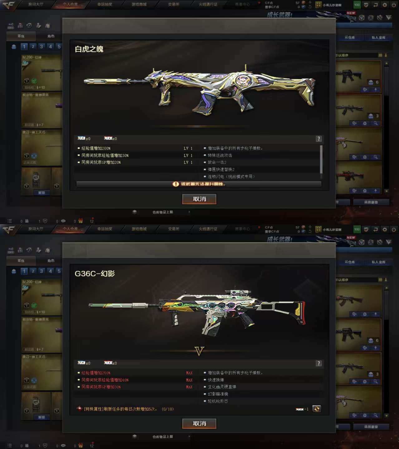 南部双幻神四皮肤,G36幻影,白虎之魄,朱雀,QBZ,毁灭冠军三件套,柯尔特,六烈盘清道夫小刚,机械猎手皮肤,5个四防