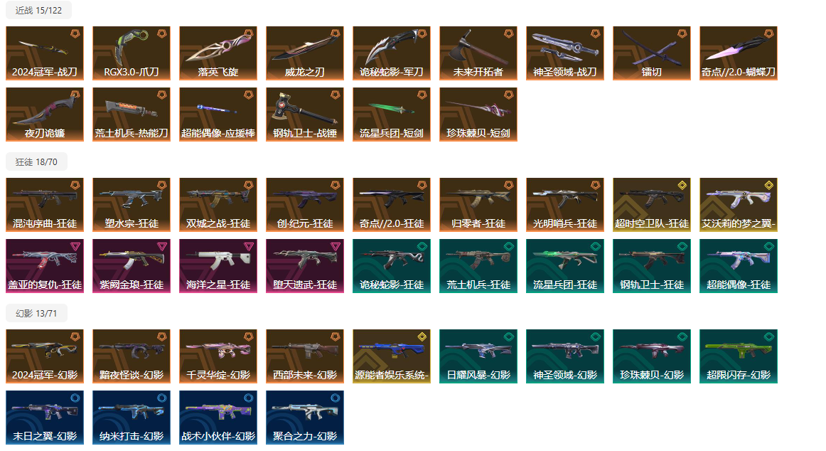 【拥有套装】西部未来套装(西部未来-幻影,西部未来-奥丁,西部未来-飞将,西部未来-正义,未来开拓者)创纪元套装(创·纪元-狂徒,创·纪元-莽侠,创·纪元-骇灵,创·纪元-正义,镭切)千灵华绽套装(千灵华绽-幻影,千灵华绽-冥驹,千灵华绽-判官,千灵华绽--正义,落英飞旋)黯夜怪谈套装(黯夜怪谈-幻影,黯夜怪谈-獠犬,黯夜怪谈-飞将,黯夜怪谈-标配,夜刃诡镰)奇点2.0套装(奇点//2.0-狂徒,奇点//2.0-鬼魅,奇点//2.0-蝴蝶刀)2024全球冠军赛套装(2024全球冠军赛-幻影,2024全球冠军赛-战刀)RGX-11z-Pro//3.0套装(RGX-11z-Pro//3.0-莽侠,RGX-11z-Pro//3.0-正义,RGX-11z-Pro//3.0-爪刀)
