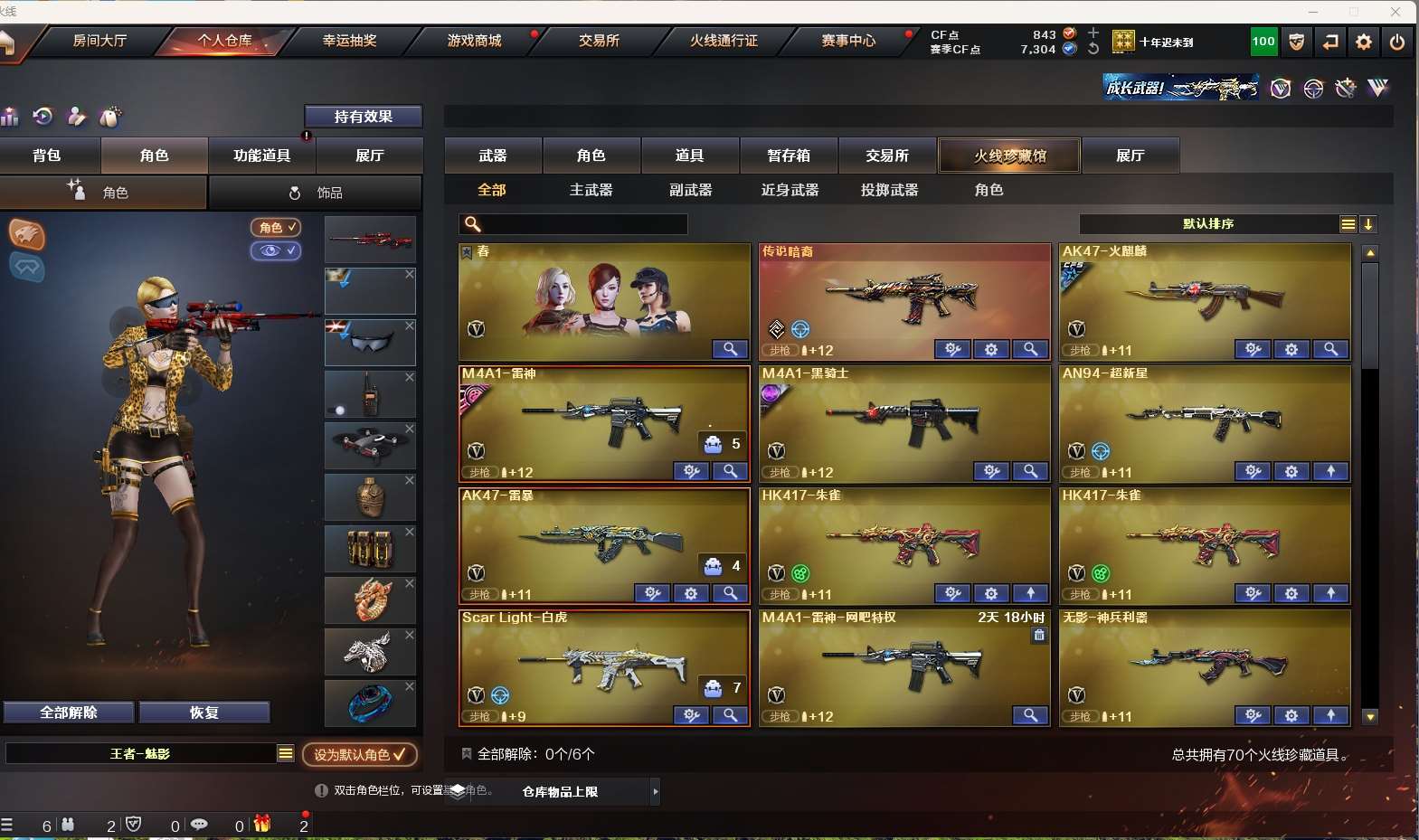 【m200-幻神+幻神-ag17冠军】 【传说暗裔】 【白虎】 【qbz金色蔷薇】 【雷暴套】 【火麒麟】 【雷神+音效卡+雷神-宠儿】 【黑骑士+音效卡+黑骑士-马超】 【毁灭+音效卡】 【极光】 【裁决】 【王者之心 王者之势 王者炎心 王者火魄】 【超新星 hk417-朱雀】 【生化 6盘龙 炼狱 5烈龙 蝴蝶】 【6手呛 修罗*5 usp雷暴】 【9近战 屠龙*2 龙啸*2 擎天 麒麟刺 斩神刀雷暴 王者之锋】 【手雷 雷暴雷*7】 【四防 王者魅影 职业经理】 【角色 春 奇洋探员 乔伊教练 修道士 云海玲珑】;USP-雷暴,RPK-盘龙,QBZ03-金色蔷薇,M200-幻神,Scar Light-白虎,传说暗裔,