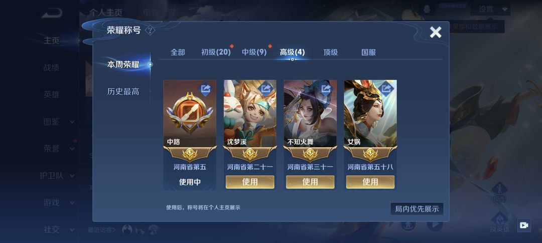 立即租号首页 > 租号大厅 > 王者荣耀 > 标题写明区服/QQ > 本周在榜省标沈梦溪火舞女娲⭐巅峰1500⭐70段全国中路⭐历史大国服杨玉环貂蝉弈星