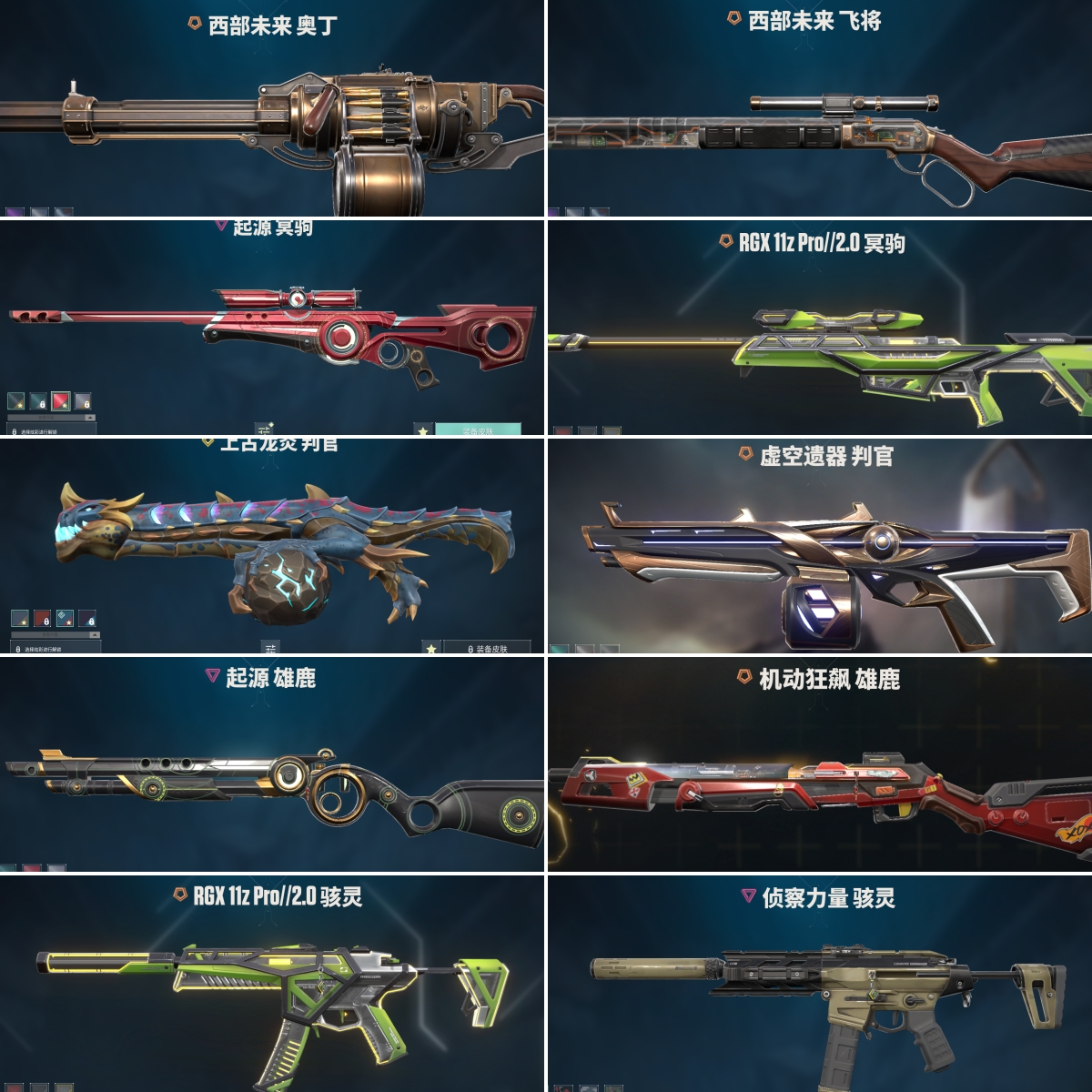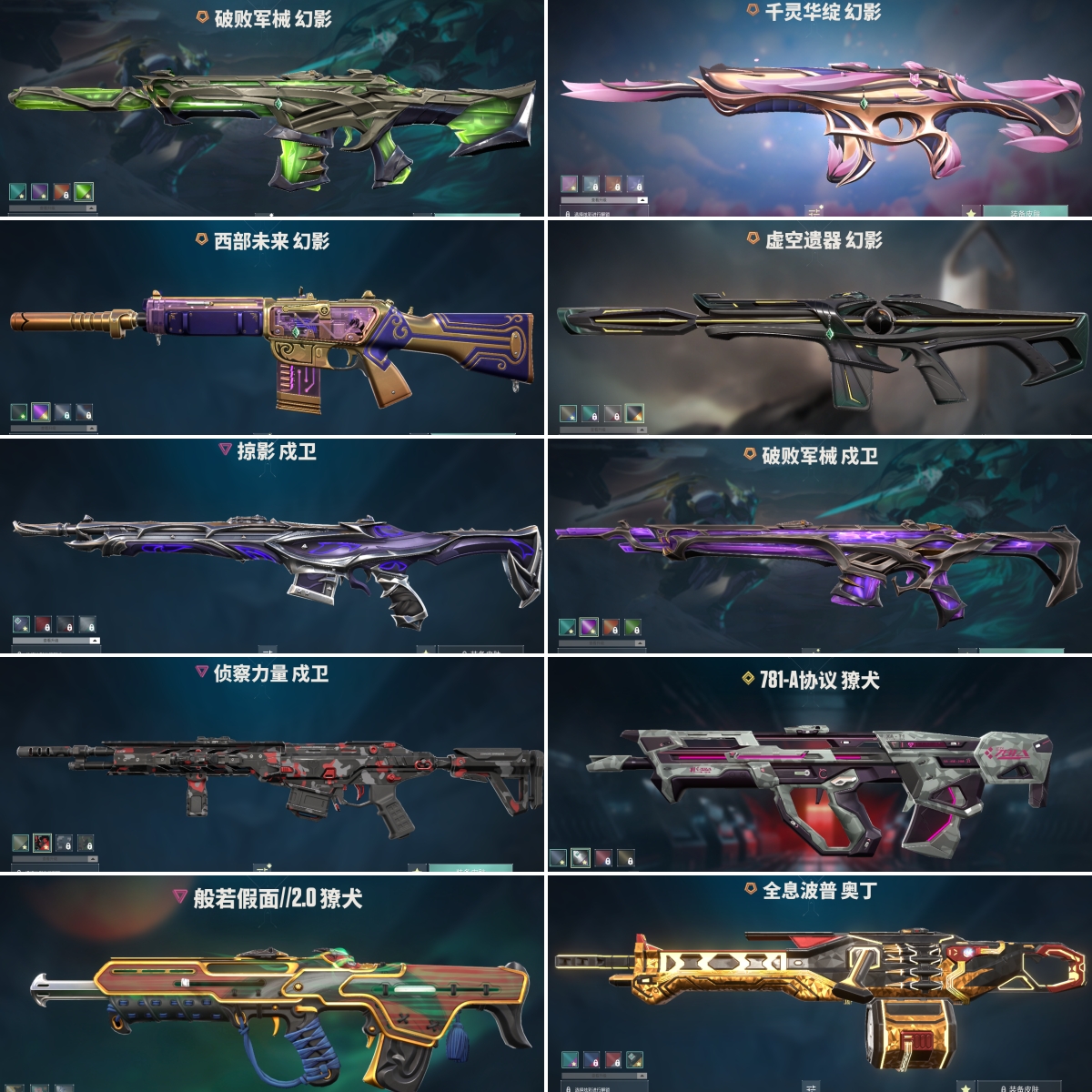 【拥有步枪】光荣异象-狂徒,RGX-11z-Pro-狂徒,双城之战-狂徒,千灵华绽-幻影,破败军械-戍卫,破败军械-幻影,全息波普//2.0-狂徒,砰砰X特攻队-幻影,781-A协议-獠犬,离子武器//2.0-狂徒,海洋之星//2.0-幻影,堕天遗武-狂徒,盖世英雄-狂徒,紫阙金琅-狂徒,盖亚的复仇-狂徒,侦察力量-戍卫,海洋之星-狂徒,日冕雄师-狂徒,掠影-戍卫,日耀风暴-幻影,诡秘蛇影-狂徒,神圣领域-獠犬,神圣领域-幻影,荒土机兵-狂徒,流星兵团-狂徒,珍珠棘贝-幻影,珍珠棘贝-戍卫,钢轨卫士-狂徒,钢轨卫士-戍卫,沙尘幻旅-狂徒,噬源兽防卫工程-幻影,弧光异彩-獠犬,弧光异彩-狂徒,幻语魔咒-獠犬,甜蜜战术-戍卫,末日之翼-幻影,折光棱晶-戍卫,月球哨兵-戍卫,纳米-幻影,逆冲蛮牛-戍卫,逆冲蛮牛-獠犬,战术熊与伙伴们-戍卫,复古浪潮-獠犬,战术小伙伴-獠犬,战术小伙伴-幻影,沙场老兵-戍卫,萌彩剪影-戍卫,胡桃狂想-獠犬,彩梦之城-戍卫,