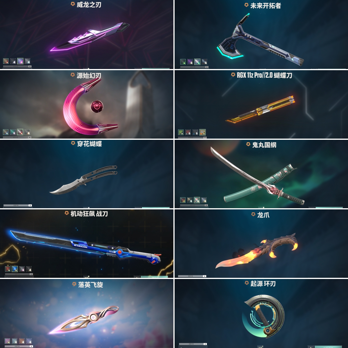 【拥有近战武器】日耀风暴-遗器,诡秘蛇影-军刀,神圣领域-战刀,荒土机兵-热能刀,流星兵团-短剑,珍珠棘贝-短剑,钢轨卫士-战锤,沙尘幻旅-匕首,弧光异彩-军刀,澄湖滟,落英飞旋,RGX-11z-Pro//3.0-爪刀,剥皮小刀,穿花蝴蝶,