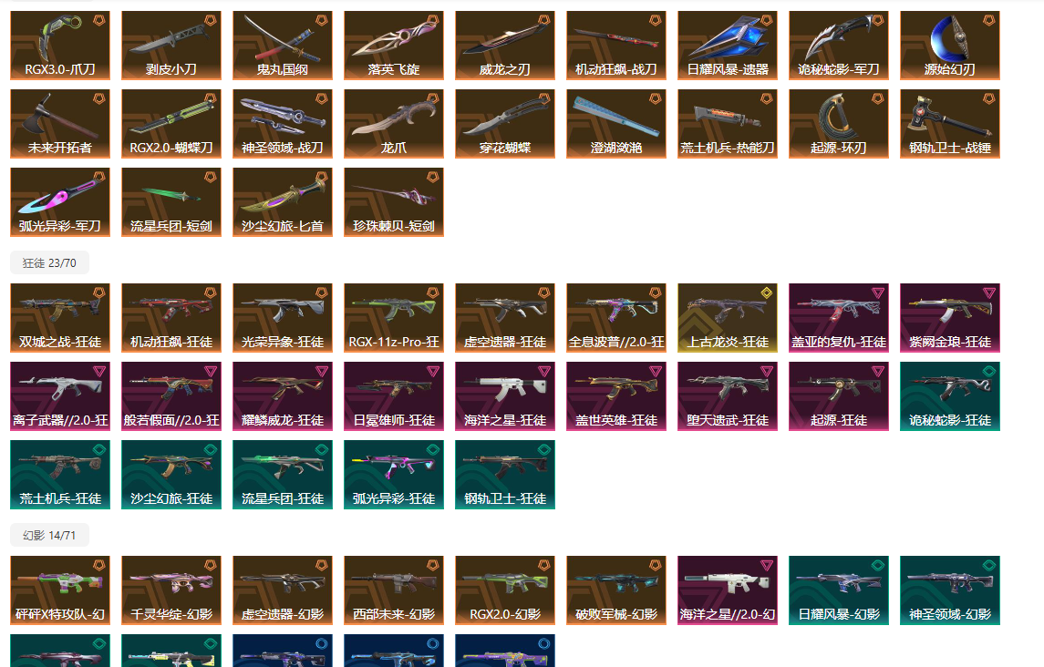 【拥有套装】虚空遗器套装(虚空遗器-狂徒,虚空遗器-幻影,虚空遗器-判官,虚空遗器-正义,源始幻刃)西部未来套装(西部未来-幻影,西部未来-奥丁,西部未来-飞将,西部未来-正义,未来开拓者)上古龙炎套装(上古龙炎-狂徒,上古龙炎-冥驹,上古龙炎-判官,上古龙炎-狂怒,龙爪)般若假面2.0套装(般若假面//2.0-狂徒,般若假面//2.0-獠犬,般若假面//2.0-战神,般若假面//2.0-狂怒,鬼丸国纲)机动狂飙套装(机动狂飙-狂徒,机动狂飙-蜂刺,机动狂飙-雄鹿,机动狂飙-正义,机动狂飙-战刀)起源套装(起源-狂徒,起源-冥驹,起源-雄鹿,起源-狂怒,起源-环刃)耀鳞威龙套装(耀鳞威龙-狂徒,耀鳞威龙-鬼魅,威龙之刃)