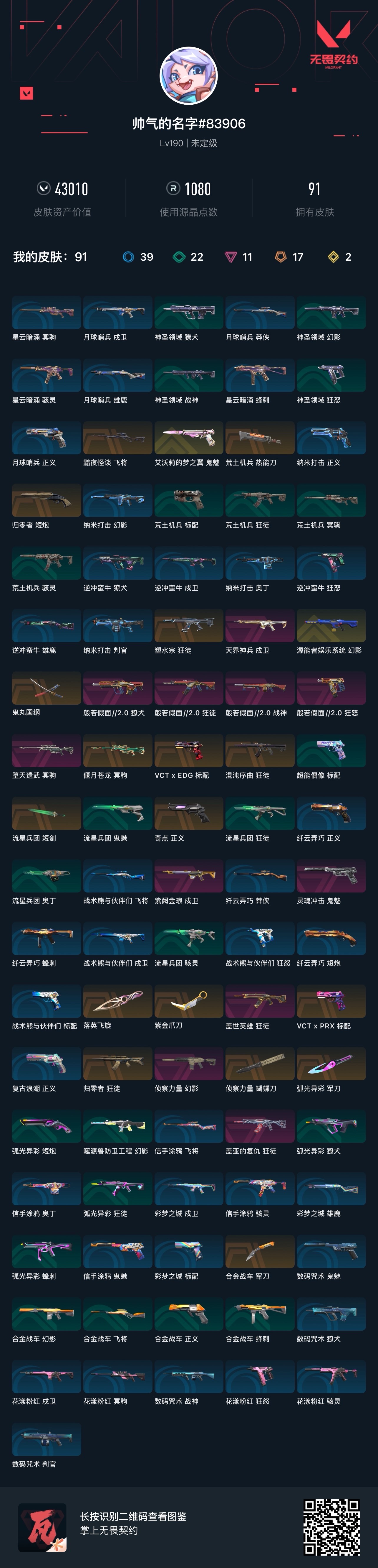首页 > 租号大厅 > 无畏契约-wegame > wegame/wegame > 4.3w艾茉莉/龙狙/双标配/紫爪刀/蝴蝶刀/假面套/飞旋/鬼丸/混沌塑水归零盖亚英雄狂徒/侦查幻影