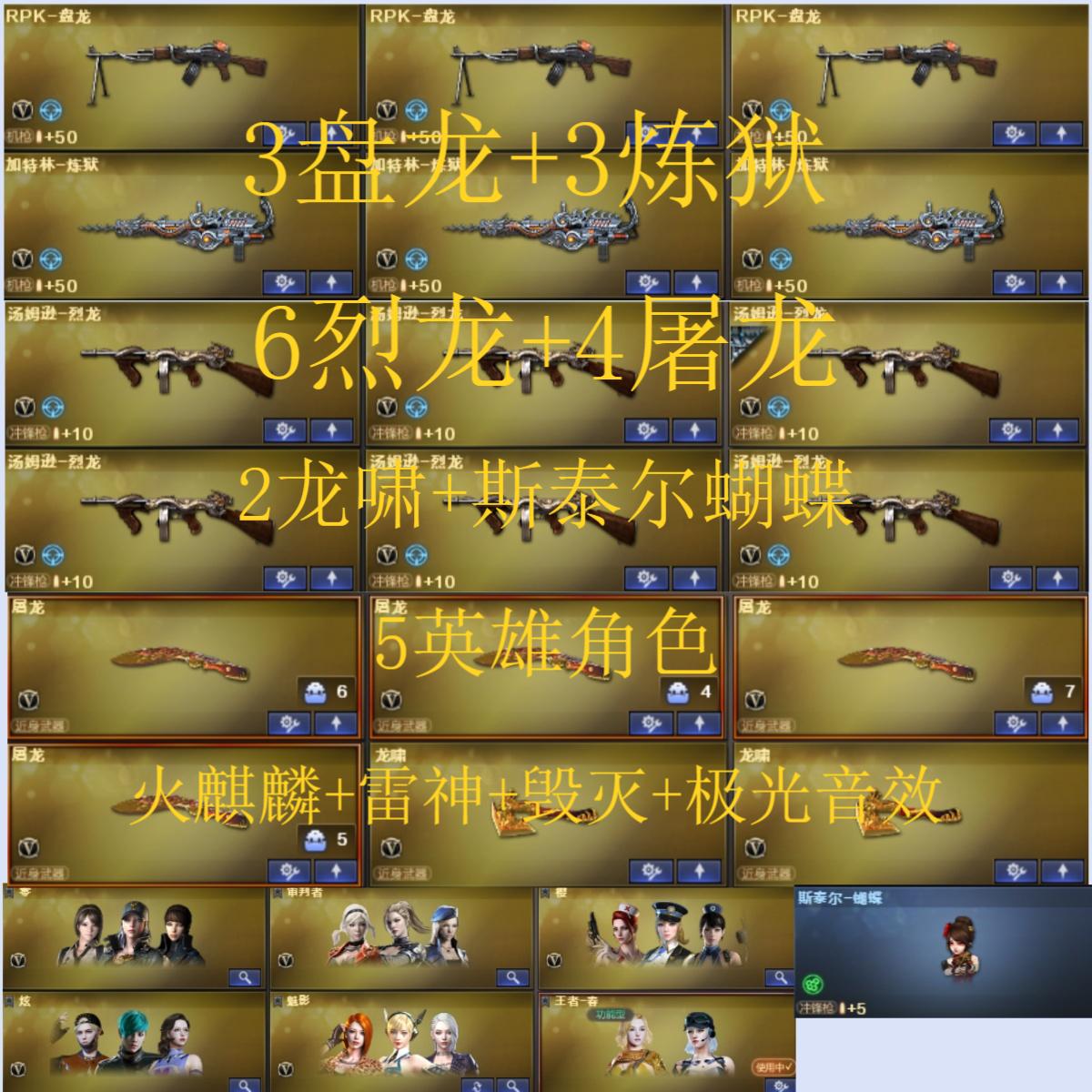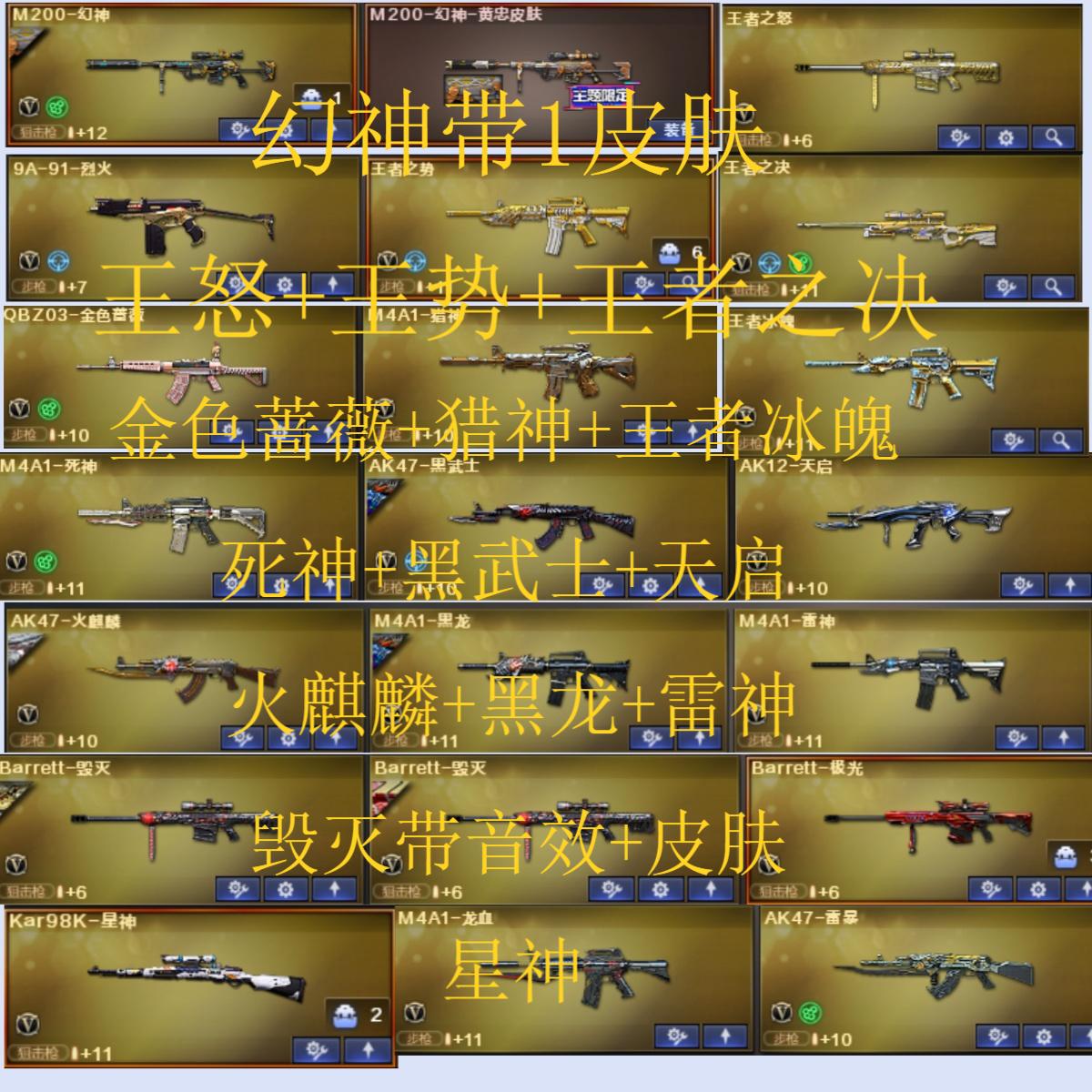 130V10王者7炫金可排位/M200幻神+幻神-黄忠皮肤/98K星神/雷暴套装+6套雷暴雷/武圣套装/6把QBZ03-金色蔷薇/7屠龙/6龙啸/3盘龙3炼狱6烈龙+斯泰尔蝴蝶/【四防】王者春/毁灭音效卡/雷神音效卡/极光音效卡/火麒麟音效卡/毁灭耀金/雷神-暗月/雷神星空/毁灭星空/毁灭-AG-CFPLS15冠军/雷神-传奇N9/毁灭-SV-CFPLS16冠军/天龙传奇70KG/黑龙361/火麒麟华夏之心/雷神-白鲨-CFPLS14冠军/火麒麟轻羽/火麒麟灵狐/天龙曼陀罗/神圣爆裂者3/巨龙咆哮3/王者之心/王者之翼/王者冰魄觉醒/王者之势觉醒/王者之决觉醒/王者之力/王者之怒觉醒/王者之锋觉醒/炫金黑龙/炫金雷神/炫金骑士/炫金毁灭/炫金天龙/零/审判者/樱/炫/魅影/【长时效】烟雾保护头盔+闪光护目镜/AG战队炫彩背包/超级背包3-7/永久防弹衣+永久防弹头盔+永久C4工具钳;USP-雷暴,RPK-盘龙,QBZ03-金色蔷薇,M200-幻神,Kar98K-星神,