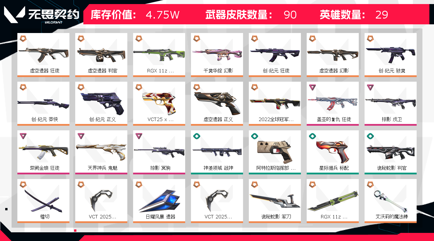 首页 > 租号大厅 > 无畏契约-wegame > wegame/wegame > 22冠军套🔥25vct爪刀🔥仙女棒💗镭切太刀🔥莲花幻影🔥虚无套🔥创纪元套🔥紫金盖亚狂徒