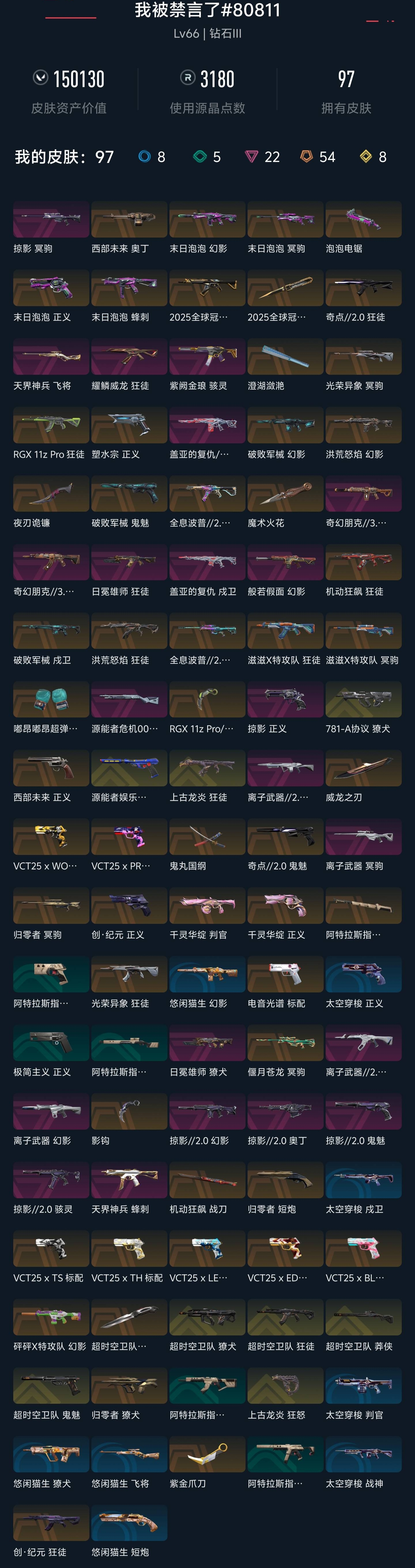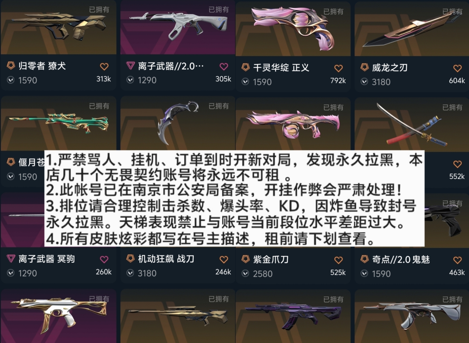 骂人挂机零容忍,发现永久拉黑,永不恢复。 秒解冻,首次登录失败后请在平台发起号主协助并立即尝试第二遍登录。(敏感操作容易导致账号突然冻结) 此号已使用源晶点数(R点):3180R 现在挂机会直接禁赛7天!请及时续租不要挂机,如果到时不下线,下一个租客会挤号导致挂机,所以请及时续租,导致禁赛的一律永久拉黑。 炸鱼会封三天机械码,会导致你的设备在三天内玩不了无畏契约,下三段请控制击杀数不要超30个(黄金、铂金杀太猛也有概率封机械码),导致禁赛永久拉黑。 如遇授权异常下架请及时维权撤单,等待两分钟后会重新上架。 禁止挂机逃跑!禁止骂人!到时后严禁再开游戏,发现永久拉黑。请合理控制炸鱼力度,不然会被别人举报禁赛,你自己的电脑也会被封机械码几天玩不了瓦,被禁赛累计3次的租客会被我永久拉黑。请合理控制租号时长,以免被后续租客顶号。此帐号已在南京市公安局备案,封号时长超过30天会联系警方严肃处理!封号一个月赔偿金额2580元起步,封号三个月赔偿金额7740元起步。 骂人si全家,发现永久拉黑,你跪着求我也不会给你解开,本店24h全程检查违规行为。被拉黑者将无法游玩本店的所有高性价比账号。如果被禁言请和好友通过其它软件语音聊天。 请不要使用拓展坞和yun电脑进行游戏,会被禁赛和封机械码。 喜欢的可以收藏,此号后续会持续氪金。有任何问题可以通过掌瓦留言咨询。 遇到无法登录等问题及时去号主通道加急处理 恶意退排位恶意无理由撤单一律黑名单【店铺所有账号均于南京市网监局备案虚拟财产,开挂/鼠标宏/恶意卡BUG等毁号行为,直接联合本平台提供详细信息邮寄律师函!必追责原价赔偿! 狂徒:2025全球冠军赛狂徒满级(25冠军狂徒)/奇点狂徒4级全炫彩/滋滋X特攻队狂徒4级全炫彩/洪荒怒焰狂徒4级钴蓝炽金(流脓狂徒)/RGX 11z Pro狂徒满级黄色(显卡狂徒)/耀鳞威龙狂徒4级银色/全息波普狂徒4级红色(电幻狂徒)/创纪元狂徒4级全炫彩(EXO狂徒)/光荣异象狂徒全炫彩/日冕雄狮狂徒满级全炫彩(狮子狂徒)/离子武器狂徒4级全炫彩(离子狂徒)/机动狂飙狂徒4级糖果粉深钴蓝(摩托狂徒)/上古龙炎狂徒4级暗色/超时空卫队狂徒4级全炫彩 近战武器:2025全球冠军赛蝴蝶刀满级(25冠军蝴蝶刀)/泡泡电锯2级/魔术火花2级全炫彩(电工钳/电光刃)/RGX11zPro爪刀2级全炫彩(显卡爪刀)/威龙之刃2级全炫彩/鬼丸国纲2级全炫彩/紫金爪刀2级/影钩2级全炫彩(掠夺爪刀)/夜刃诡镰2级黑色(古神镰刀)/澄湖恋滟2级暗色(太极扇/鱼扇)/机动狂飙战刀2级全炫彩(摩托直刀)/超时空卫队三棱军刺2级全炫彩/嘟昂嘟昂超弹力水球拳套2级全炫彩 幻影:末日泡泡幻影4级黄色/洪荒怒焰幻影4级钴蓝(流脓幻影)/般若假面幻影4级飞燕落花(恶鬼幻影)/离子武器幻影4级(离子幻影)/掠影幻影4级红色白色(掠夺幻影)/砰砰X特工队幻影4级全炫彩(玩具幻影) 鬼魅:奇点鬼魅4级蓝色/破败军械鬼魅4级紫色/掠影鬼魅4级白色(掠夺鬼魅)/源能者娱乐系统鬼魅4级全炫彩(电玩鬼魅)/超时空卫队鬼魅4级全炫彩 正义:塑水宗正义4级白色/末日泡泡正义4级黄色/千灵华绽正义4级全炫彩(莲花正义)/西部未来正义4级全炫彩(西部正义)/掠影正义4级白色(掠夺正义)/创纪元正义4级粉色 标配:电音光谱标配4级/VCT25xBLG标配满级/VCT25xEDG标配满级/VCT25xTS标配/VCT25xTH标配/VCT25xLEV标配/VCT25xPRX标配/VCT25xWOL标配 冥驹:滋滋X特攻队4级全炫彩/偃月苍龙冥驹4级萤白(玉龙冥驹)/离子武器冥驹4级(离子冥驹)/归零者冥驹4级黑色(异星冥驹)/全息波普冥驹 戍卫:破败军械戍卫4级紫色红黄/盖亚的复仇戍卫 獠犬:归零者獠犬4级黑色银色(异星獠犬)/781-A协议獠犬满级粉白/超时空卫队獠犬4级黑色 莽侠:超时空卫队莽侠4级金色 骇灵:掠影骇灵4级红色(掠夺骇灵) 判官:千灵华绽判官4级紫色(莲花判官) 蜂刺:天界神兵蜂刺4级(鎏金蜂刺) 雄鹿:源能者危机001雄鹿满级(漫画雄鹿) 奥丁:掠影奥丁4级红色(掠夺奥丁) 飞将:天界神兵飞将4级(鎏金飞将) 战神:离子武器战神4级(离子战神) 狂怒:上古龙炎狂怒4级暗色 短炮:归零者短炮4级黑色银色(异星短炮) 25冠军/奇幻朋克3.0/滋滋特攻队/超时空卫队/掠夺2.0;西部未来 奥丁,紫金爪刀,威龙之刃,归零者 獠犬,洪荒怒焰 狂徒,洪荒怒焰 幻影,RGX 11z Pro 狂徒,