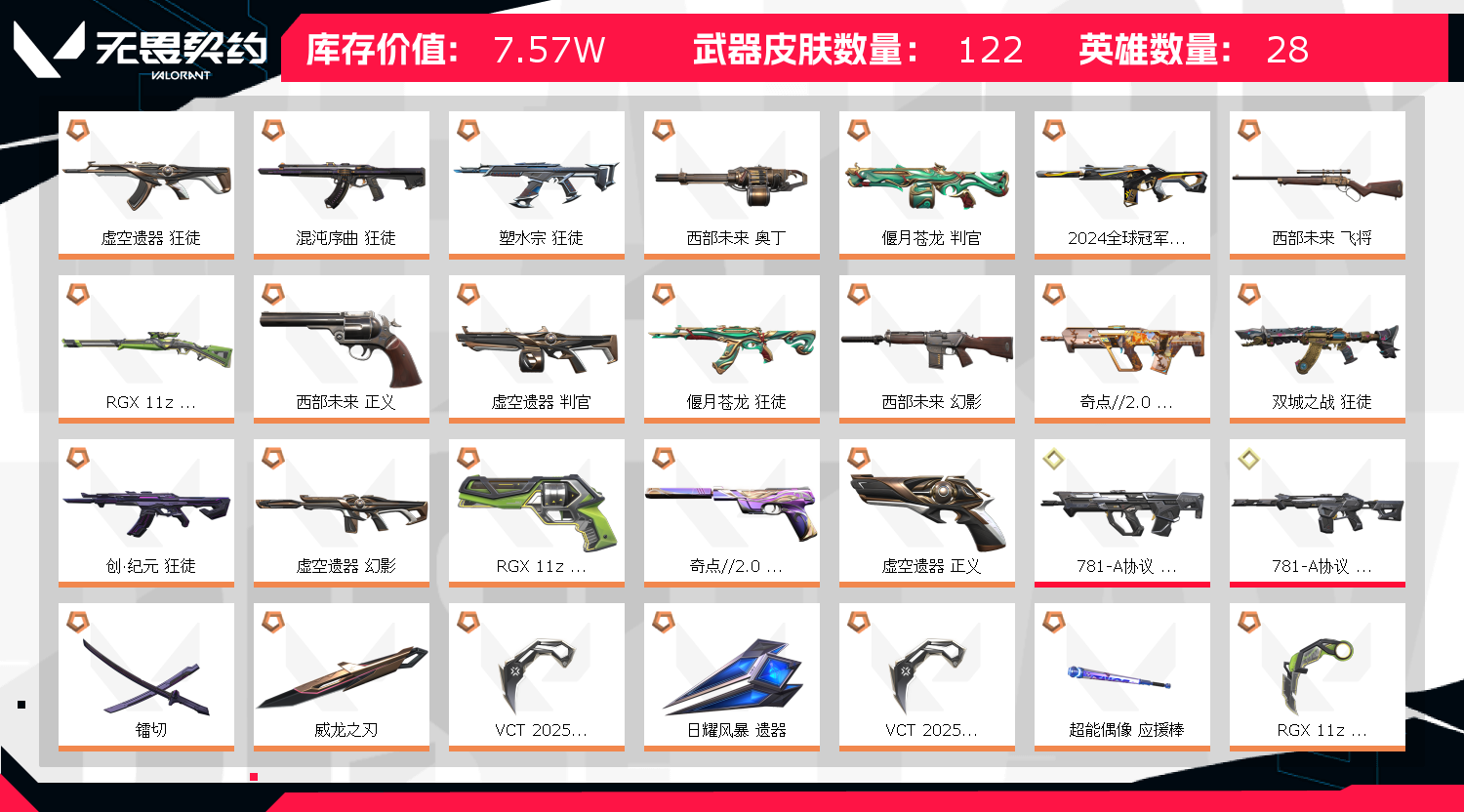 冻结请点击协助,会自动解冻,等几分钟重新登陆即可! 请勿挂机,游戏中挂机拉黑!!! 账号R点请勿使用,本店铺及时补充新套装,若使用R点无法升级新套装,攒R点辛苦,望谅解! 老板不要杀太多,现在风控的严重,杀多了会临时冻结,到时候我可能不在无法解冻!使用外挂脚本导致游戏账号封禁直接向平台提取ip地址! 本账号经过网络财产备案,一经发现直接报警处理立案追责,根据账号价值全额赔偿感谢支持谢谢合作谢谢合作!!!!禁止利用账号进行开挂、使用辅助违规软件诈骗等违规操作!;西部未来 奥丁,镭切,威龙之刃,VCT 2025 爪刀,偃月苍龙 判官,盖亚的复仇 狂徒,虚空遗器 狂徒,