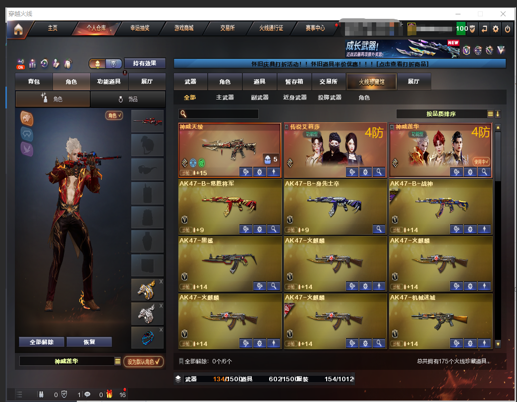 新增:新传说:幻神ZYK皮肤!幻神宠儿皮肤!星神巅峰荣耀皮肤!冠军之武!冠军之啸!火麒麟横秒之巅!神威莲华!传说艾莉莎!双斯泰尔萌兔!MAC龙宝!MAC千针棘鲨!角色:智!G36C音效卡!神威天绫!白虎三件套!G36幻影+量子聚变皮肤、双炽芒蝶刃(蝴蝶刀)【安徽一区-安徽】 166V10王者3炫金【主武器类型】 M200-幻神 Kar98K-星神 王者之怒觉醒版 Barrett-毁灭 *2 Barrett-极光 *4 Barrett-雷霆 王者冰魄觉醒版 M4A1-雷神 *2 QBZ03-金色蔷薇 M4A1-黑龙 M4A1-黑骑士 *2 M4A1-堕天神 M4A1-雷霆 M4A1-千变 M4A1-死神 AK47-火麒麟 *4 AK47-无影 AK47-黑武士 *2 AK47-黑鲨 AK47-机械迷城 AN94-超新星 汤姆逊-烈龙 *6 RPK-盘龙 *6 加特林-炼狱 AA-12-雷霆 AWM-天龙 *5 炫金毁灭 炫金黑龙 黑龙吞噬者 巴雷特-零-水下丽影 AK身先士卒 AKB-战神 AK猩红传说 *2 黑骑士海王 Barrett暗月传说 *3 Barrett金色蔷薇 试炼破坏者 死亡之眼 AK47-B十周年 黄金AK 高爆手雷竞技荣光 *2 闪光弹竞技荣光 *3 高爆手雷堕天神 *6 闪光弹堕天神 *6 烟雾弹堕天神 *6 高爆手雷雷霆 *7 闪光弹雷霆 *7 烟雾弹雷霆 *7 高爆手雷雷暴 闪光弹雷暴 烟雾弹雷暴 恶棍电竞装甲 闪光弹电竞装甲 烟雾弹电竞装甲 迷你生化手雷 【王者武器】 玫瑰精灵-悦动 【副武器类型】 COP-雷霆 COP-堕天神 *2 王者之魂觉醒版 沙鹰-修罗 *4 沙鹰-天神 *2 柯尔特-电竞装甲 炫金修罗 Cfcolt1911大黄蜂 【近身武器类型】 王者之锋觉醒版 *2 屠龙 *3 尼泊尔-雷霆 王者之啸觉醒版 龙啸 *2 龙啸-堕天神 *2 麒麟刺 *3 麒麟刺-堕天神 *2 擎天 斩神刀-雷暴 猫猫手套 军用手斧镜 夺魂 【稀有角色】 灵狐者-职业经理 王者-零-传说之路 王者玲珑-小乔 老海豹突击队 迷迭香 炫 职业选手 魅影 葵 瞳 蜀雪 狐影 影武者X 暗夜X 铁骑荣耀 幻影 堕天使 超级背包 炫彩背包 【武器皮肤及道具】 雷神-冠军之魄 雷神-白鲨-CFPLS14冠军 雷神-暗月 AK47-火麒麟-传奇EVEN 火麒麟-CFSTAR 火麒麟-AG 毁灭-AG-CFPLS15冠军 毁灭-星空 毁灭-暗月 黑龙-能量核心 无影-能量核心 天龙-CFSTAR AWM-天龙-传奇白鲨 极光-能量核心 修罗-CFSTAR 毁灭音效卡 黑骑士音效卡 【稀有套装】 堕天神套 雷霆套;炽芒蝶刃,传说艾莉莎,RPK-盘龙,QBZ03-金色蔷薇,G36C-幻影,M200-幻神,Scar Light-白虎,