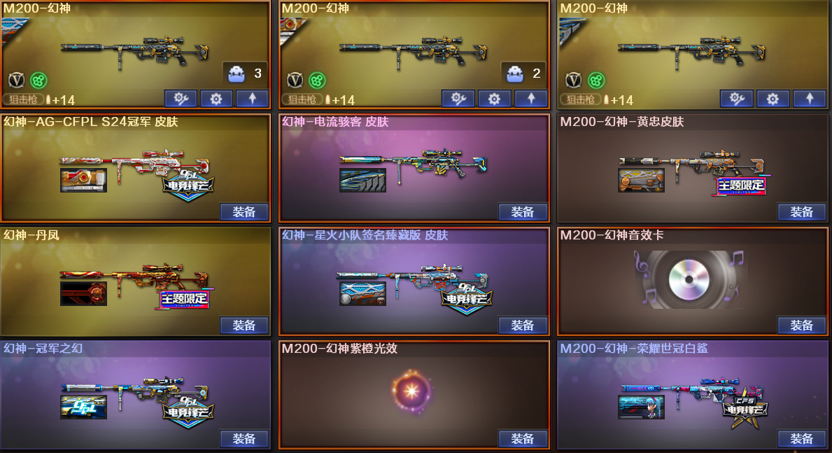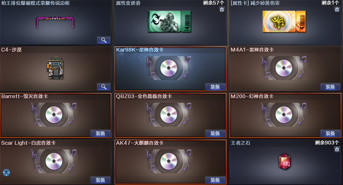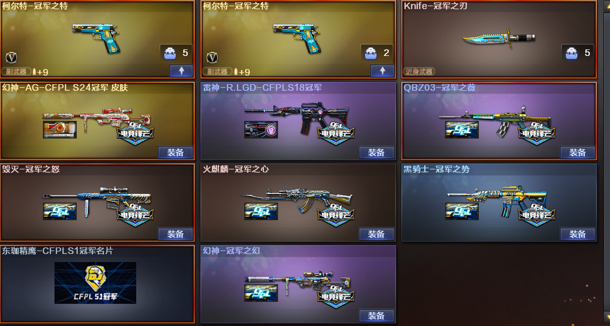 王者武器】:【炫金毁灭-1,王者之魄高爆手雷-1,高爆手雷-雷霆王者-1,王者之魄闪光弹-1,王者之魄烟雾弹-1,COP 357-雷霆王者-觉醒版-1,M4A1-雷霆王者-觉醒版-1,烟雾弹-雷霆王者-觉醒版-1,王者之烈-觉醒版-1,王者星霆-1,王者龙血-觉醒版-1,闪光弹-雷霆王者-觉醒版-1,雷霆王者之锋-觉醒版-1】 【英雄武器】:【AK12-天启-1,AN94-超新星-1,屠龙-1,麒麟刺-1,AK47-火麒麟-1,Barrett-毁灭-1,汤姆逊-烈龙-6,加特林-炼狱-1,沙鹰-天神-1,M4A1-雷神-1,M200-幻神-3,M14EBR-玄武-1,传说夜影-1,幻灵之锋-1,柯尔特-冠军之特-2,USP-神工天巧-1,炽芒蝶刃-1,高爆手雷-神工天巧-1,闪光弹-神工天巧-3,AK-47-猩红传说-1,无影-神兵利器-1,烟雾弹-神工天巧-3,QBZ03-金色蔷薇-1,传说幽瞳-1,G36C-幻影-1,手雷-动感闪耀-1,Kar98K-星神-1,黑武士-锦绣游龙-1,云龙扇-2,COP 357-云龙-1,高爆手雷-云龙-2,烟雾弹-云龙-1,闪光弹-云龙-1,AWM-裁决-1,COP 357-幻灵-1,烟雾弹-幻灵-3,传说破晓-1,闪光弹-幻灵-3,高爆手雷-幻灵-3,传说灵眸-1,Barrett-朱雀-1】 【装饰品】:【修罗-CF STAR-1,兔子泰迪娃娃-1,击杀图标-万圣-1,火麒麟-冠军之心-1,雷神-宇航兔皮肤-1,雷神-R.LGD-CFPLS18冠军-1,毁灭-冠军之怒-1,M4A1-战神赵云-1,夏日水手玩偶-1,火麒麟-心动糖果-1,黑骑士-冠军之势-1,雷神-耀金皮肤-1,屠龙-星耀 皮肤-1,QBZ03-冠军之薇-1,小兔姬玩偶-1,雷神-荣耀之魄-1,幻神-星火小队签名臻藏版 皮肤-1,M200-幻神-荣耀世冠白鲨-1,幻神-丹凤-1,幻神-冠军之幻-1,屠龙-荣耀世冠AG-1,毁灭-墨兰 皮肤-1,幻神-AG-CFPL S24冠军 皮肤-1,裁决-巅峰荣耀 皮肤-1,超新星-兔兔战士 皮肤-1,白泽玩偶-1,M200-幻神-黄忠皮肤-1】 【角色】:【金戈,堕天使,铁骑,猎狐者,潘多拉,暗夜,灵狐者,嘉年华灵狐,潘多拉-锋芒精英,木兰,传说艾莉莎,隼,炽天使,王者-零-国色天香,兔囡囡,灵动武士,王者炫,传说影煞】 【道具】:【烟雾保护头盔-1,闪光护目镜-1,防弹衣-1,防弹头盔-1,手雷包-1,C4工具钳-1,防化服-1,夺命之镰-1,变异宝贝-1,灵魂忍者-1,疯狂宝贝-1,迷雾幽灵-1,生化弹匣-1,步枪弹匣-1,机枪弹匣-1,冲锋枪弹匣-1,手枪弹匣-1,M4A1-雷神 紫橙光效-1,Barrett-毁灭音效卡-1,M4A1-雷神音效卡-1,AK47-火麒麟音效卡-1,M200-幻神音效卡-1,听风战术耳机-1,智眸战术目镜-1,小萝莉-1,QBZ03-金色蔷薇音效卡-1,Scar Light-白虎音效卡-1,绿色巨人-1,Kar98K-星神音效卡-1】;柯尔特-冠军之特,炽芒蝶刃,Knife-冠军之刃,传说影煞,隼,传说艾莉莎,QBZ03-金色蔷薇,