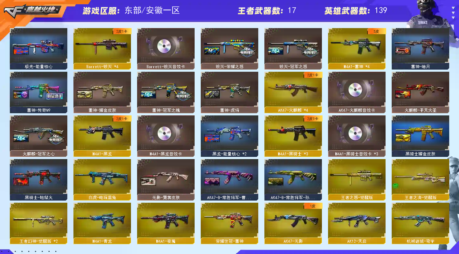 东西太多截不完,详细看描述或直接上号体验 Lv.102荣耀元帅,156V,3传说/20王者/2炫金/139英雄/CF点30202/【重要角色11】新海豹突击队/传说女帝/角色-王者玲珑/王者瞳闭月羞花/王者零传说之路/职业选手/角色-迷迭香/铁骑荣耀/零水下丽影/角色-魅影/灵狐者-职业经理【套装1】夜魔套/【传说武器2】传说圣灵/传说光耀【王者武器17】王者之决-觉醒版/王者之怒-觉醒版/王者幻神-觉醒版*2/王者之势-觉醒版/王者之城-觉醒版/王者之心-觉醒版/王者之戮*2/王者之戮-觉醒版/王者之武-觉醒版/王者之翼/王者之魄-觉醒版/王者火魄-觉醒版/王者炎心-觉醒版/王者之啸-觉醒版/王者之锋-觉醒版【炫金武器2】炫金雷神*2【热门武器35】M200-幻神*6/Cat-刀锋/HK417-朱雀*2/荣耀世冠-雷神/金色小号/异变清道夫/斯泰尔-蝴蝶/6烈龙/6盘龙/炼狱/柯尔特-冠军之特*2/4修罗/荣耀世冠-柯尔特/Knife-冠军之刃/金刚伞-电玩红兔【英雄武器136】AWM-天龙*2/AWM-裁决*4/Barrett-暗月传说/Barrett-极光*3/Barrett-毁灭*4/M200-幻神*6/9A91-烈火*3/AK-47-猩红传说*19/AK12-天启/AK47-B-常胜将军*2/AK47-B-战士/AK47-B-战神*2/AK47-无影/AK47-火麒麟*4/AK47-黑鲨*2/AN94-超新星/HK417-朱雀*2/M4A1-夜魔/M4A1-猎神/M4A1-雷神*4/M4A1-青龙/M4A1-黑骑士*3/M4A1-黑龙/M4A1-龙血/QBZ03-金色蔷薇/ScarLight-白虎/白虎-电玩蓝兔/荣耀世冠-雷神/汤姆逊-烈龙*6/RPK-盘龙*6/加特林-炼狱/AA-12-雷霆/COP-堕天神/柯尔特-冠军之特*2/沙鹰-修罗*4/破空枪刃-夜魔/荣耀世冠-柯尔特/屠龙*2/雷霆之锋/马来剑-夜魔/麒麟刺-堕天神/龙啸-堕天神/烟雾弹-堕天神*5/烟雾弹-夜魔*5/烟雾弹-雷霆/闪光弹-堕天神*5/闪光弹-夜魔*5/闪光弹-雷霆/高爆手雷-堕天神*5/高爆手雷-夜魔*5/高爆手雷-雷霆【热门皮肤26】无影-霓裳/雷神耀金/黑骑士耀金/烈龙-星空/屠龙-荣耀之锋/雷神-传奇N9/雷神-虎将/毁灭-荣耀之怒/幻神-冠军之幻/雷神-冠军之魄/黑骑士-地狱火/毁灭-冠军之怒/火麒麟-冠军之心/白虎-电玩粉兔/巴雷特-毁灭-CFPL冠军/QBZ03-冠军之薇/幻神-巅峰荣耀/火麒麟-平天大圣/火麒麟-CFSTAR/AWM-天龙-传奇70KG/AWM-天龙-传奇白鲨*2/天龙-CFSTAR/M4A1-雷神-白鲨/火麒麟-AG/巴雷特SV【人偶武器9】巴雷特-零-水下丽影/毁灭-孙三炮/王者Barrett-英勇金戈/Cat-刀锋/火麒麟-灵狐/斯泰尔-蝴蝶/M37-葵/迷你生化手雷/闪光弹-小乔【暴走生化武器14】异变清道夫/斯泰尔-蝴蝶/汤姆逊-烈龙*6/RPK-盘龙*6【挑战武器5】M4A1-黑骑士*3/乱世-超越3/VEPR-12-金魔【音效卡武器7】M4A1-黑骑士音效卡/M200-幻神音效卡/M4A1-黑骑士音效卡/M4A1-黑龙音效卡/M4A1-黑骑士音效卡/AK47-火麒麟音效卡/Barrett-毁灭音效卡【普通皮肤6】AK47-B-常胜将军-孙权/AK47-B-常胜将军-曹操/黑龙-能量核心*2/雷神-暗月/极光-能量核心【光效14】屠龙-流星光效/M4A1-黑骑士紫色光效/AN94-超新星蓝色光效/沙鹰-修罗蓝色光效/AWM-天龙蓝色光效/王者之啸金色光效/沙鹰-修罗金色光效/Barrett-毁灭金色光效/王者之魄金色光效/沙鹰-修罗蓝色光效/王者之锋金色光效/M4A1-雷神金色光效/王者之怒金色光效/M4A1-雷神金色光效【玩偶19】幸运牛仔玩偶/蛇隐宗玩偶/摇滚暗灵玩偶/幸运牛仔玩偶/CFS纪念版人偶/胡司令玩偶/王者刀锋玩偶/蓝色艾比玩偶/猫头鹰玩偶/深渊黑龙玩偶/幸运鼠玩偶/深渊黑龙玩偶/深渊黑龙玩偶/关羽玩偶/恐惧玩偶装饰/保卫者玩偶装饰/潜伏者玩偶装饰/熬丙玩偶/哪吒玩偶【戒指武器13】29赛季纪念戒指-耀金(拇指)/29赛季纪念戒指-耀金(拇指)/23赛季纪念戒指-耀银(拇指)/22赛季纪念戒指-耀银(拇指)/21赛季纪念戒指-耀银(拇指)/20赛季纪念戒指-耀金/18赛季纪念戒指-耀金/17赛季纪念戒指-耀金/银蛇戒/金蛇戒/16赛季纪念戒指-枪王耀金/龙眼(死神)/龙眼(鹰)【背包7】AG战队炫彩背包/超能女侍背包/KZ战队炫彩背包/冰龙尾巴背包-金/超级背包/万圣节背包2019/京剧背包【击杀图标7】灵花击杀图标/排位23赛季击杀图标1/电玩兔兔击杀图标/排位20赛季击杀图标2/CFS击杀图标/AG战队击杀图标/R.LGD战队击杀图标【皮肤或武器可能存在时效期限性质,具体以游戏内实际拥有为主】;荣耀世冠-柯尔特,柯尔特-冠军之特,Knife-冠军之刃,传说女帝,RPK-盘龙,QBZ03-金色蔷薇,M200-幻神,