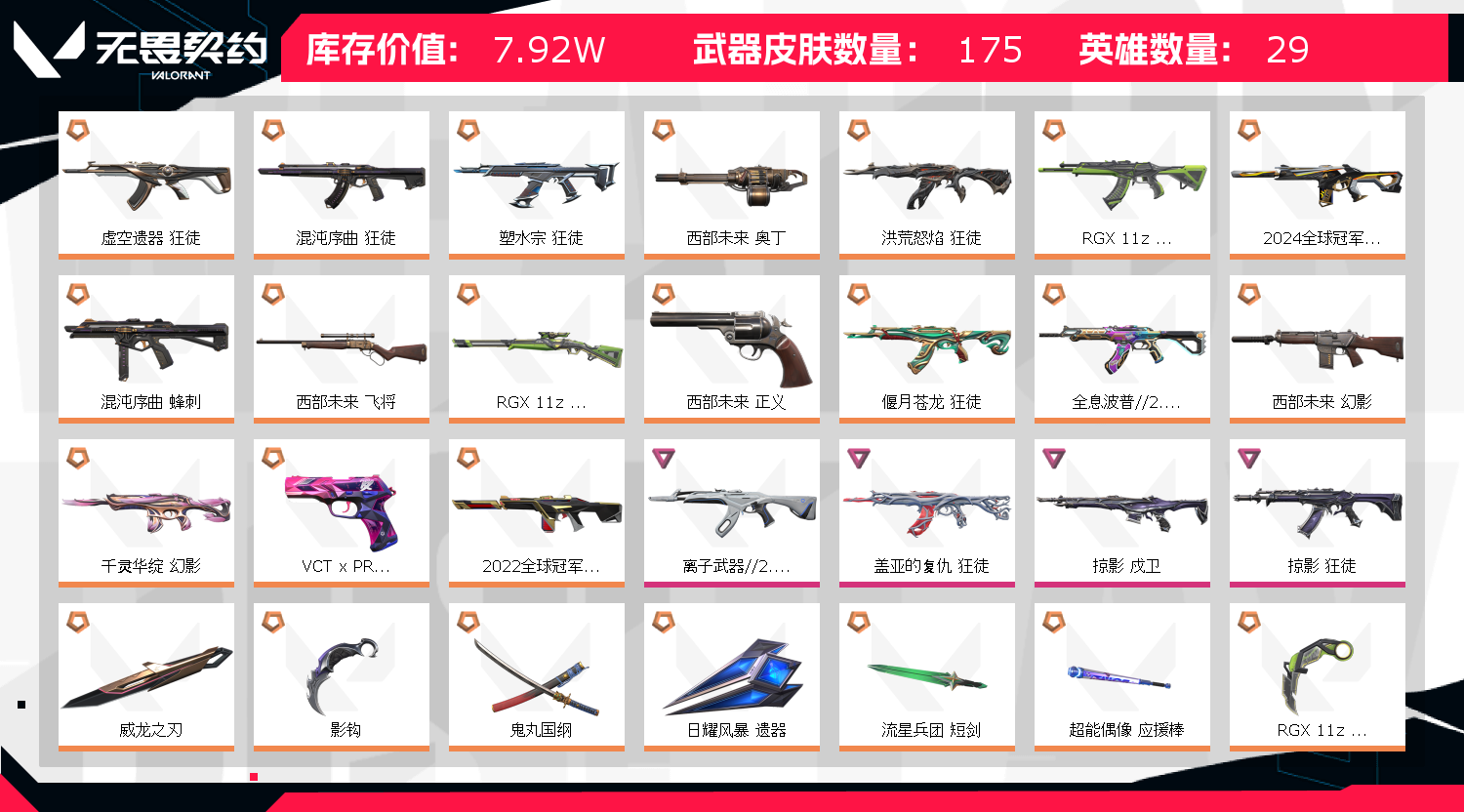 首页 > 租号大厅 > 无畏契约-wegame > wegame/wegame > 8万库存⚡22冠军24冠军套⚡极品169皮19刀⚡战刀RGX爪刀⚡盖亚混沌塑水宗⚡侦查莲花⚡西部掠影